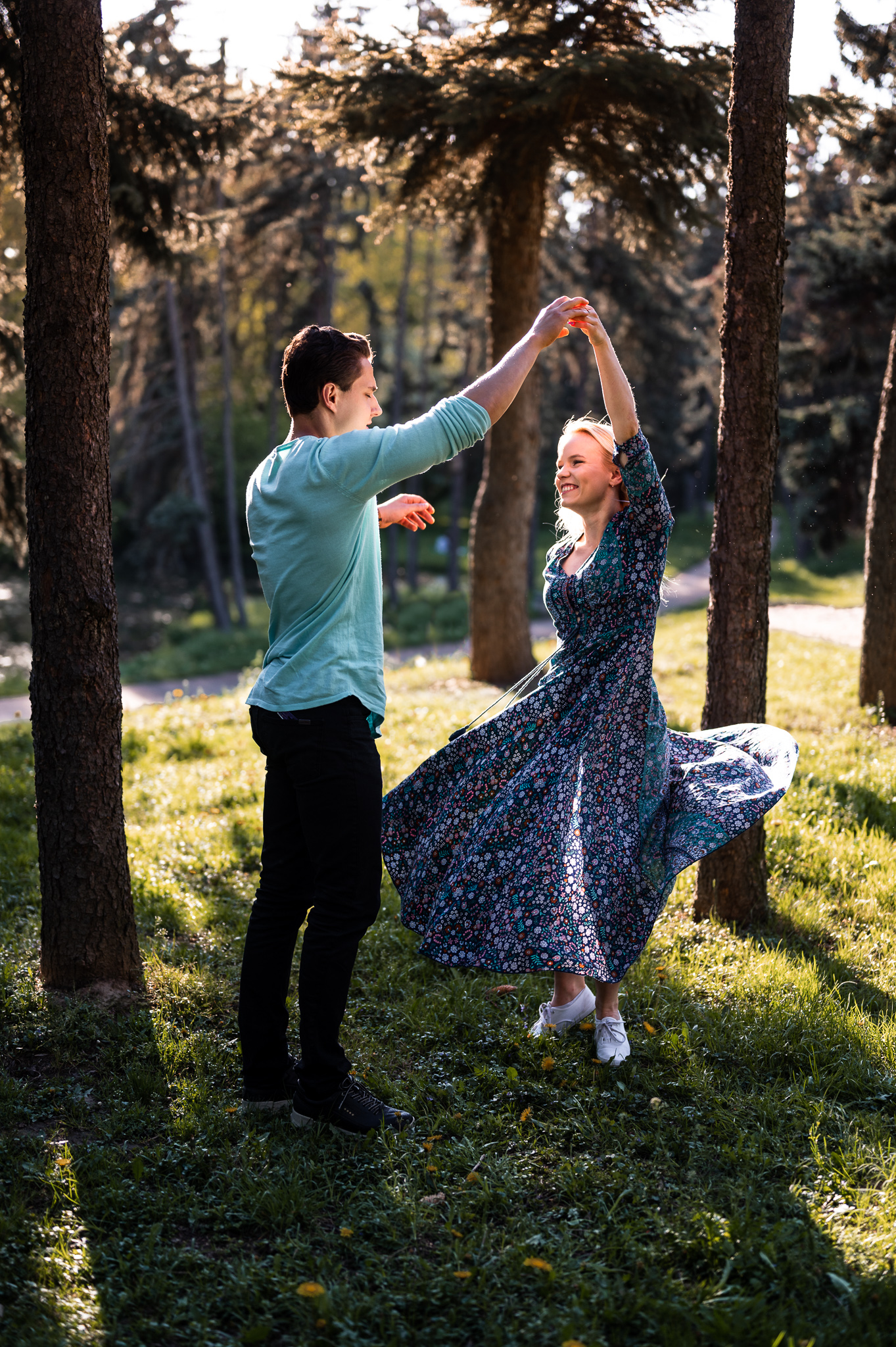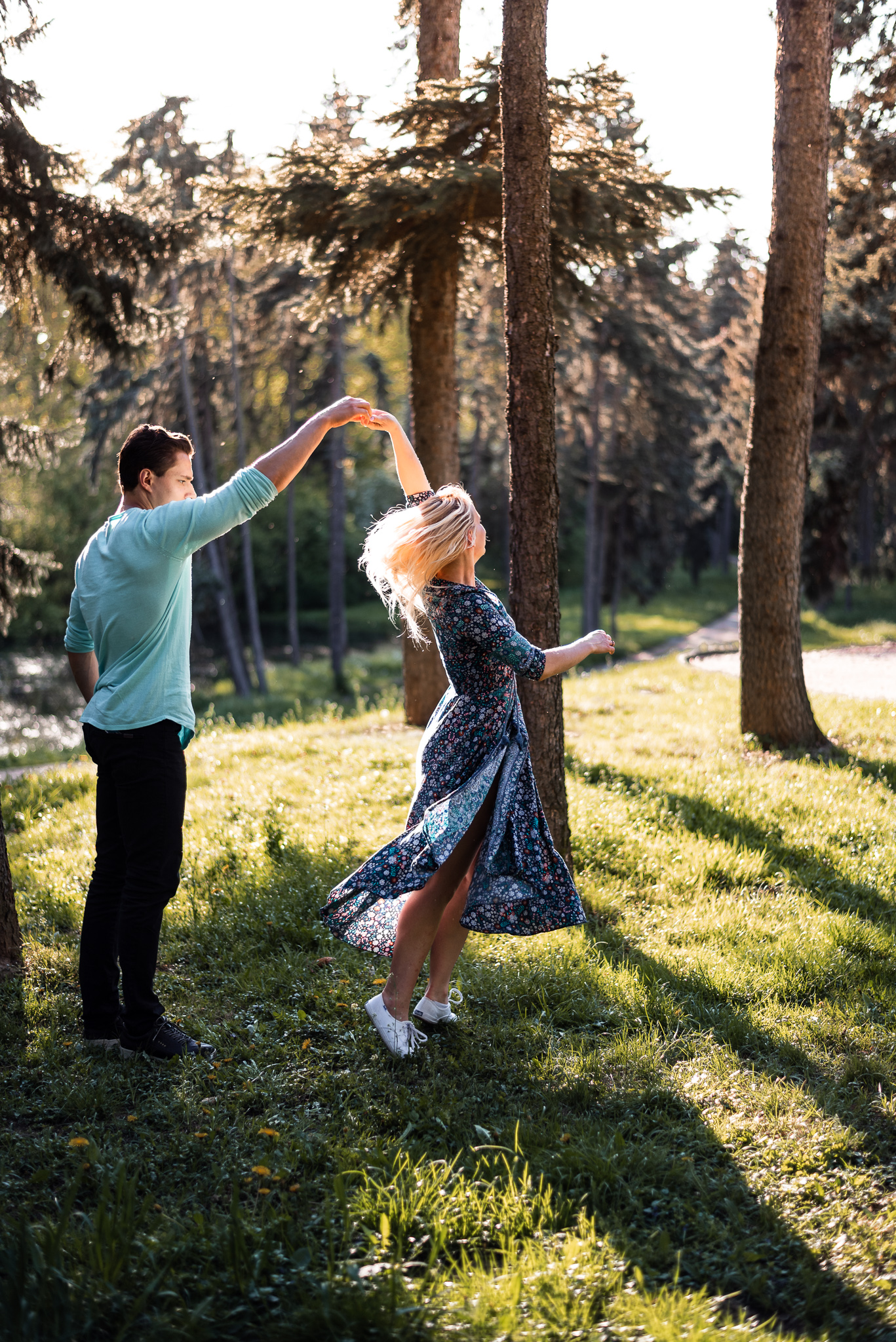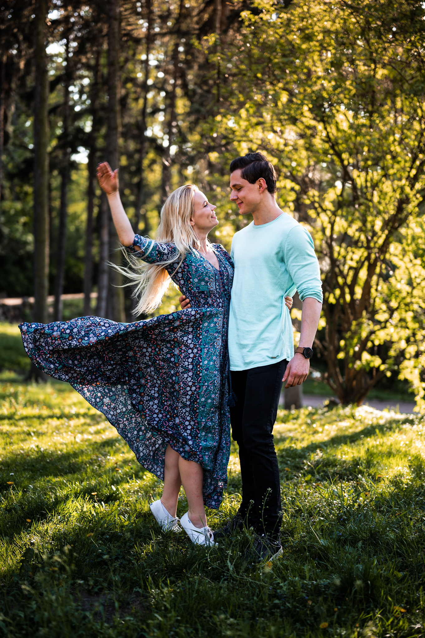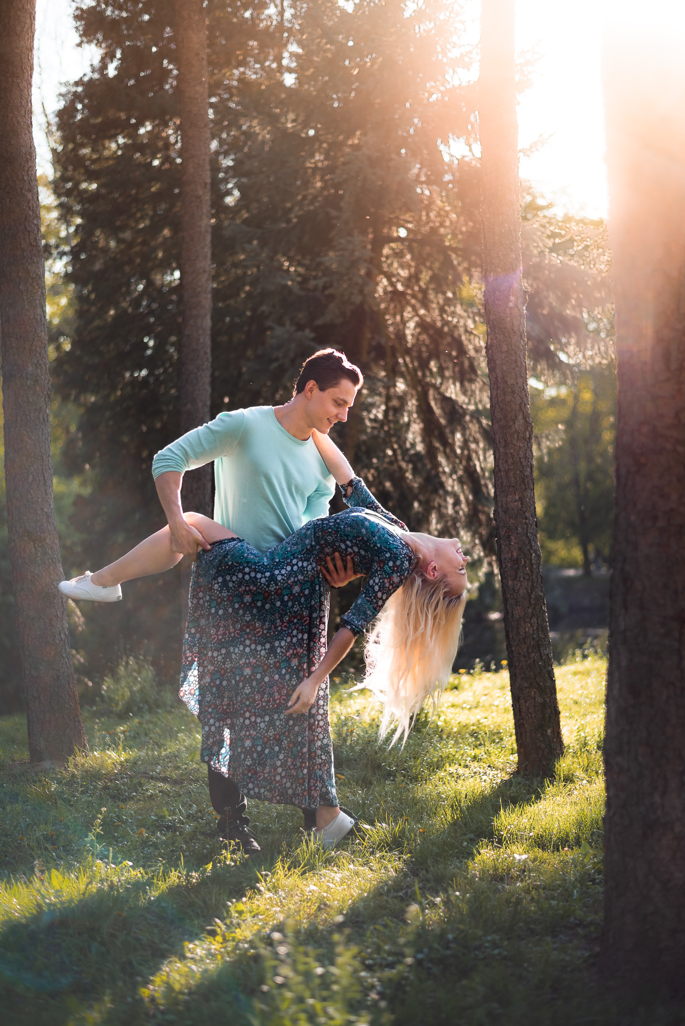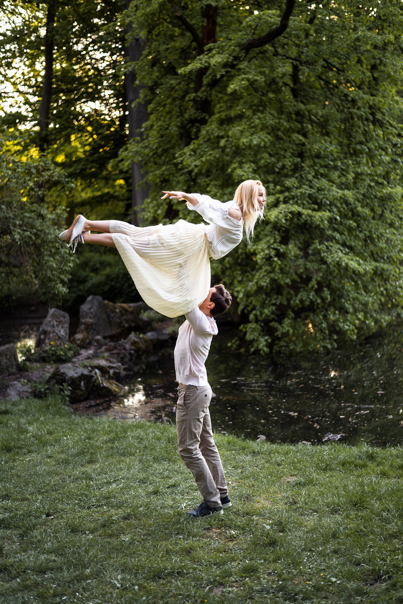 Z reguły rozpoczynając sesję zdjęciową z każdą z par staramy się dać im chwile na oswojenie się z aparatem, z nami i z całością sytuacji. To takie kilka minut, żeby nerwy opadły, rumieniec zszedł z twarzy a pięści się rozluźniły 😀 Proponujemy, żeby po prostu się objęli, stanęli obok siebie lub przespacerowali za rękę, cały czas z nimi rozmawiając, robiąc zdjęcia… ale jednak bardziej rozmawiając 😉 W tym konkretnym przypadku na nasze pytanie i prośbę, żeby Agnieszka i Michał coś o sobie opowiedzieli, usłyszeliśmy od Niej zdawkowe: „Michał zajmuje się akrobatyką, a ja tańcem”. Po tym wymienili między sobą kilka spojrzeń, uśmiechów, a za ułamek sekundy Agnieszka obejmowała Michała za szyję i wirowała równolegle do ziemi 😀 Szok! 😀 W tym momencie już wiedzieliśmy, że to Oni podczas tej sesji będą zajmować się choreografią, a my musimy zadbać o tło i światło. Do teraz ciężko nam wymyślić pozę, którą chcielibyśmy ująć w kadrze, a której oni nie byliby w stanie wykonać. Być może po prostu coś takiego nie istnieje 🙂 Podnoszenie? Proszę bardzo. Obroty? Nie ma sprawy. Piruety, unoszenia, wyginania, przeginania itp. – bez problemu! 😛