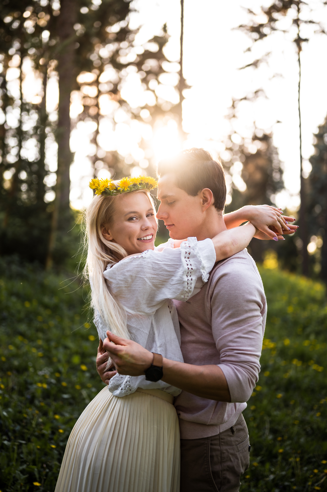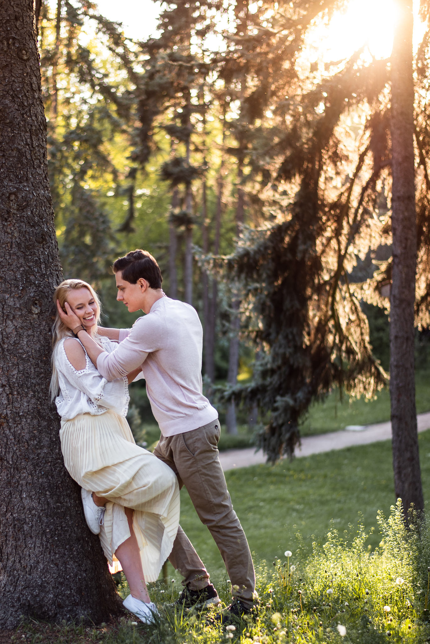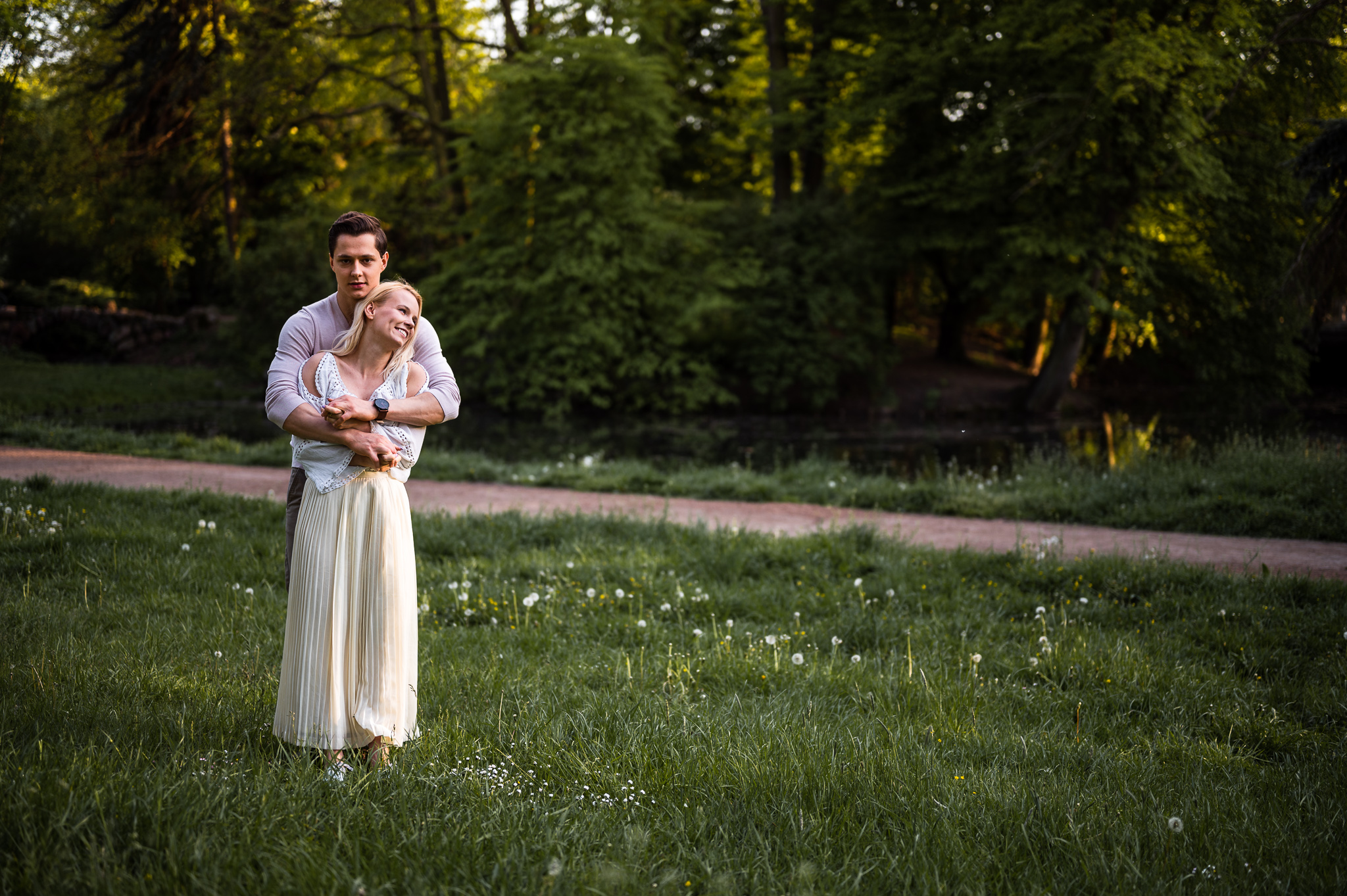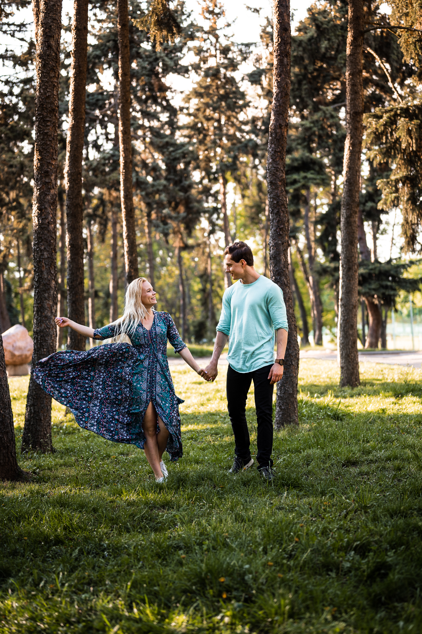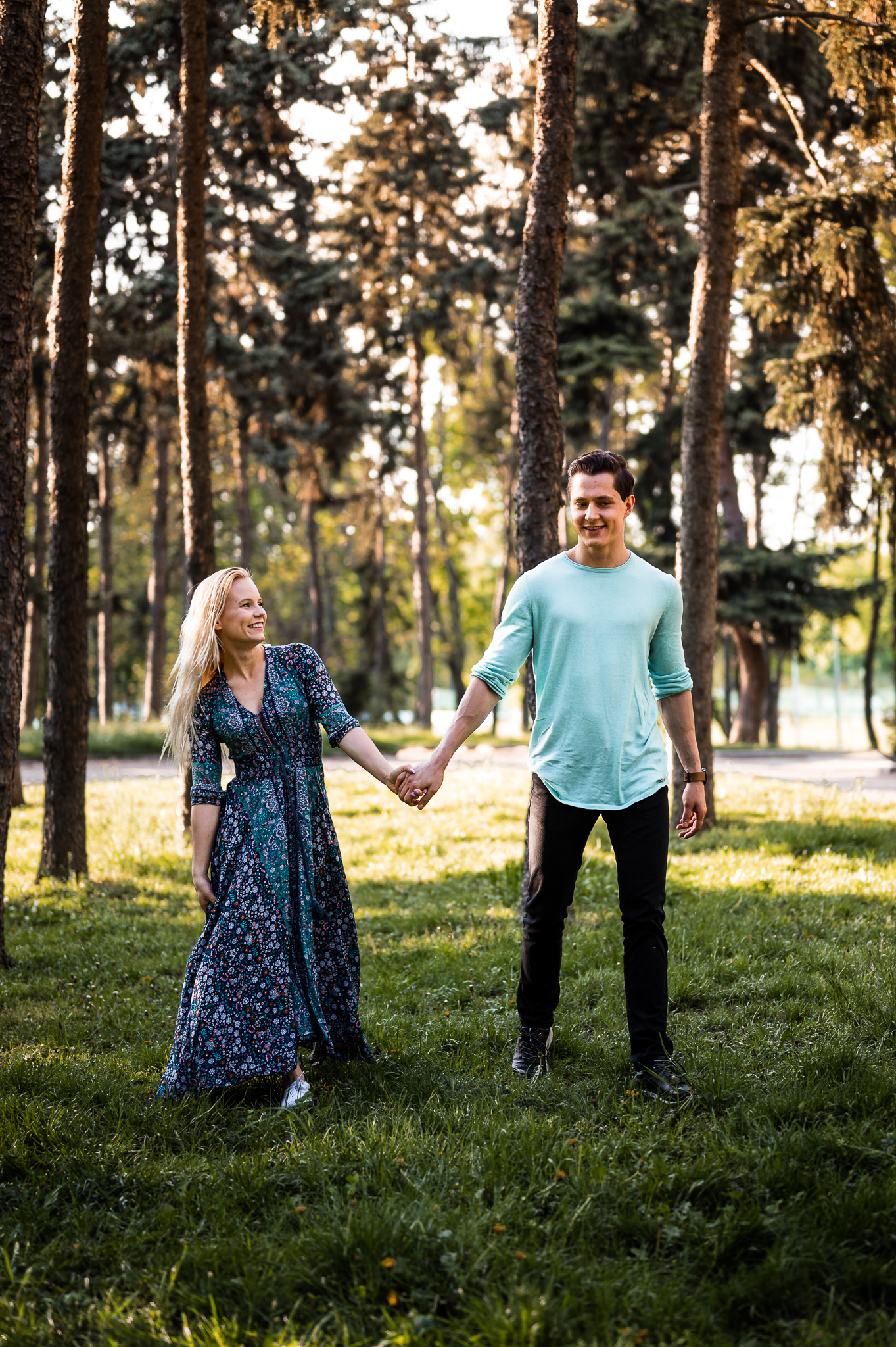 Z reguły rozpoczynając sesję zdjęciową z każdą z par staramy się dać im chwile na oswojenie się z aparatem, z nami i z całością sytuacji. To takie kilka minut, żeby nerwy opadły, rumieniec zszedł z twarzy a pięści się rozluźniły 😀 Proponujemy, żeby po prostu się objęli, stanęli obok siebie lub przespacerowali za rękę, cały czas z nimi rozmawiając, robiąc zdjęcia… ale jednak bardziej rozmawiając 😉 W tym konkretnym przypadku na nasze pytanie i prośbę, żeby Agnieszka i Michał coś o sobie opowiedzieli, usłyszeliśmy od Niej zdawkowe: „Michał zajmuje się akrobatyką, a ja tańcem”. Po tym wymienili między sobą kilka spojrzeń, uśmiechów, a za ułamek sekundy Agnieszka obejmowała Michała za szyję i wirowała równolegle do ziemi 😀 Szok! 😀 W tym momencie już wiedzieliśmy, że to Oni podczas tej sesji będą zajmować się choreografią, a my musimy zadbać o tło i światło. Do teraz ciężko nam wymyślić pozę, którą chcielibyśmy ująć w kadrze, a której oni nie byliby w stanie wykonać. Być może po prostu coś takiego nie istnieje 🙂 Podnoszenie? Proszę bardzo. Obroty? Nie ma sprawy. Piruety, unoszenia, wyginania, przeginania itp. – bez problemu! 😛