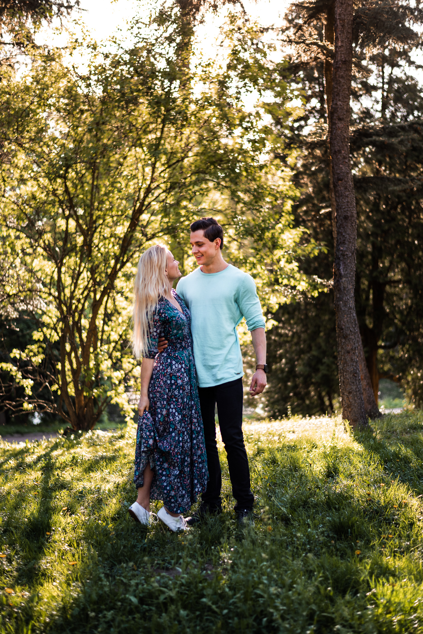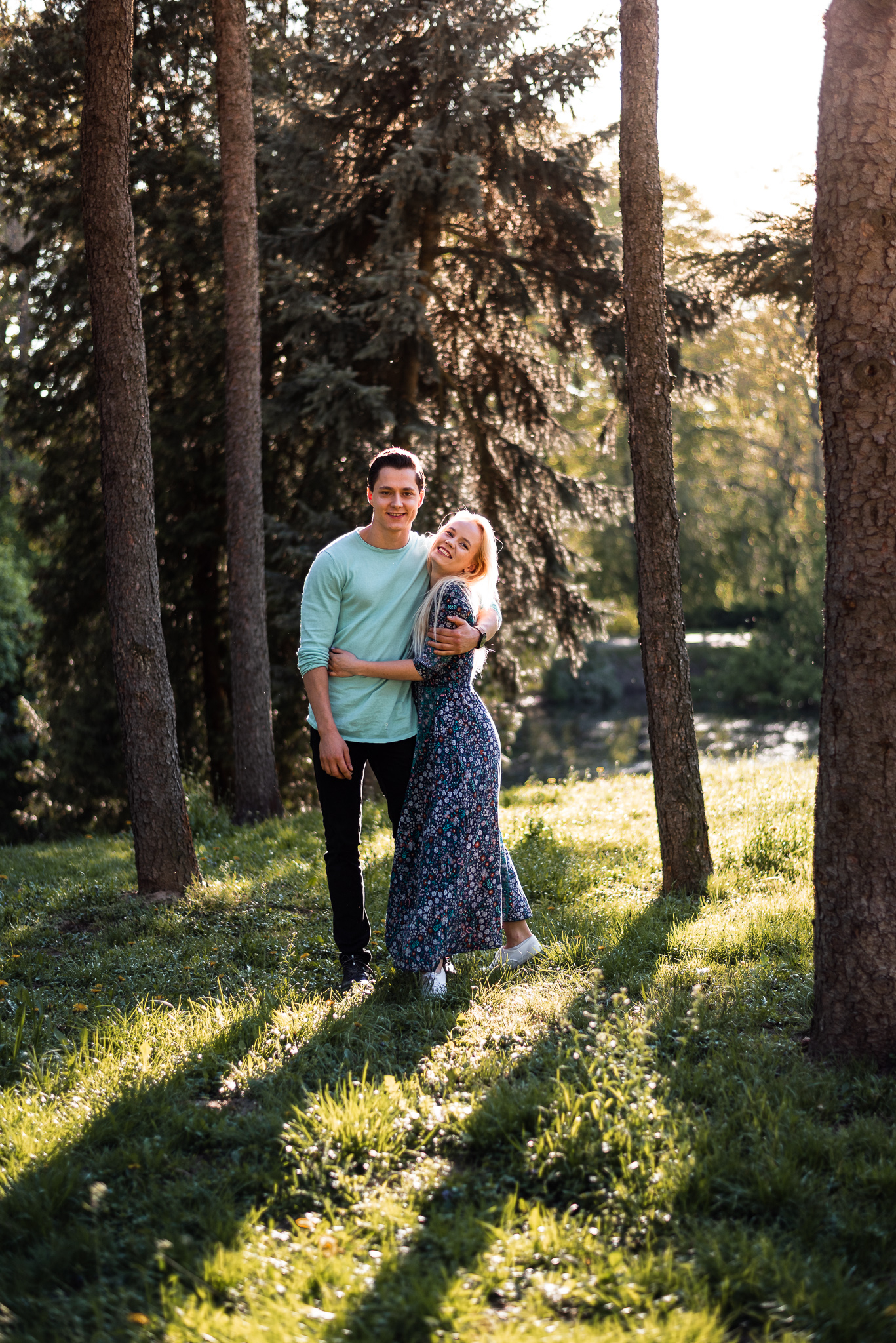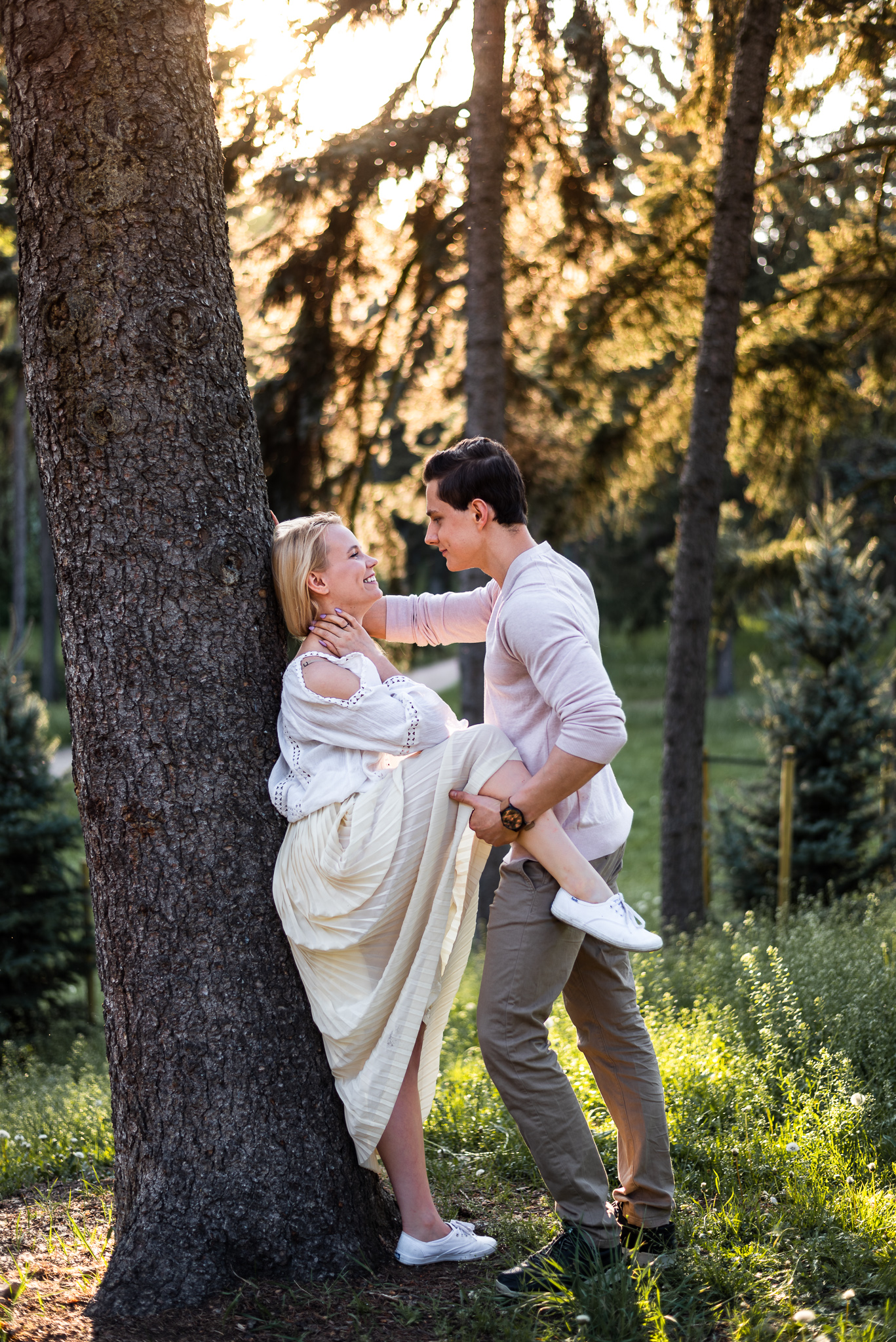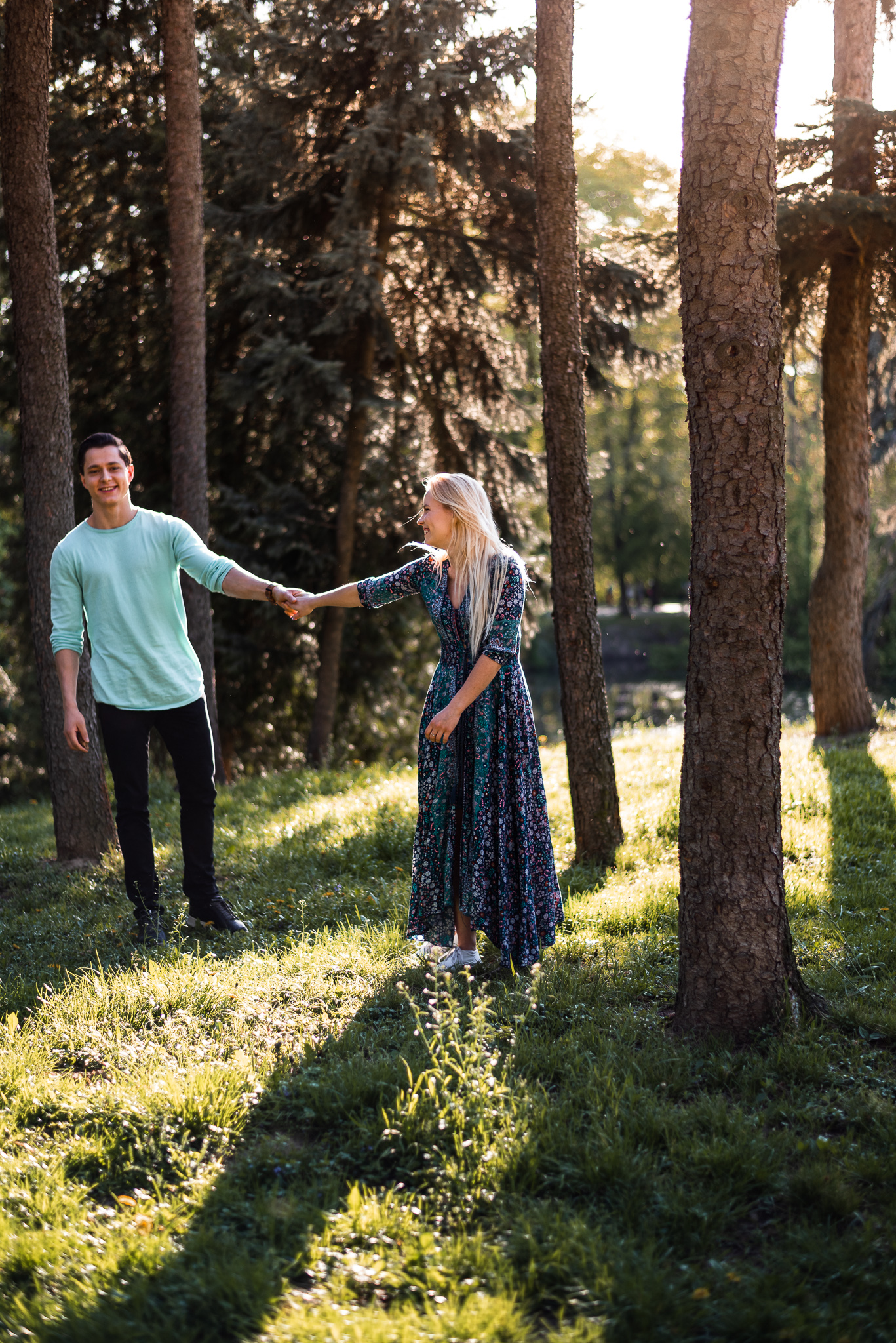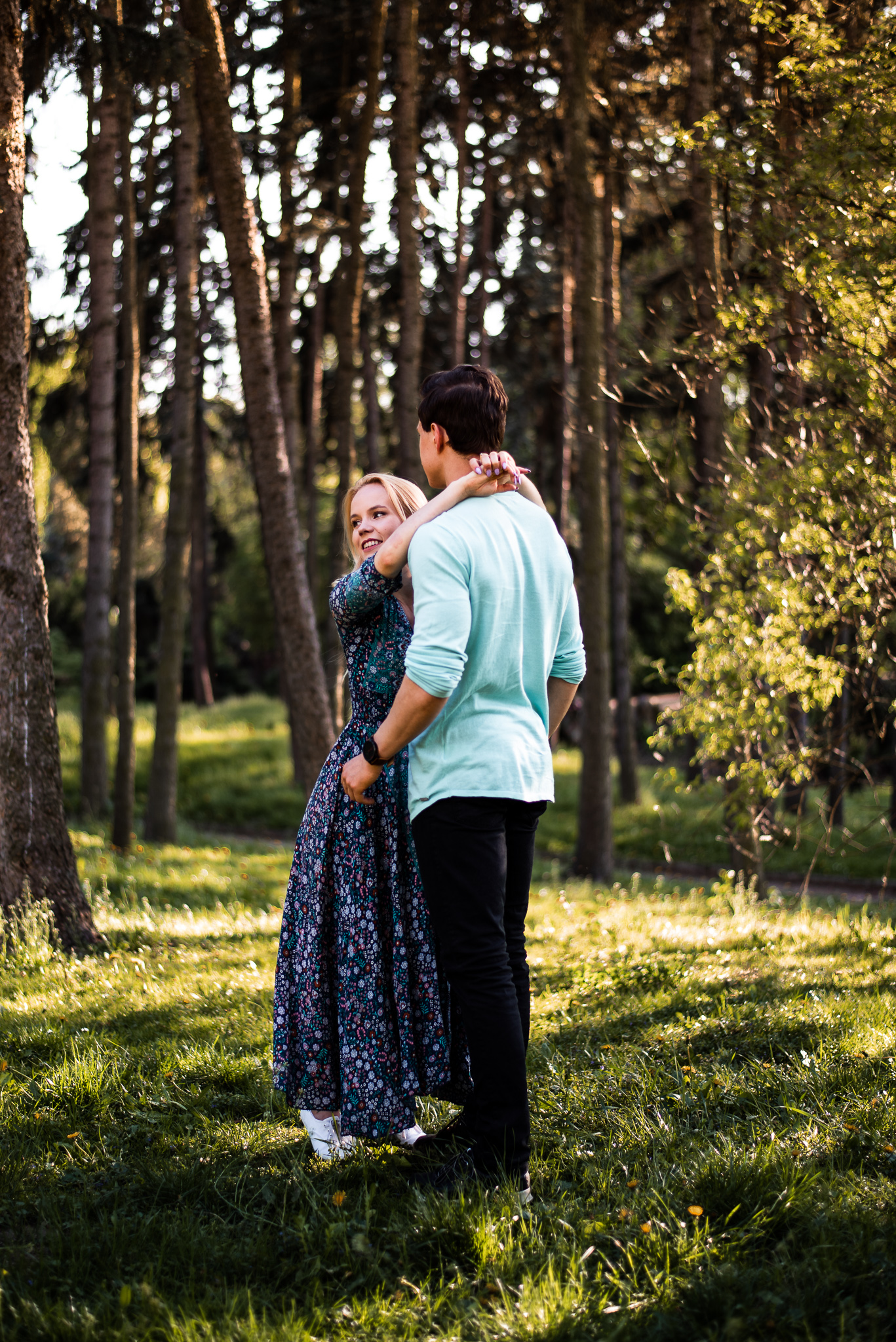 Z reguły rozpoczynając sesję zdjęciową z każdą z par staramy się dać im chwile na oswojenie się z aparatem, z nami i z całością sytuacji. To takie kilka minut, żeby nerwy opadły, rumieniec zszedł z twarzy a pięści się rozluźniły 😀 Proponujemy, żeby po prostu się objęli, stanęli obok siebie lub przespacerowali za rękę, cały czas z nimi rozmawiając, robiąc zdjęcia… ale jednak bardziej rozmawiając 😉 W tym konkretnym przypadku na nasze pytanie i prośbę, żeby Agnieszka i Michał coś o sobie opowiedzieli, usłyszeliśmy od Niej zdawkowe: „Michał zajmuje się akrobatyką, a ja tańcem”. Po tym wymienili między sobą kilka spojrzeń, uśmiechów, a za ułamek sekundy Agnieszka obejmowała Michała za szyję i wirowała równolegle do ziemi 😀 Szok! 😀 W tym momencie już wiedzieliśmy, że to Oni podczas tej sesji będą zajmować się choreografią, a my musimy zadbać o tło i światło. Do teraz ciężko nam wymyślić pozę, którą chcielibyśmy ująć w kadrze, a której oni nie byliby w stanie wykonać. Być może po prostu coś takiego nie istnieje 🙂 Podnoszenie? Proszę bardzo. Obroty? Nie ma sprawy. Piruety, unoszenia, wyginania, przeginania itp. – bez problemu! 😛