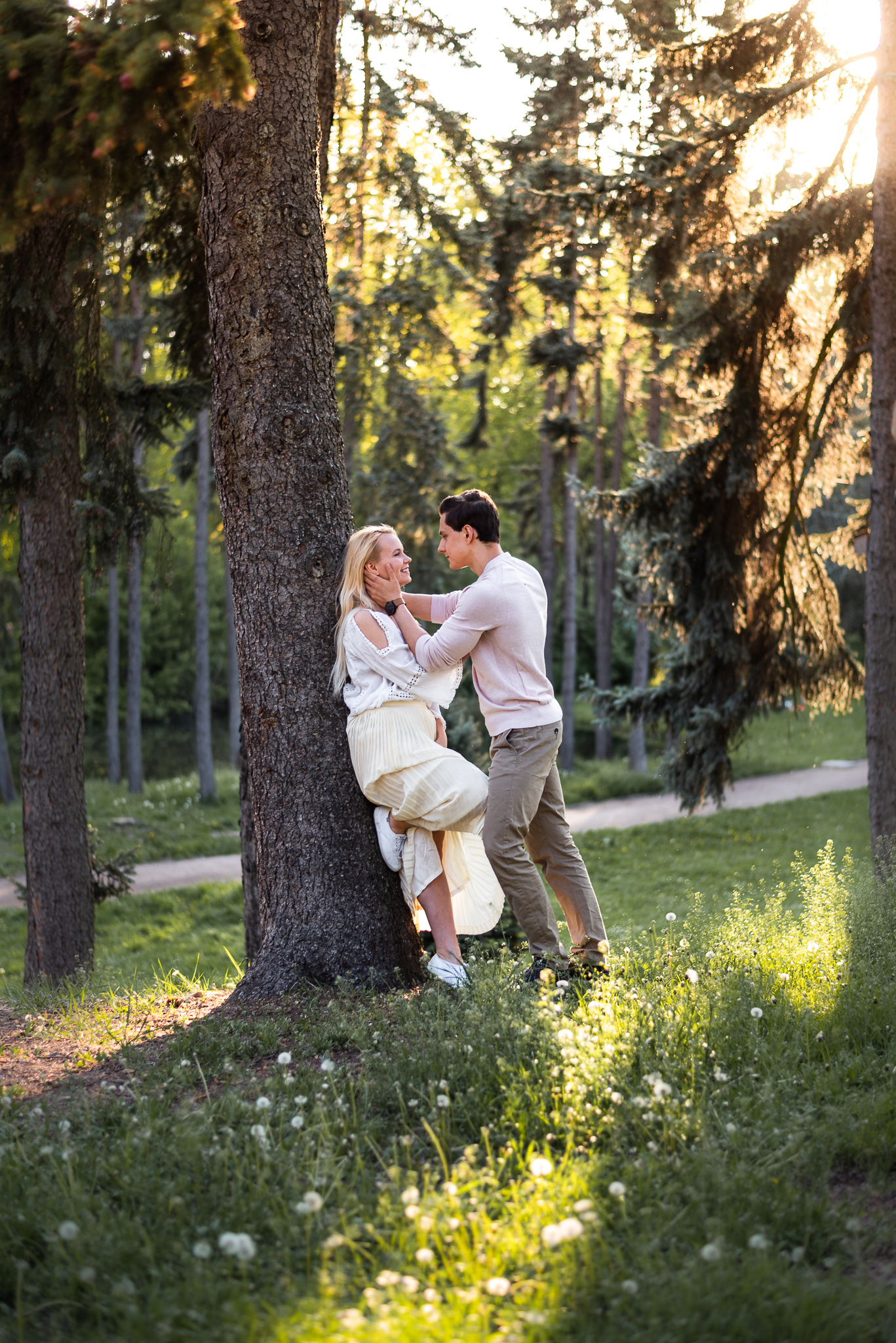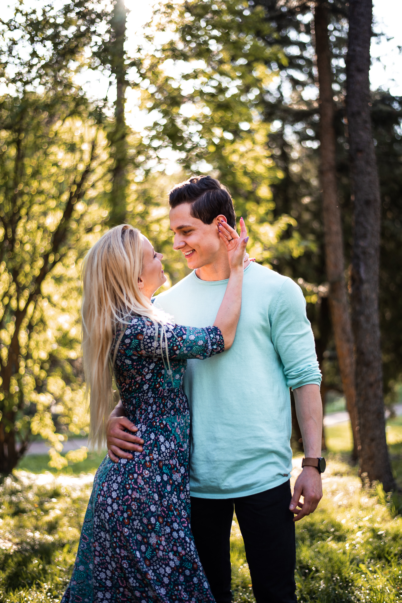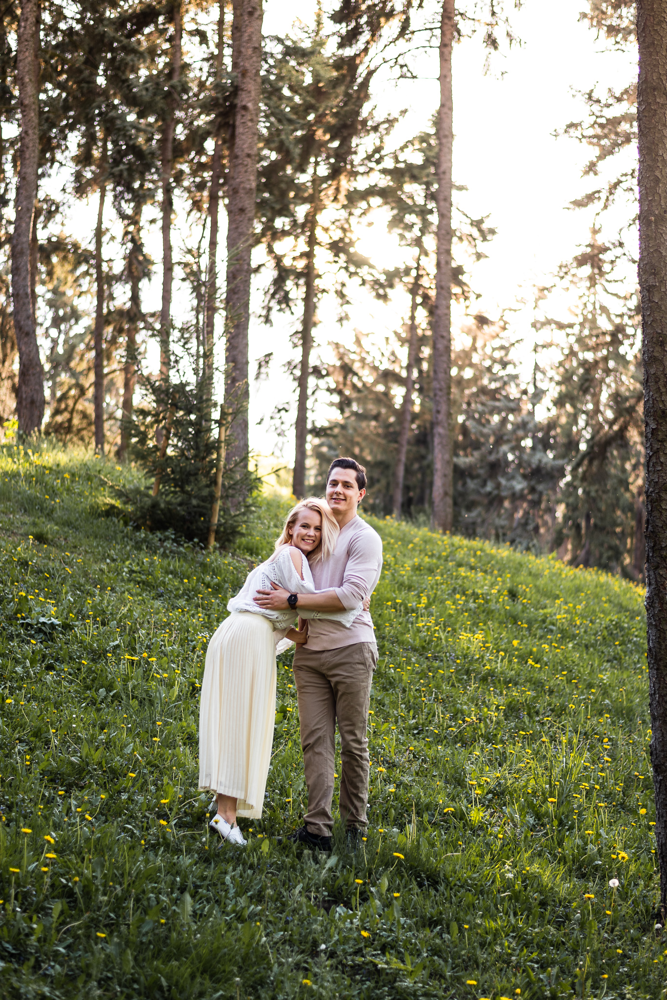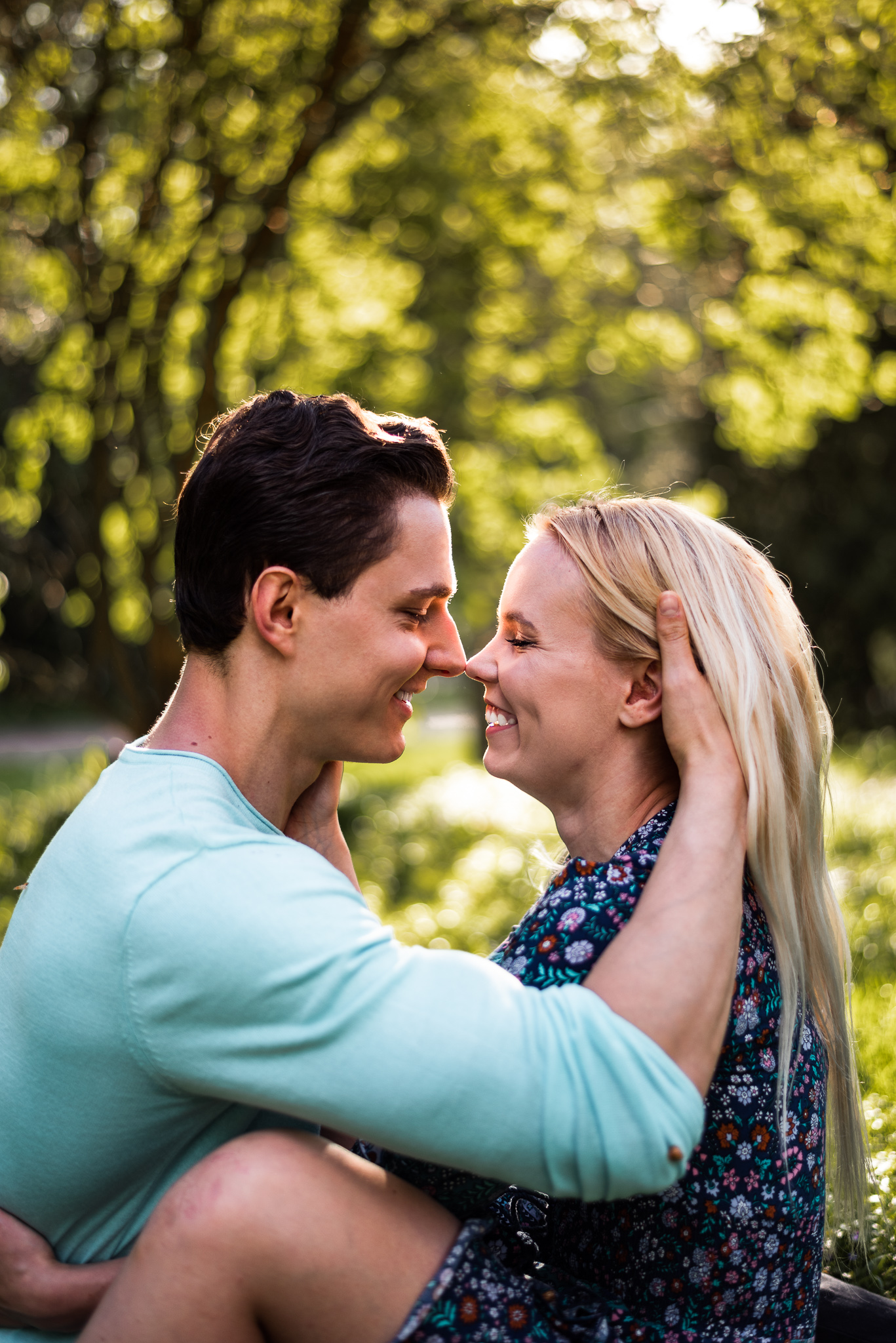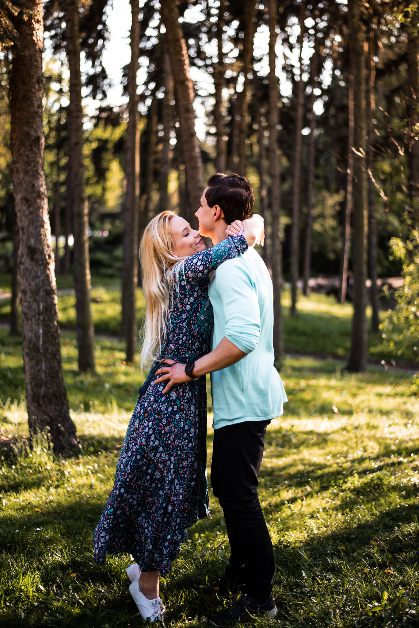 Z reguły rozpoczynając sesję zdjęciową z każdą z par staramy się dać im chwile na oswojenie się z aparatem, z nami i z całością sytuacji. To takie kilka minut, żeby nerwy opadły, rumieniec zszedł z twarzy a pięści się rozluźniły 😀 Proponujemy, żeby po prostu się objęli, stanęli obok siebie lub przespacerowali za rękę, cały czas z nimi rozmawiając, robiąc zdjęcia… ale jednak bardziej rozmawiając 😉 W tym konkretnym przypadku na nasze pytanie i prośbę, żeby Agnieszka i Michał coś o sobie opowiedzieli, usłyszeliśmy od Niej zdawkowe: „Michał zajmuje się akrobatyką, a ja tańcem”. Po tym wymienili między sobą kilka spojrzeń, uśmiechów, a za ułamek sekundy Agnieszka obejmowała Michała za szyję i wirowała równolegle do ziemi 😀 Szok! 😀 W tym momencie już wiedzieliśmy, że to Oni podczas tej sesji będą zajmować się choreografią, a my musimy zadbać o tło i światło. Do teraz ciężko nam wymyślić pozę, którą chcielibyśmy ująć w kadrze, a której oni nie byliby w stanie wykonać. Być może po prostu coś takiego nie istnieje 🙂 Podnoszenie? Proszę bardzo. Obroty? Nie ma sprawy. Piruety, unoszenia, wyginania, przeginania itp. – bez problemu! 😛