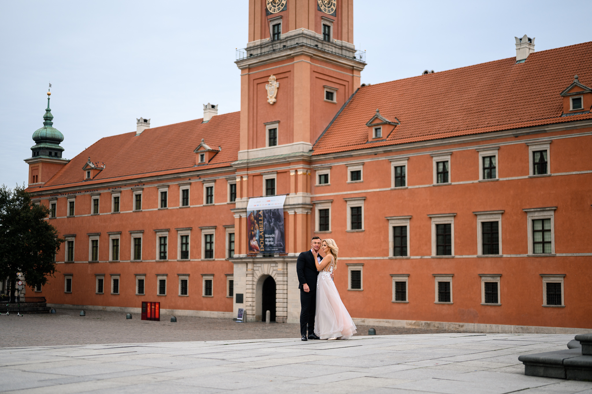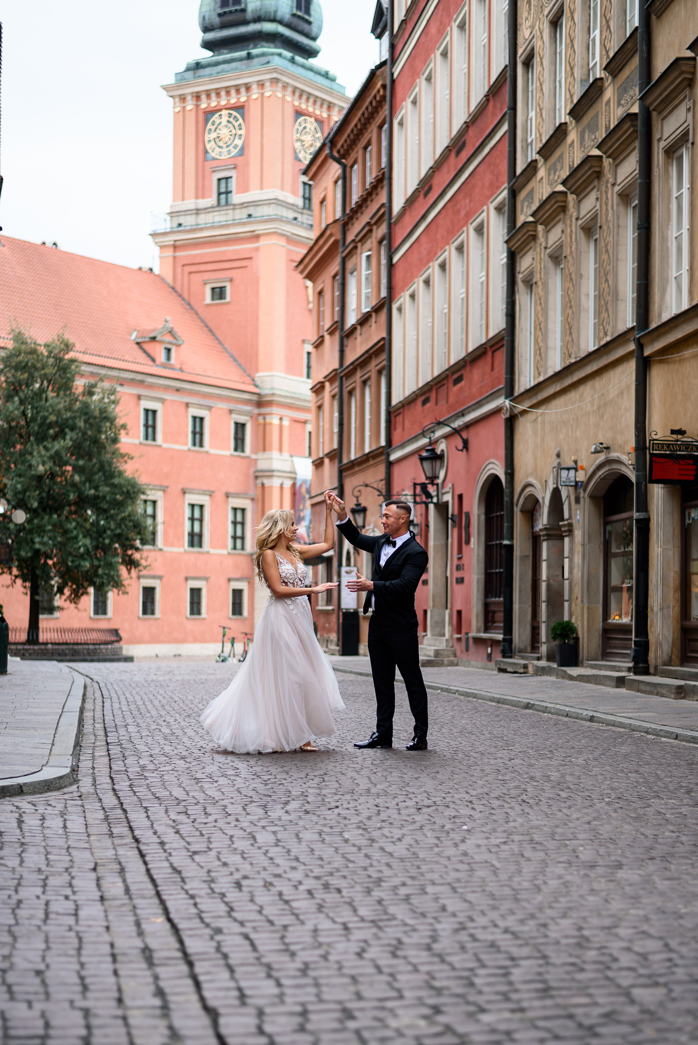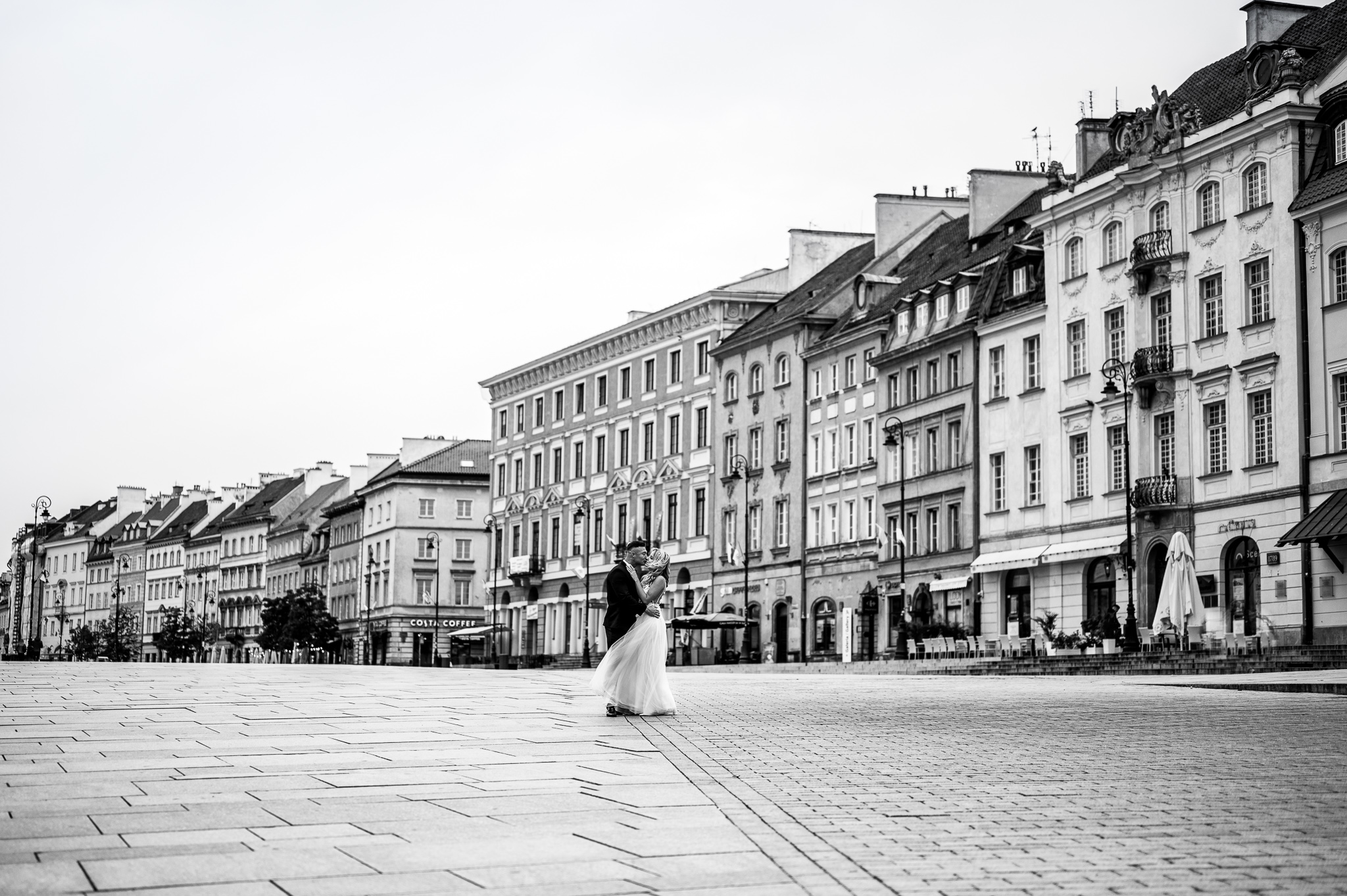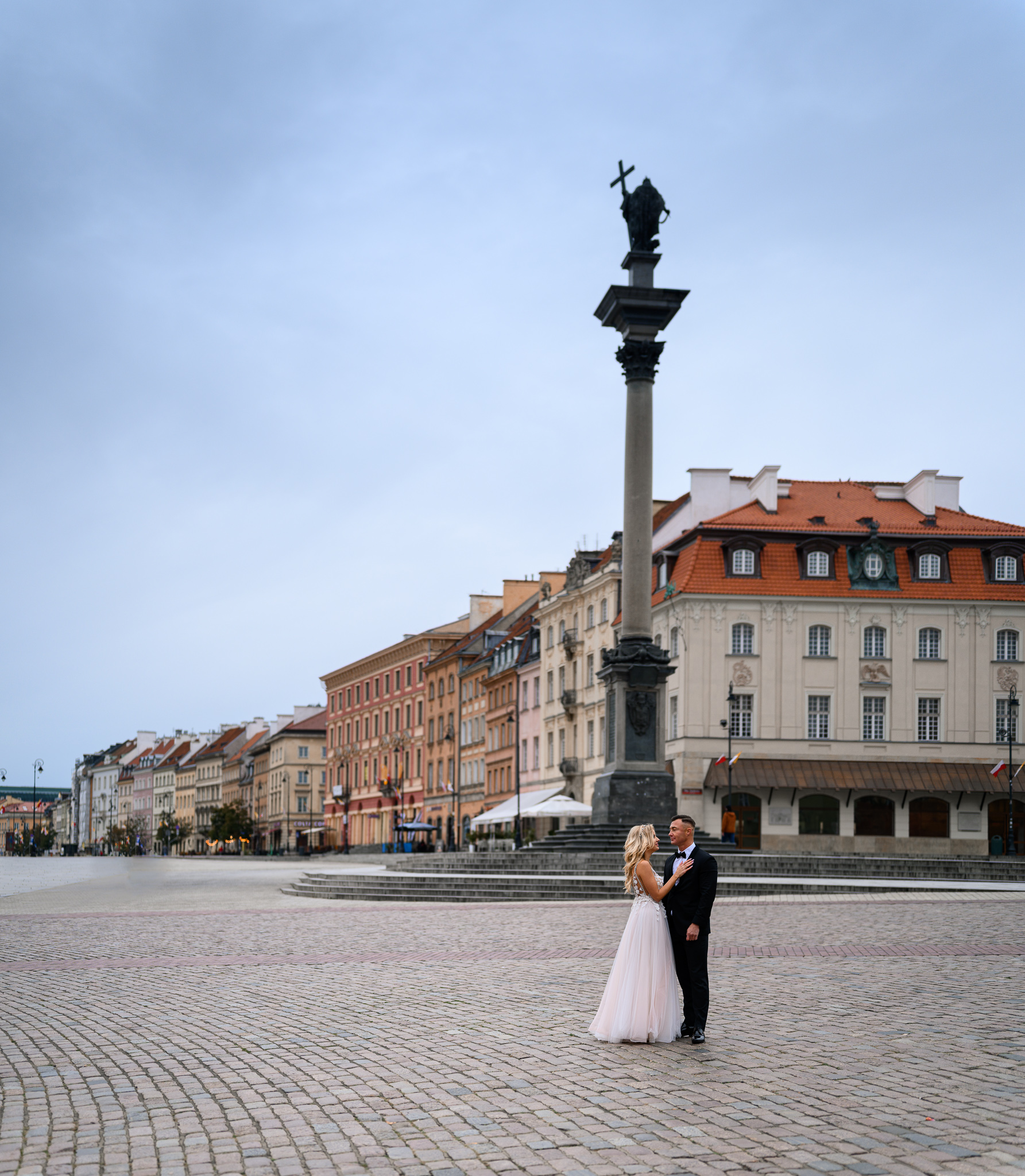 Teraz do rzeczy: z uwagi na zamknięte restauracje, kiepską pogodę (było około 8 stopni) i inne obostrzenia (kurczę, co za beznadziejne słowo „obostrzenia” :D) starówka była kompletnie pusta. To bardzo dobrze! Udało nam się wykonać wiele ujęć, które normalnie zapewne nie byłyby możliwe z uwagi na sporą liczbę osób w tle. Wyobrażacie sobie na przykład panoramiczne ujęcie pary młodej pod kolumną Zygmunta, bez wycinania przechodniów w Photoshopie – to prawie niemożliwe, a jednak! 🙂