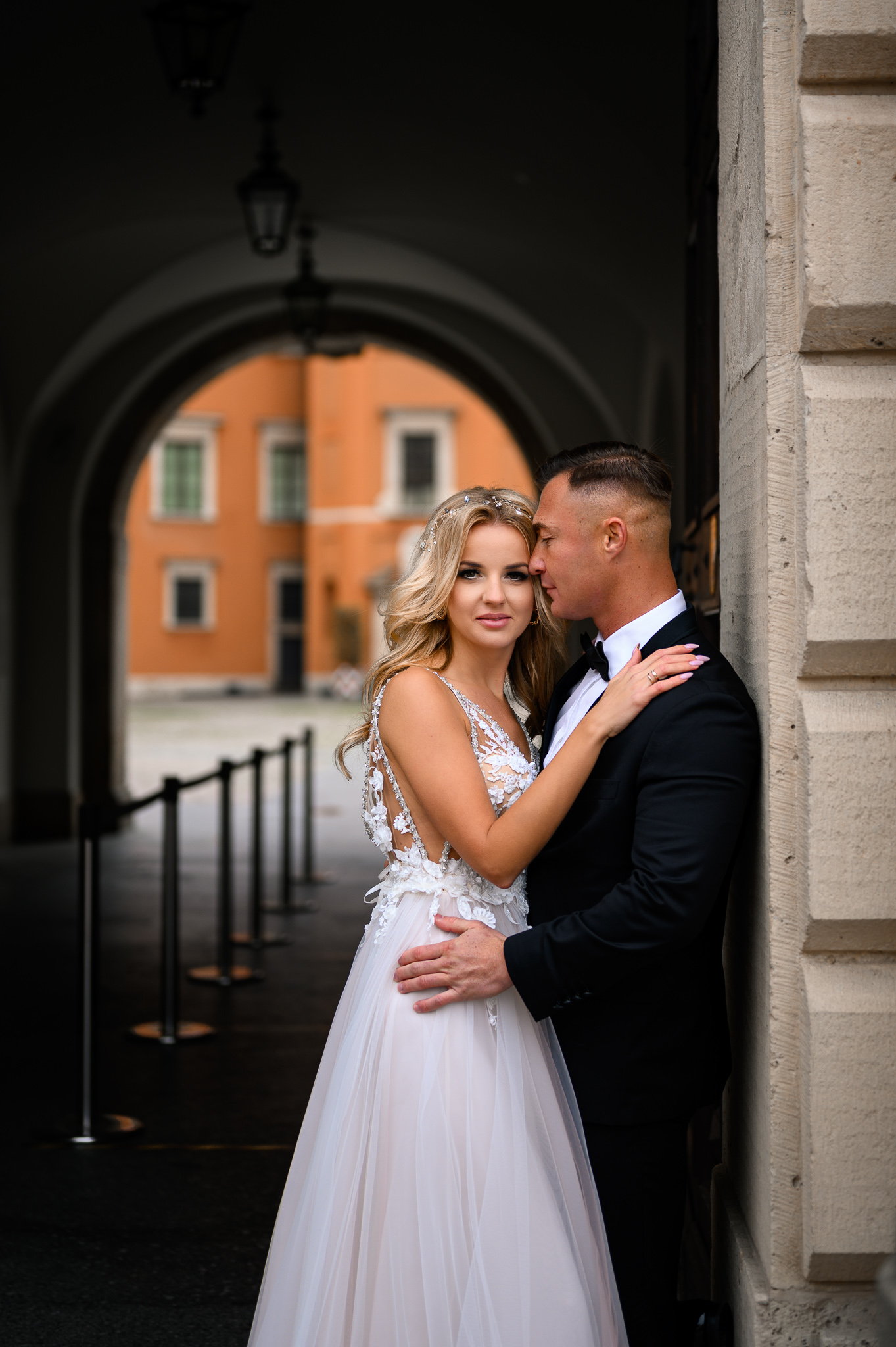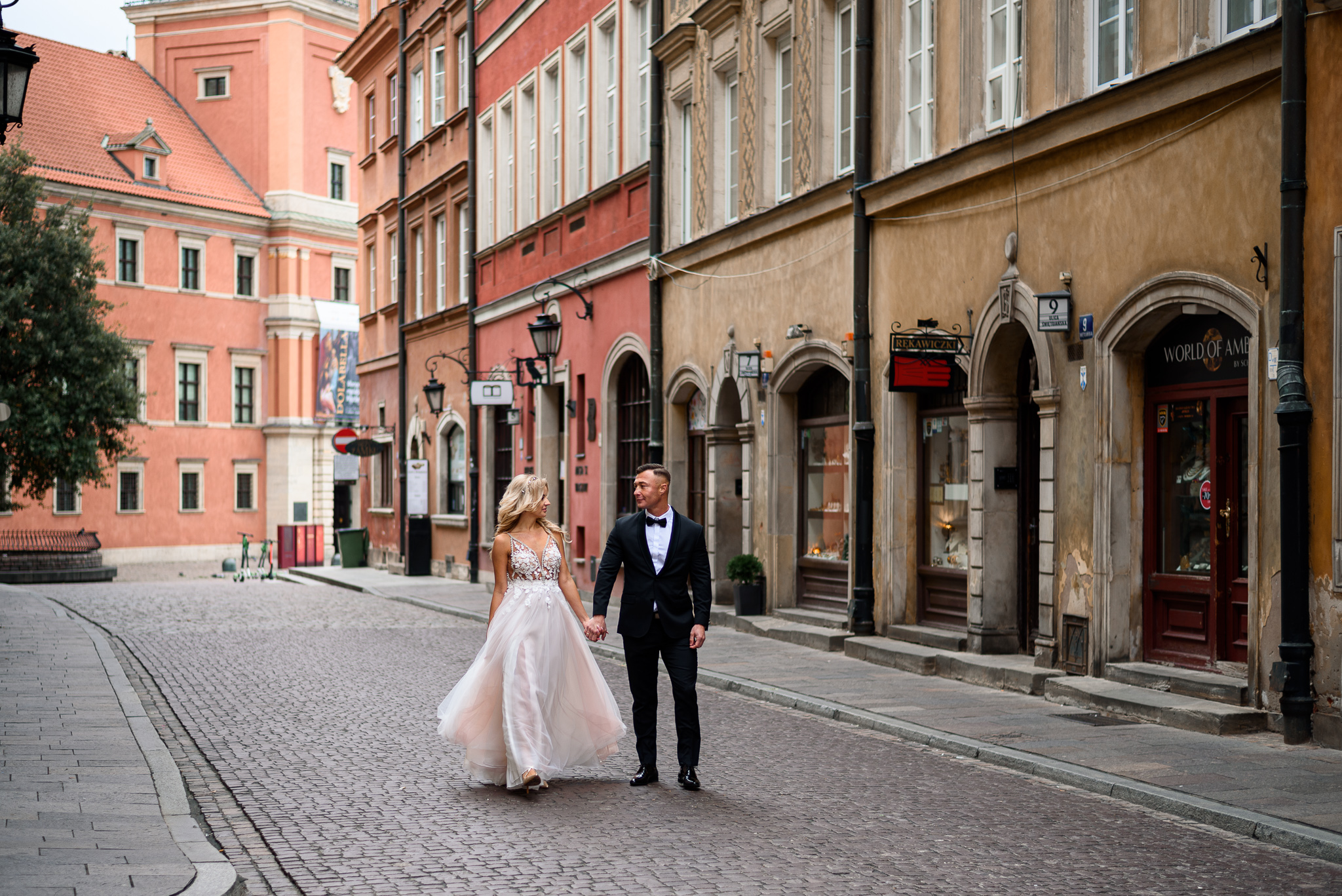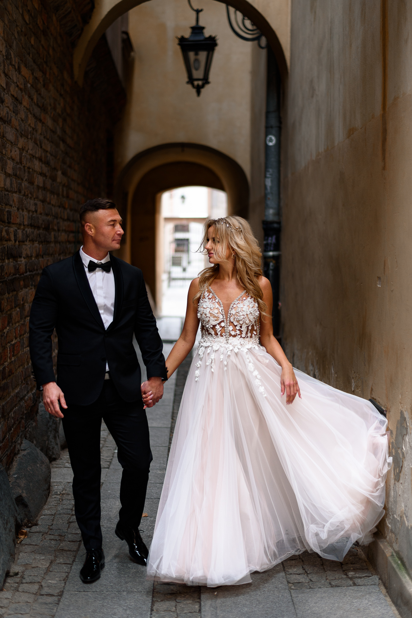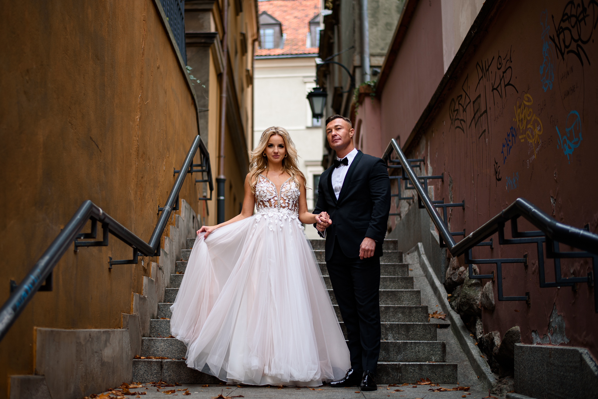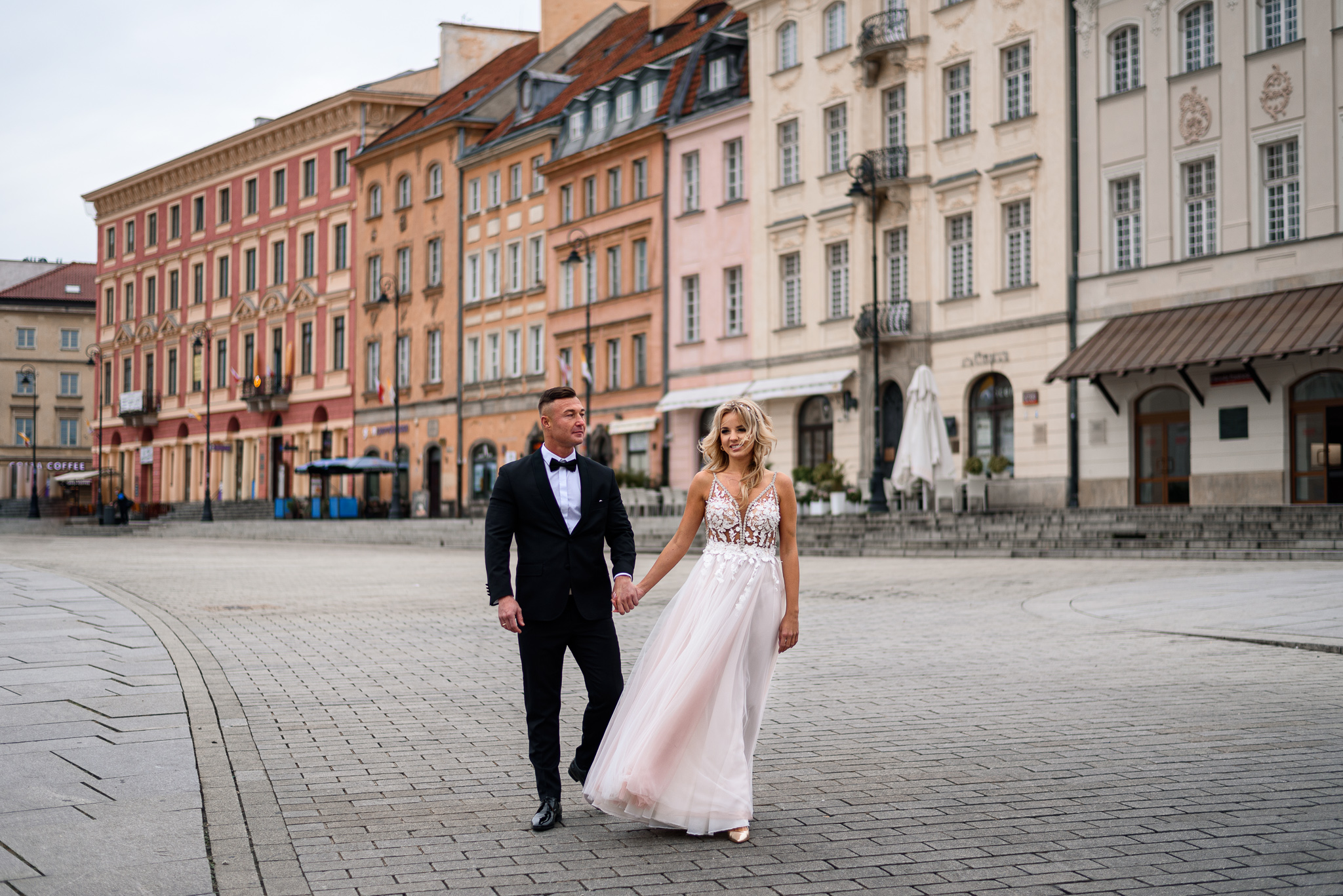 M&M wyglądali pięknie, ale to już wiecie. Był pełny makijaż i fryzura, pomimo weekendu i godzin porannych; suknia panny młodej, ale i garnitur oraz koszula pana młodego były wyprane, wyprasowane, buty wypastowane; wyglądali dokładnie tak samo dobrze jak w dniu ślubu 🙂 To naprawdę bardzo ważne! Wasz wygląd to absolutnie i bezwzględnie najważniejsza rzecz podczas sesji zdjęciowej. KAŻDEJ! Oczywiście, niektóre rzeczy da się poprawić w postprodukcji, ale nie wszystko 😉 Pamiętajcie o tym: my w czasie pracy z Wami wymagamy od siebie 120%; byłoby świetnie, gdybyście podchodzili do tego tak samo, tak jak M&M 🙂 Na szczęście obeszło się też bez maseczek – co prawda policja namiętnie patrolowała stare miasto, ale w momencie, gdy widzieli parę młodą w strojach ślubnych jedynie się uśmiechali z samochodów 😉