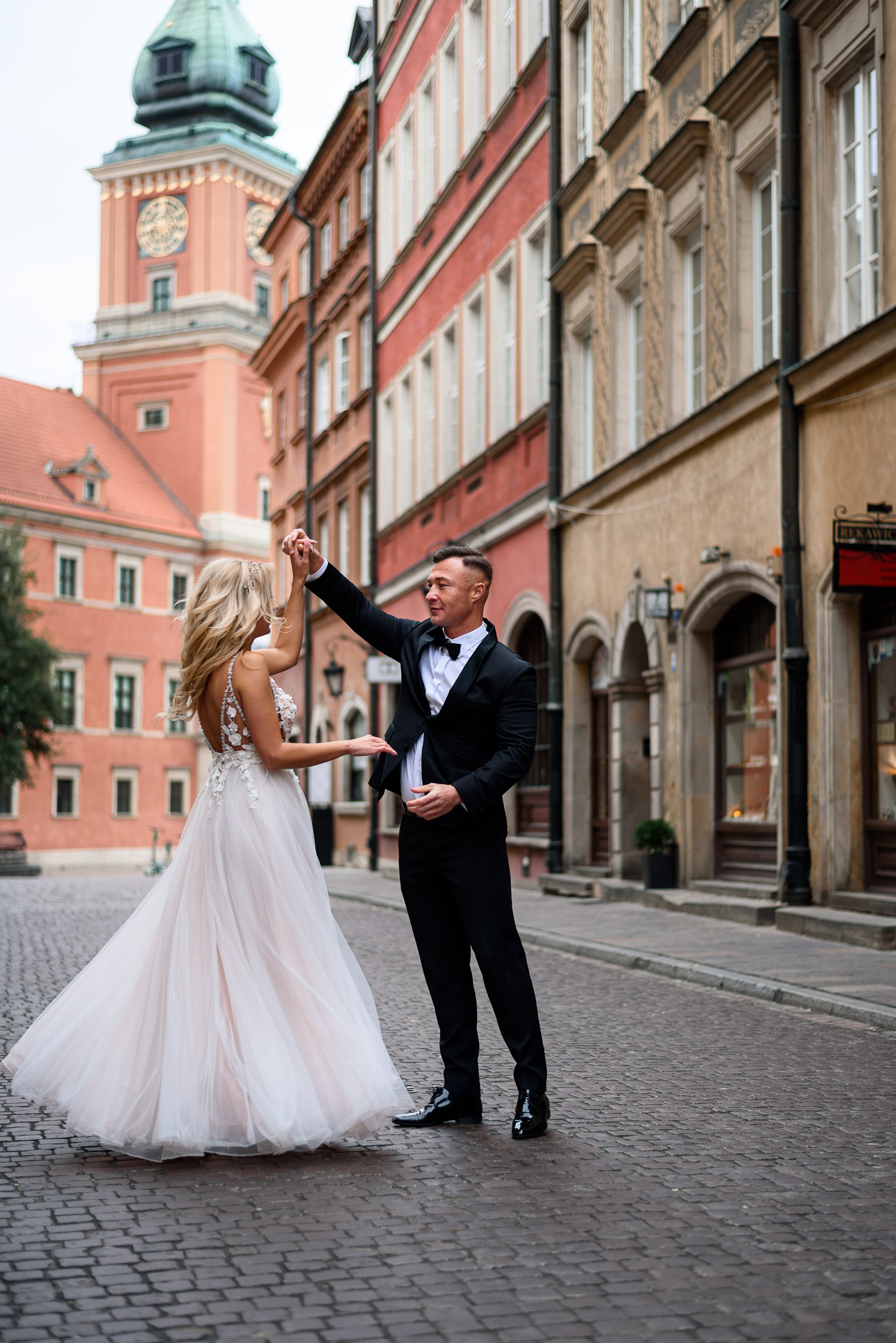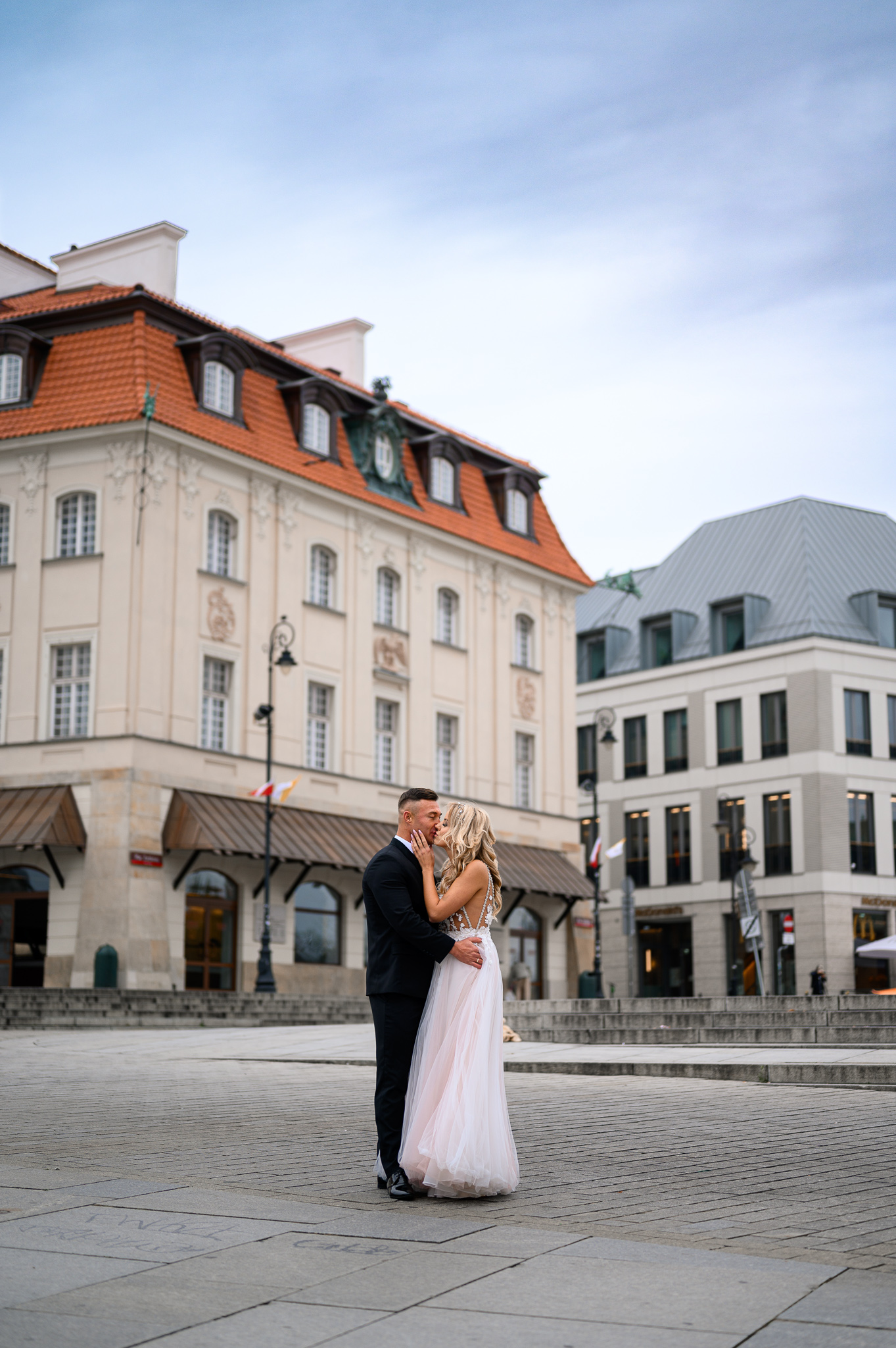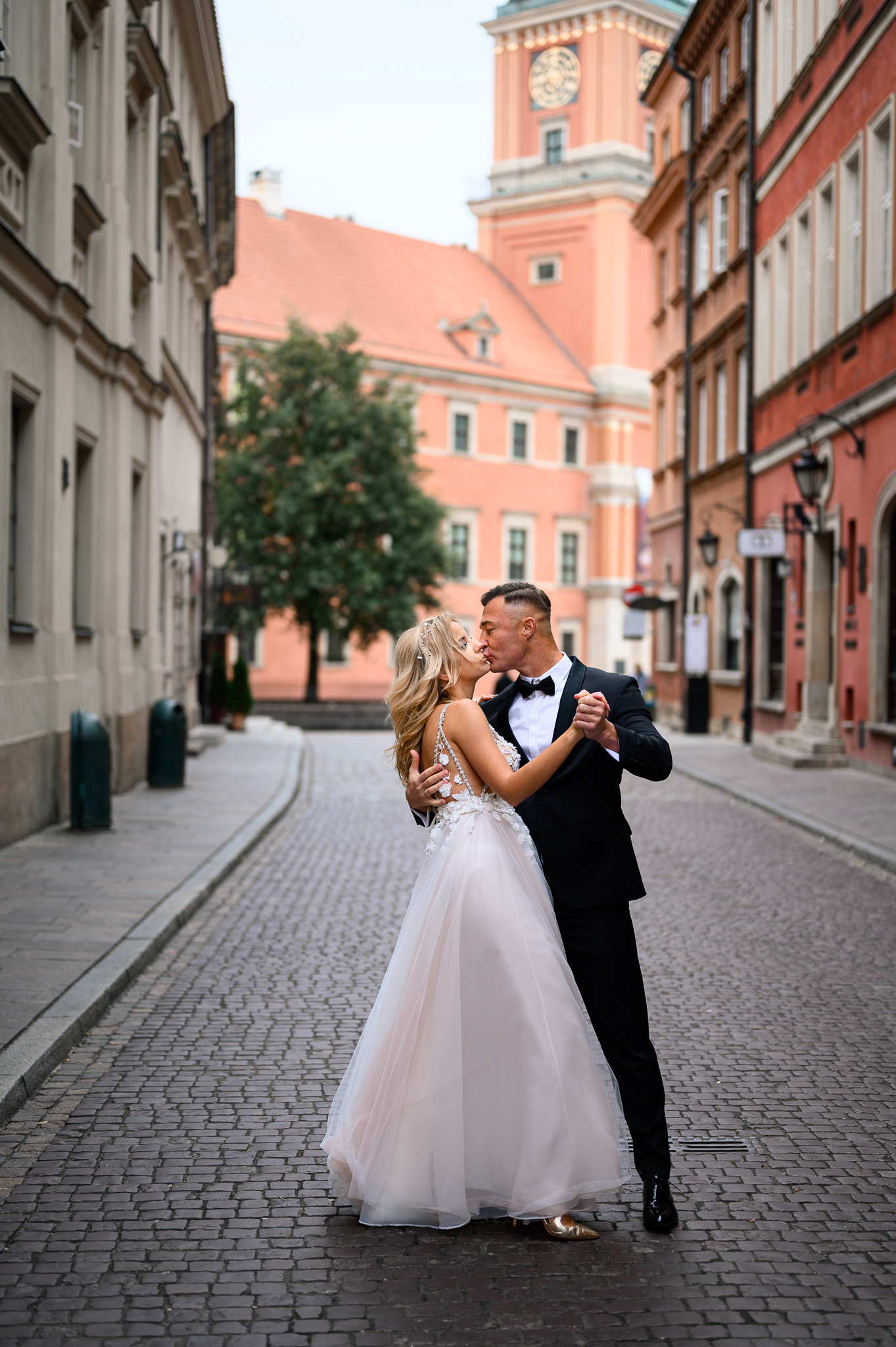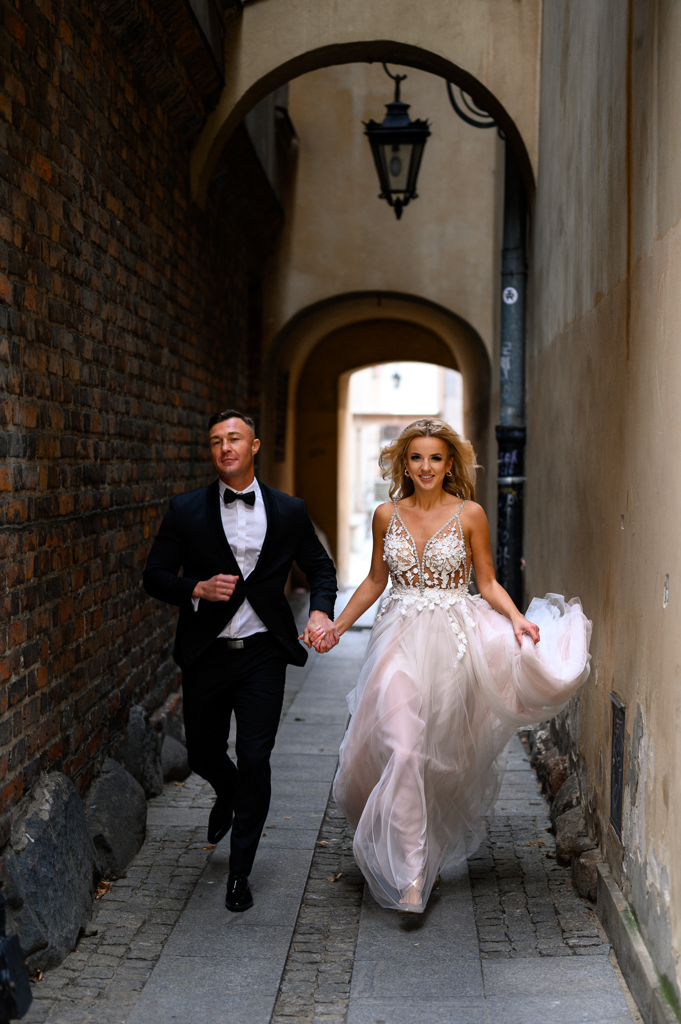 M&M wyglądali pięknie, ale to już wiecie. Był pełny makijaż i fryzura, pomimo weekendu i godzin porannych; suknia panny młodej, ale i garnitur oraz koszula pana młodego były wyprane, wyprasowane, buty wypastowane; wyglądali dokładnie tak samo dobrze jak w dniu ślubu 🙂 To naprawdę bardzo ważne! Wasz wygląd to absolutnie i bezwzględnie najważniejsza rzecz podczas sesji zdjęciowej. KAŻDEJ! Oczywiście, niektóre rzeczy da się poprawić w postprodukcji, ale nie wszystko 😉 Pamiętajcie o tym: my w czasie pracy z Wami wymagamy od siebie 120%; byłoby świetnie, gdybyście podchodzili do tego tak samo, tak jak M&M 🙂 Na szczęście obeszło się też bez maseczek – co prawda policja namiętnie patrolowała stare miasto, ale w momencie, gdy widzieli parę młodą w strojach ślubnych jedynie się uśmiechali z samochodów 😉