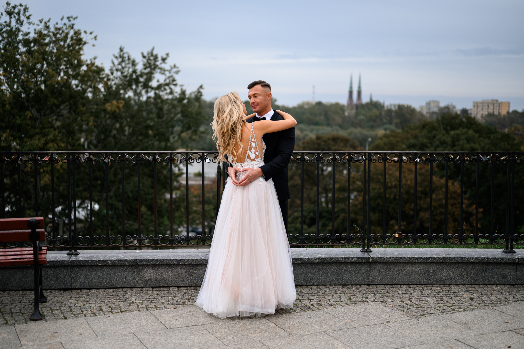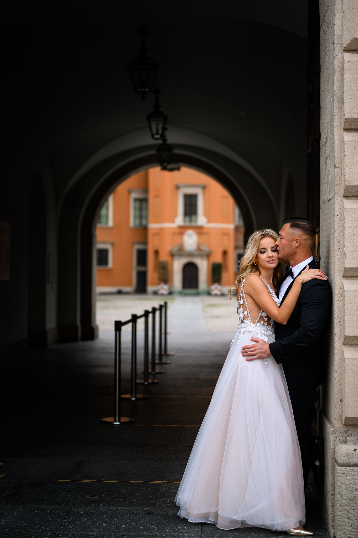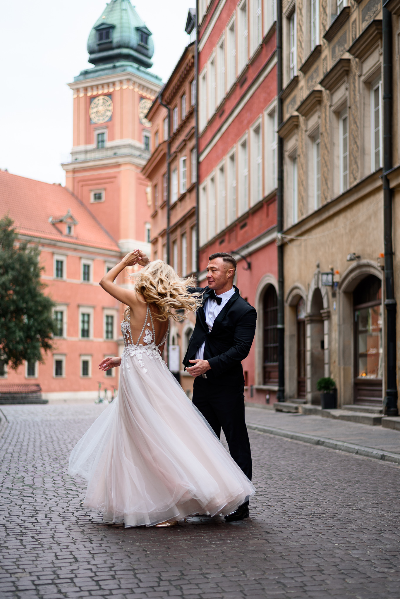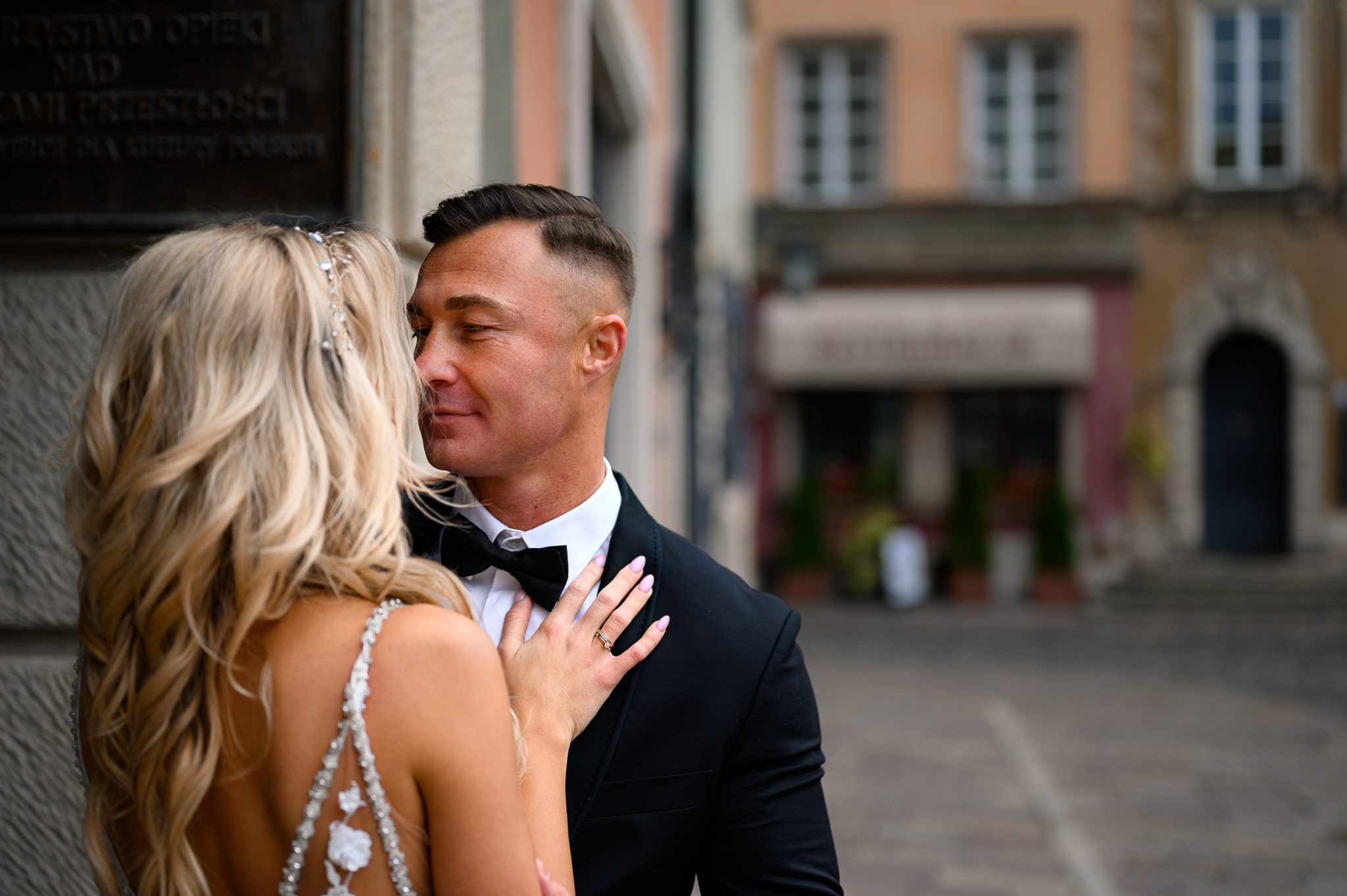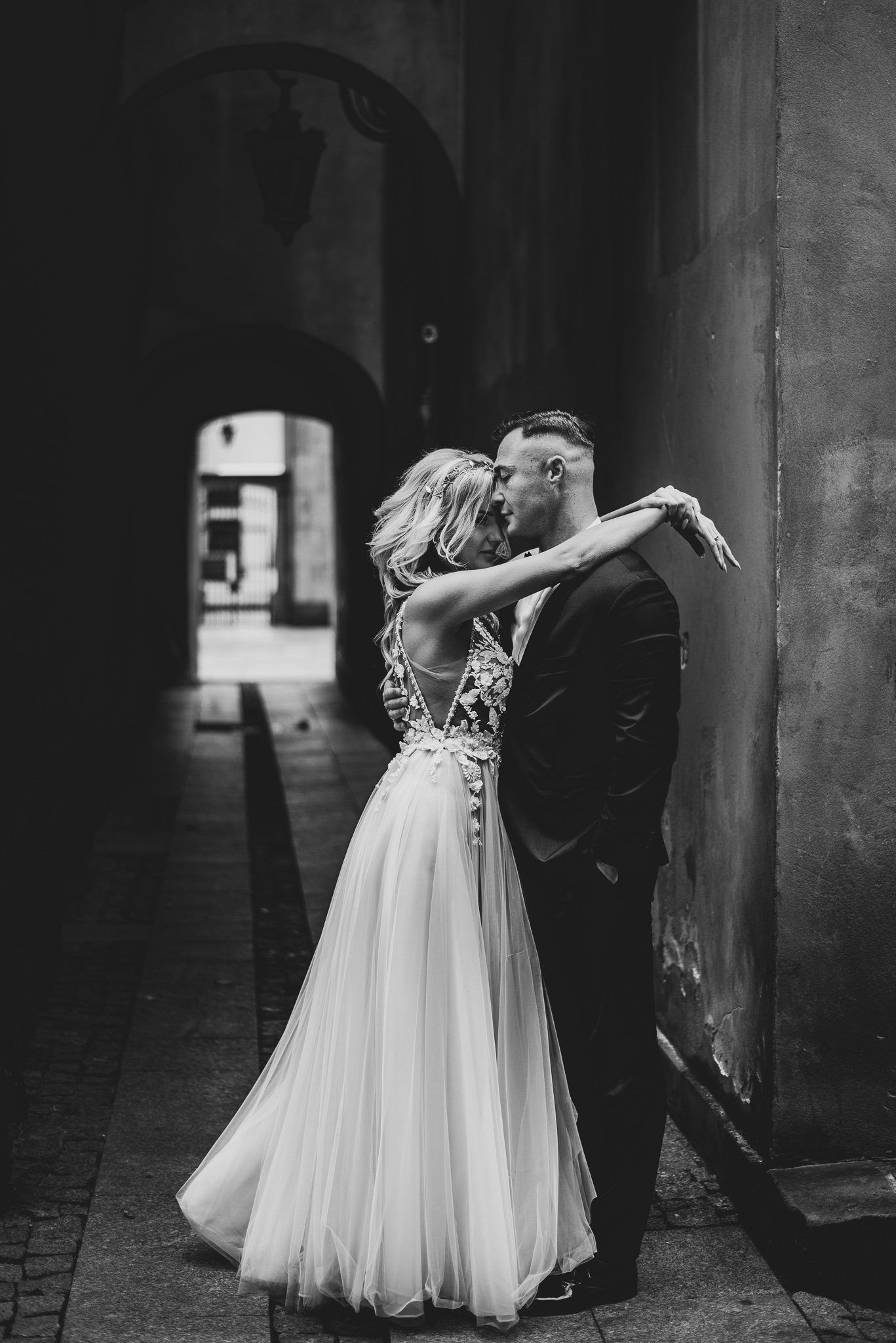 M&M wyglądali pięknie, ale to już wiecie. Był pełny makijaż i fryzura, pomimo weekendu i godzin porannych; suknia panny młodej, ale i garnitur oraz koszula pana młodego były wyprane, wyprasowane, buty wypastowane; wyglądali dokładnie tak samo dobrze jak w dniu ślubu 🙂 To naprawdę bardzo ważne! Wasz wygląd to absolutnie i bezwzględnie najważniejsza rzecz podczas sesji zdjęciowej. KAŻDEJ! Oczywiście, niektóre rzeczy da się poprawić w postprodukcji, ale nie wszystko 😉 Pamiętajcie o tym: my w czasie pracy z Wami wymagamy od siebie 120%; byłoby świetnie, gdybyście podchodzili do tego tak samo, tak jak M&M 🙂 Na szczęście obeszło się też bez maseczek – co prawda policja namiętnie patrolowała stare miasto, ale w momencie, gdy widzieli parę młodą w strojach ślubnych jedynie się uśmiechali z samochodów 😉