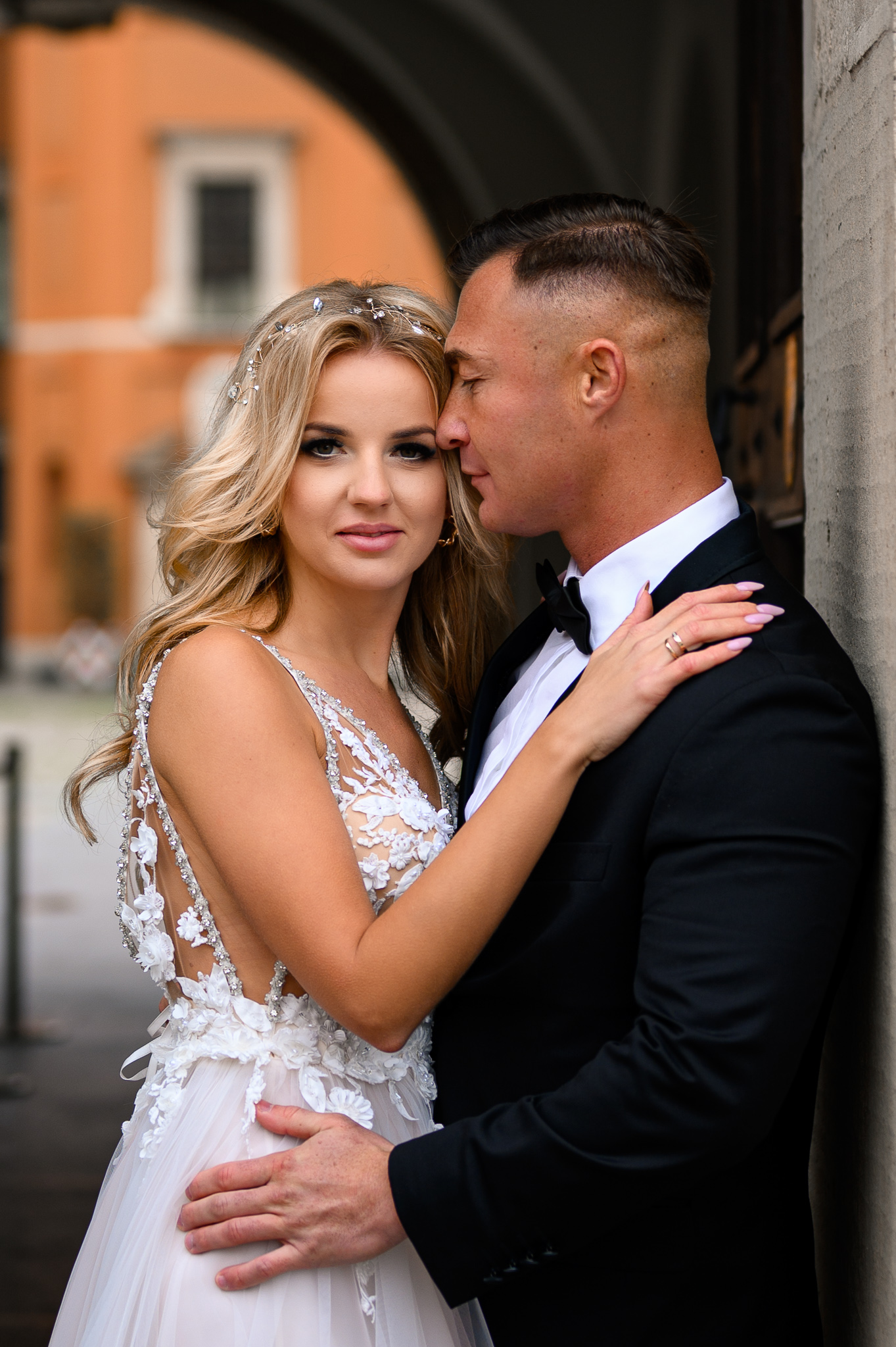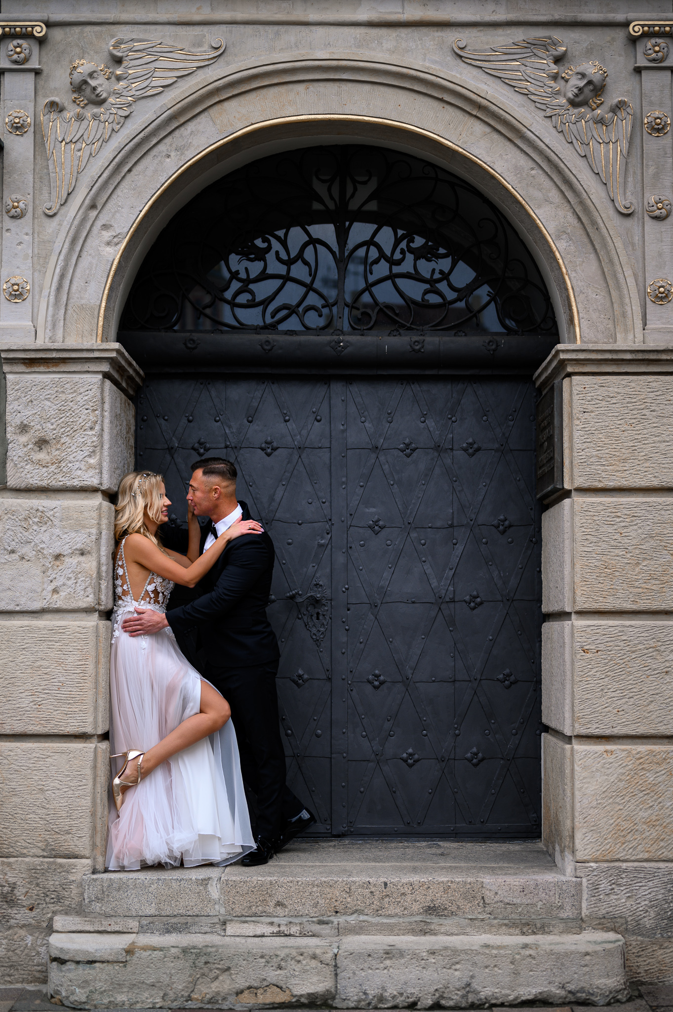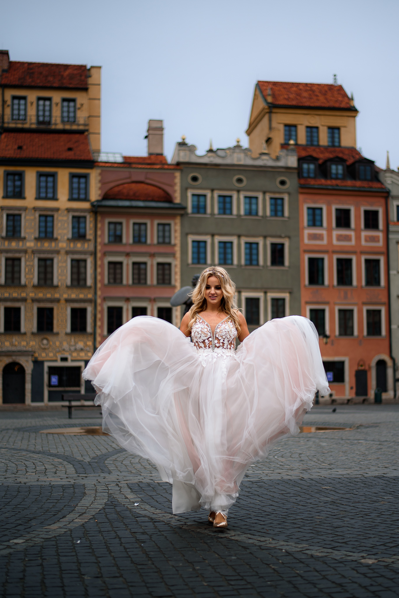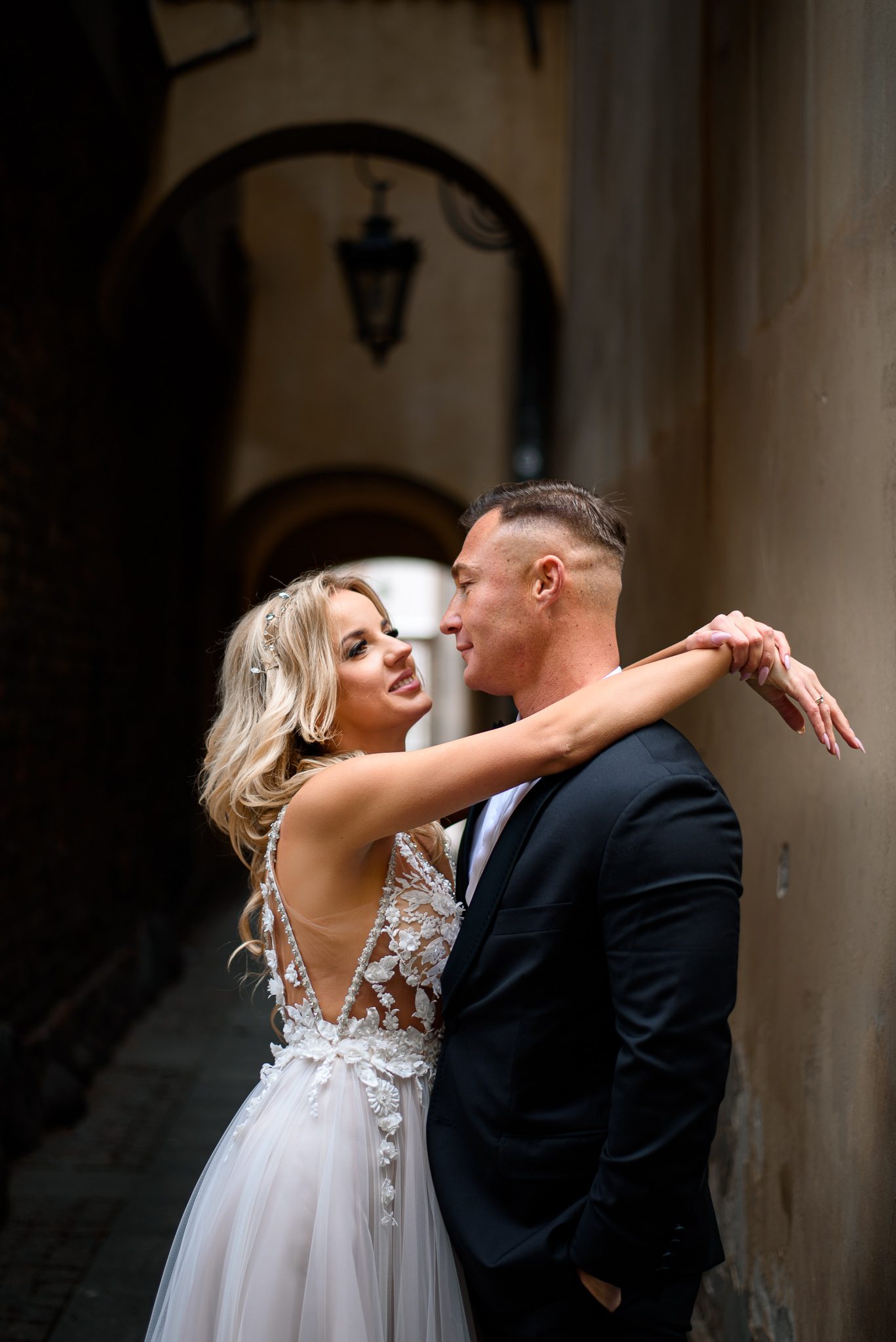 M&M wyglądali pięknie, ale to już wiecie. Był pełny makijaż i fryzura, pomimo weekendu i godzin porannych; suknia panny młodej, ale i garnitur oraz koszula pana młodego były wyprane, wyprasowane, buty wypastowane; wyglądali dokładnie tak samo dobrze jak w dniu ślubu 🙂 To naprawdę bardzo ważne! Wasz wygląd to absolutnie i bezwzględnie najważniejsza rzecz podczas sesji zdjęciowej. KAŻDEJ! Oczywiście, niektóre rzeczy da się poprawić w postprodukcji, ale nie wszystko 😉 Pamiętajcie o tym: my w czasie pracy z Wami wymagamy od siebie 120%; byłoby świetnie, gdybyście podchodzili do tego tak samo, tak jak M&M 🙂 Na szczęście obeszło się też bez maseczek – co prawda policja namiętnie patrolowała stare miasto, ale w momencie, gdy widzieli parę młodą w strojach ślubnych jedynie się uśmiechali z samochodów 😉
