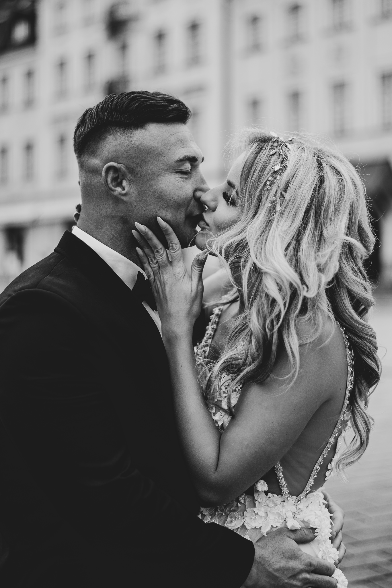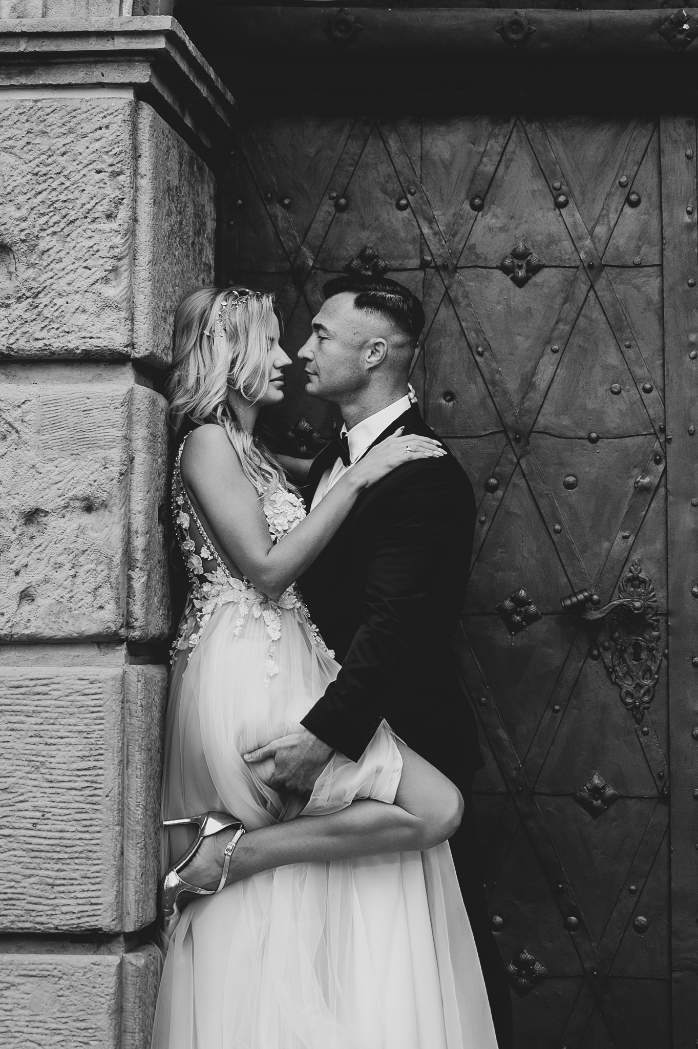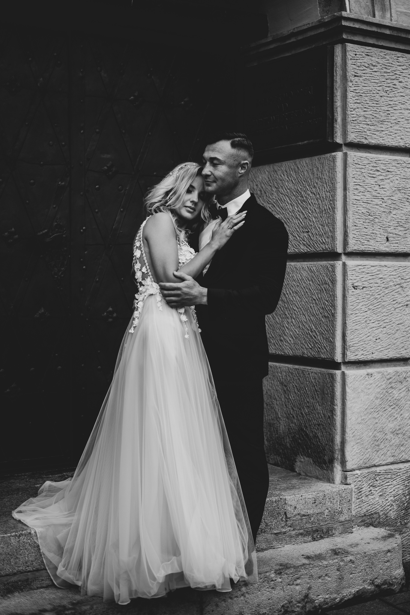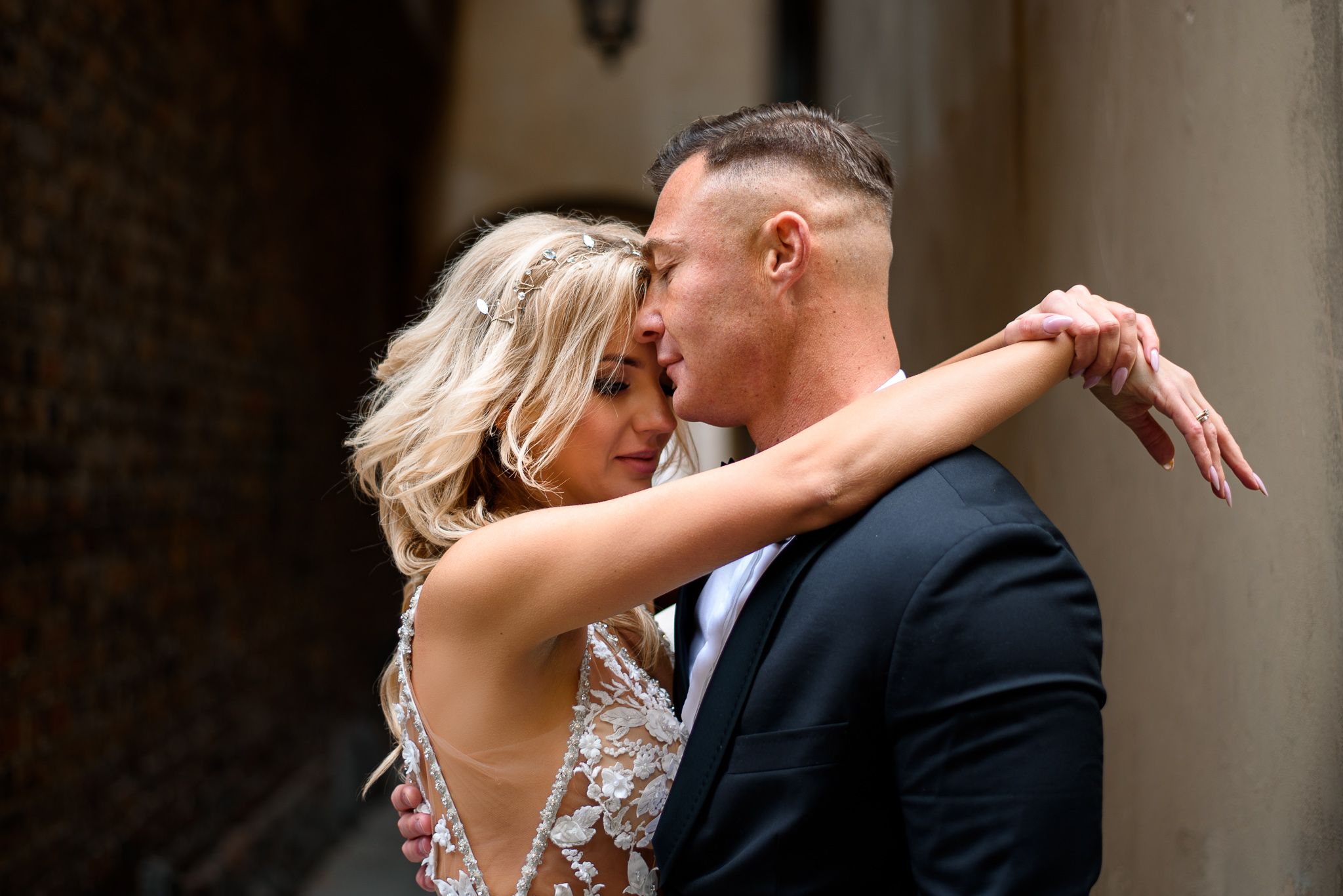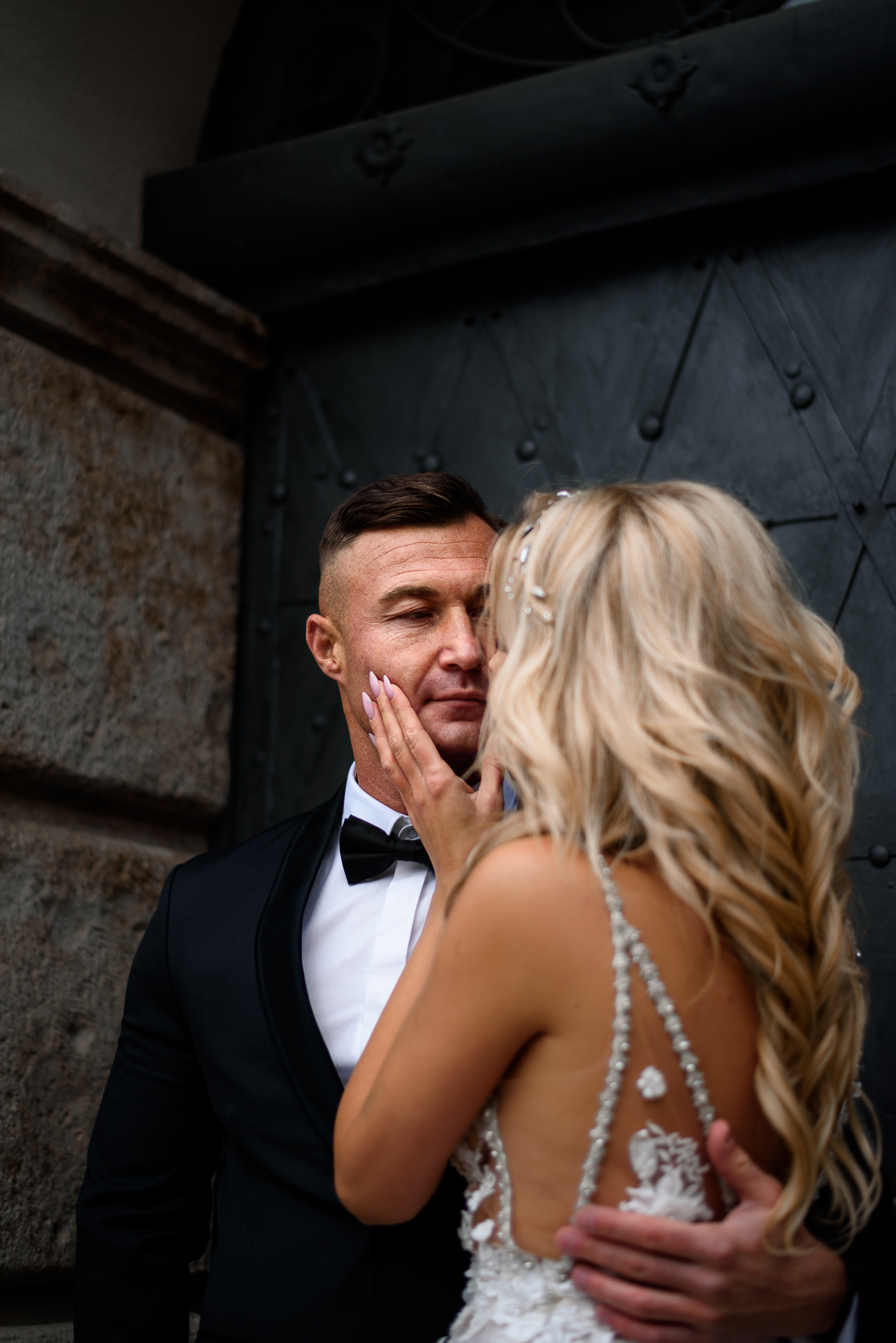 M&M wyglądali pięknie, ale to już wiecie. Był pełny makijaż i fryzura, pomimo weekendu i godzin porannych; suknia panny młodej, ale i garnitur oraz koszula pana młodego były wyprane, wyprasowane, buty wypastowane; wyglądali dokładnie tak samo dobrze jak w dniu ślubu 🙂 To naprawdę bardzo ważne! Wasz wygląd to absolutnie i bezwzględnie najważniejsza rzecz podczas sesji zdjęciowej. KAŻDEJ! Oczywiście, niektóre rzeczy da się poprawić w postprodukcji, ale nie wszystko 😉 Pamiętajcie o tym: my w czasie pracy z Wami wymagamy od siebie 120%; byłoby świetnie, gdybyście podchodzili do tego tak samo, tak jak M&M 🙂 Na szczęście obeszło się też bez maseczek – co prawda policja namiętnie patrolowała stare miasto, ale w momencie, gdy widzieli parę młodą w strojach ślubnych jedynie się uśmiechali z samochodów 😉