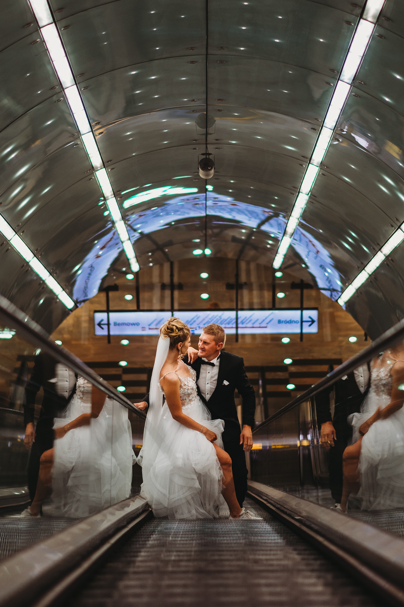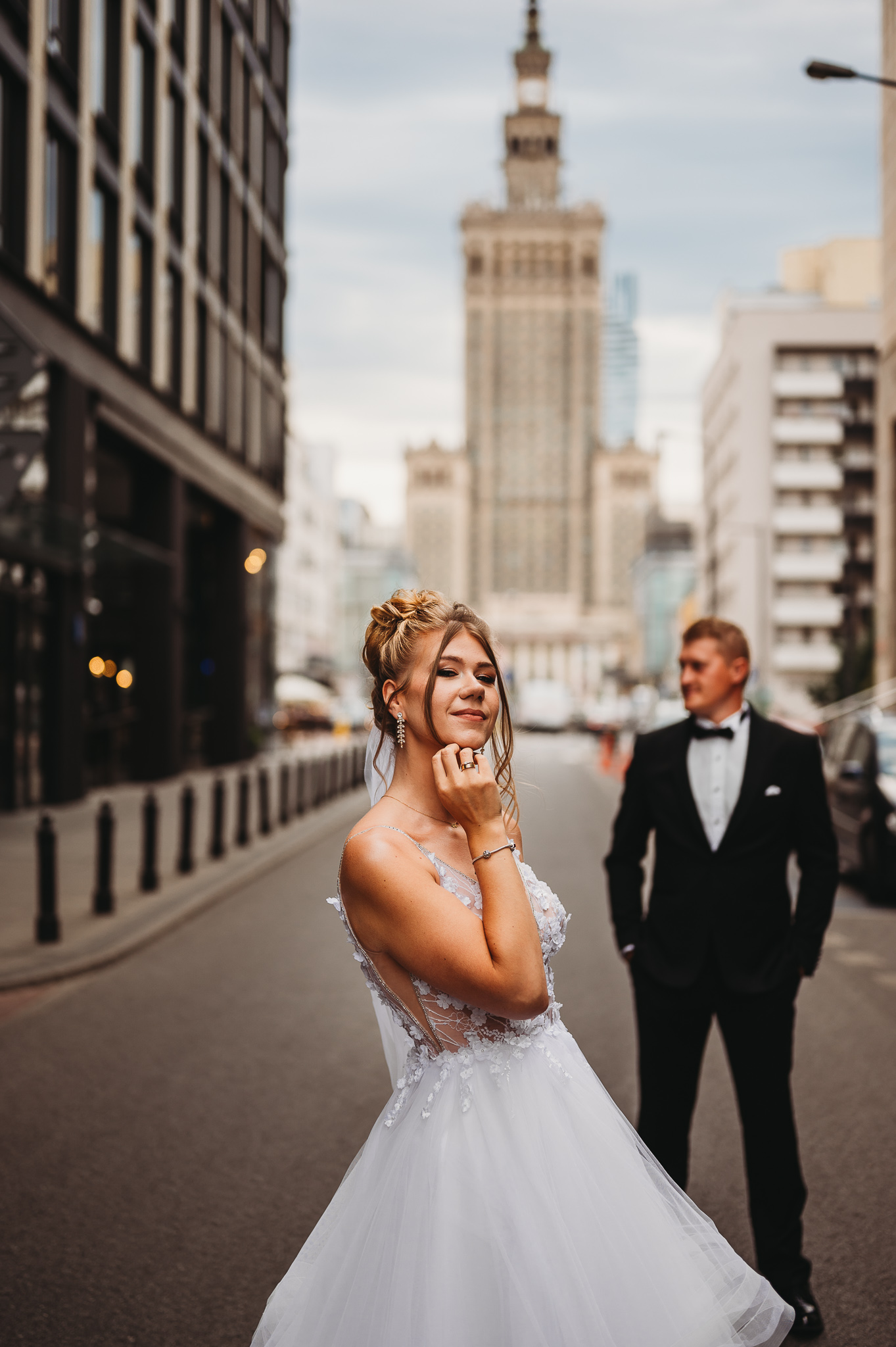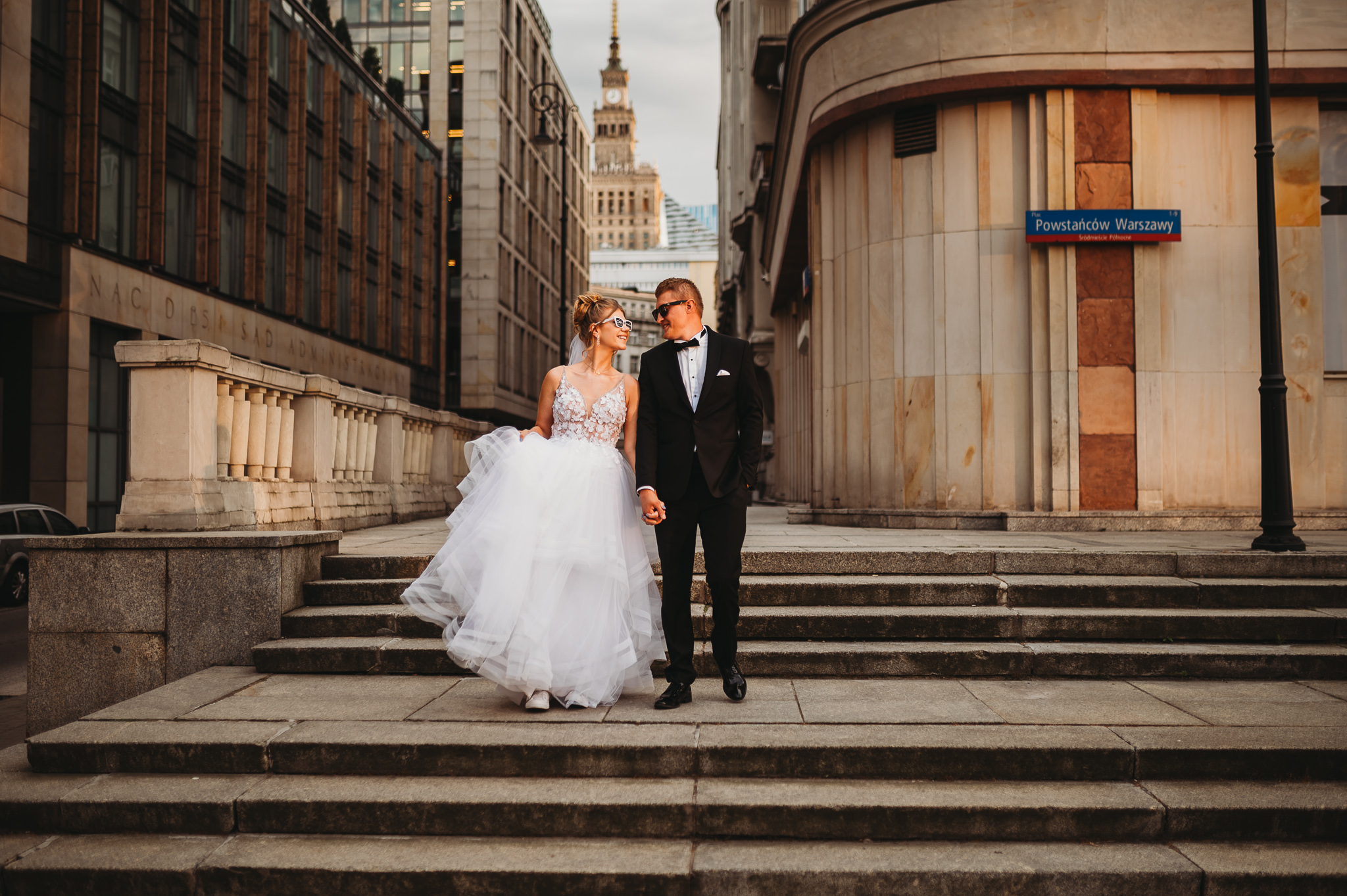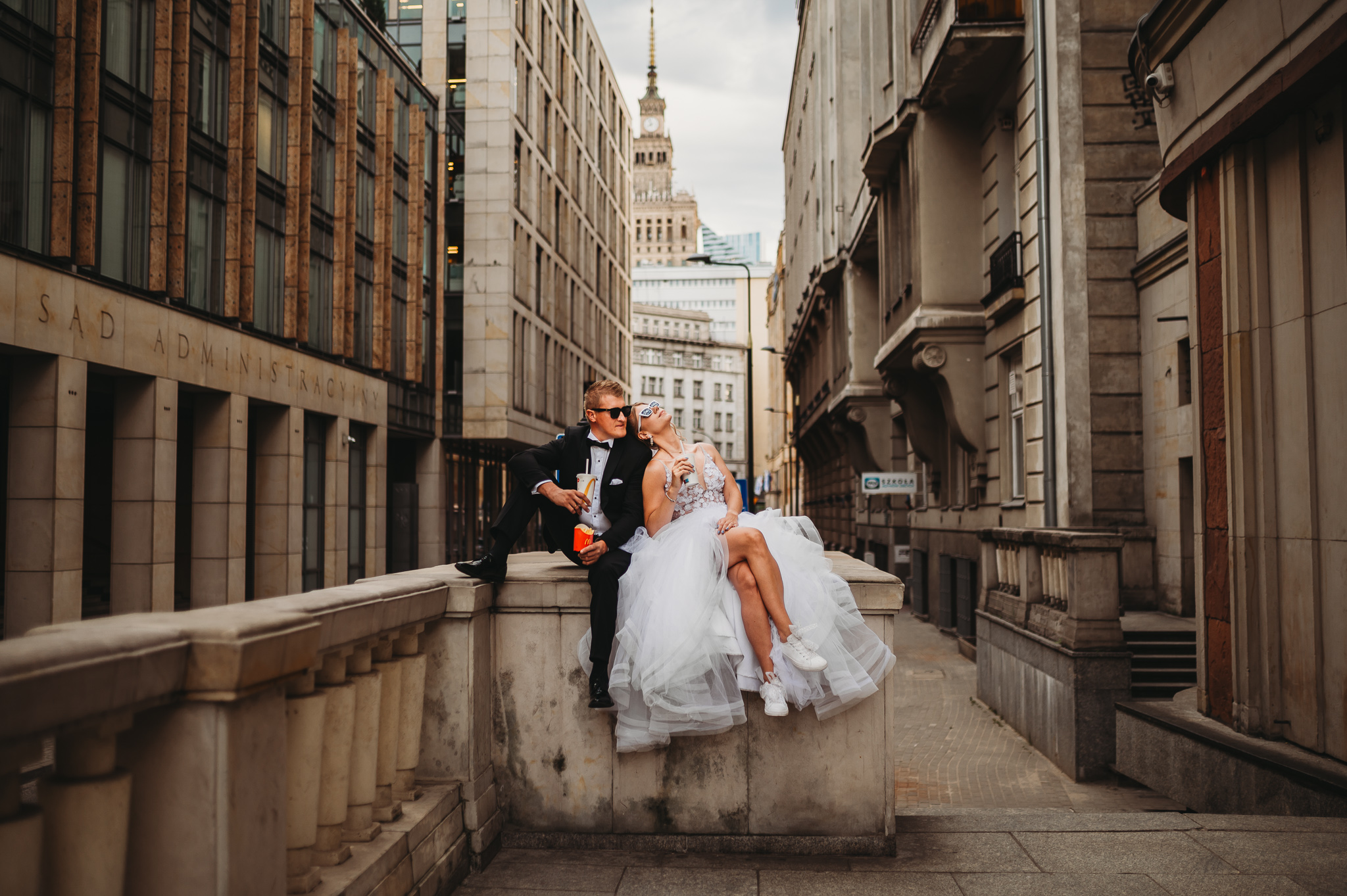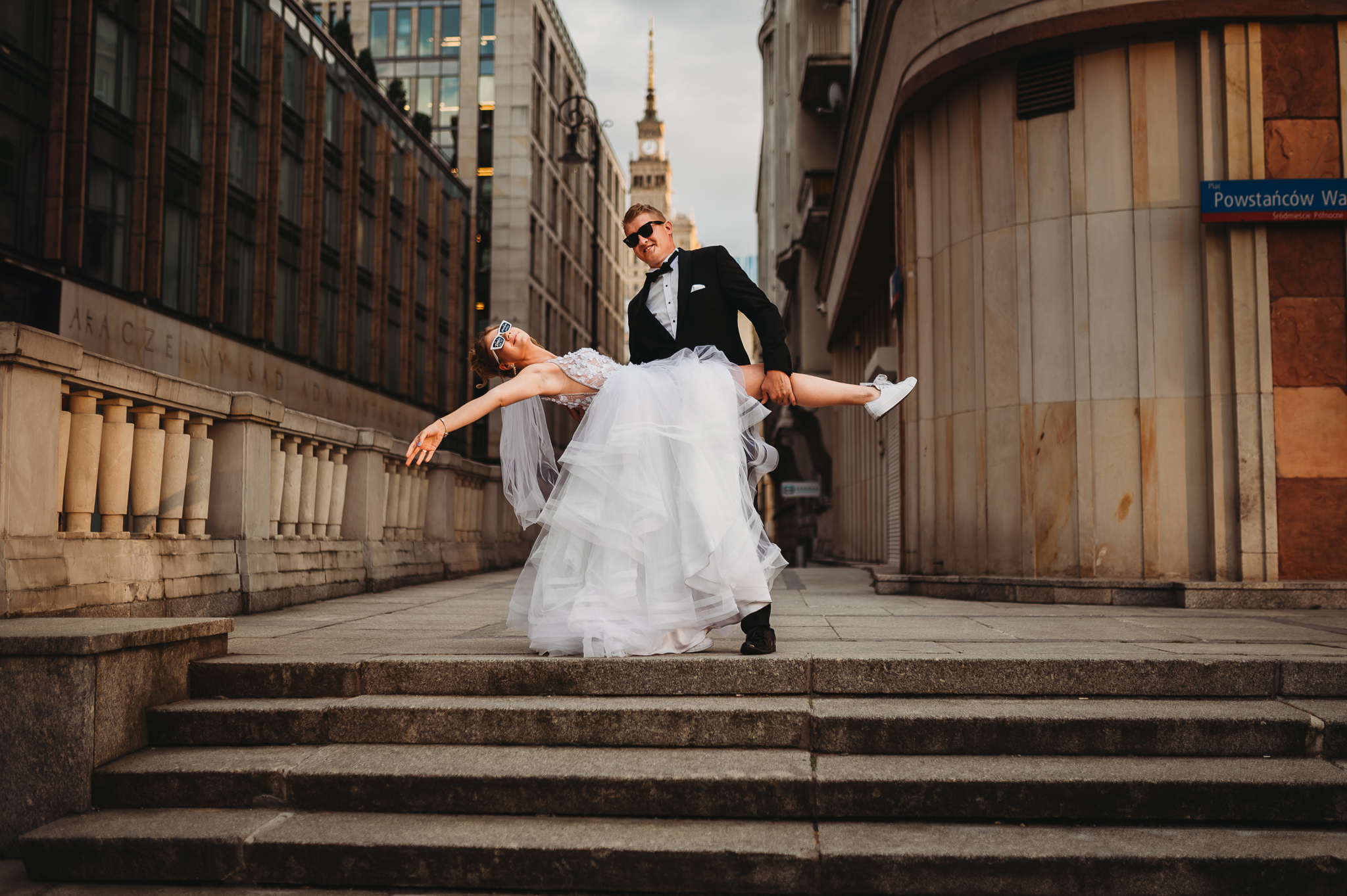 Prawdziwie warszawska sesja – ten urbanistyczny akcent wprowadza niepowtarzalną atmosferę, która idealnie koresponduje z energią nowożeńców. Bardzo pomysłowe ujęcia!