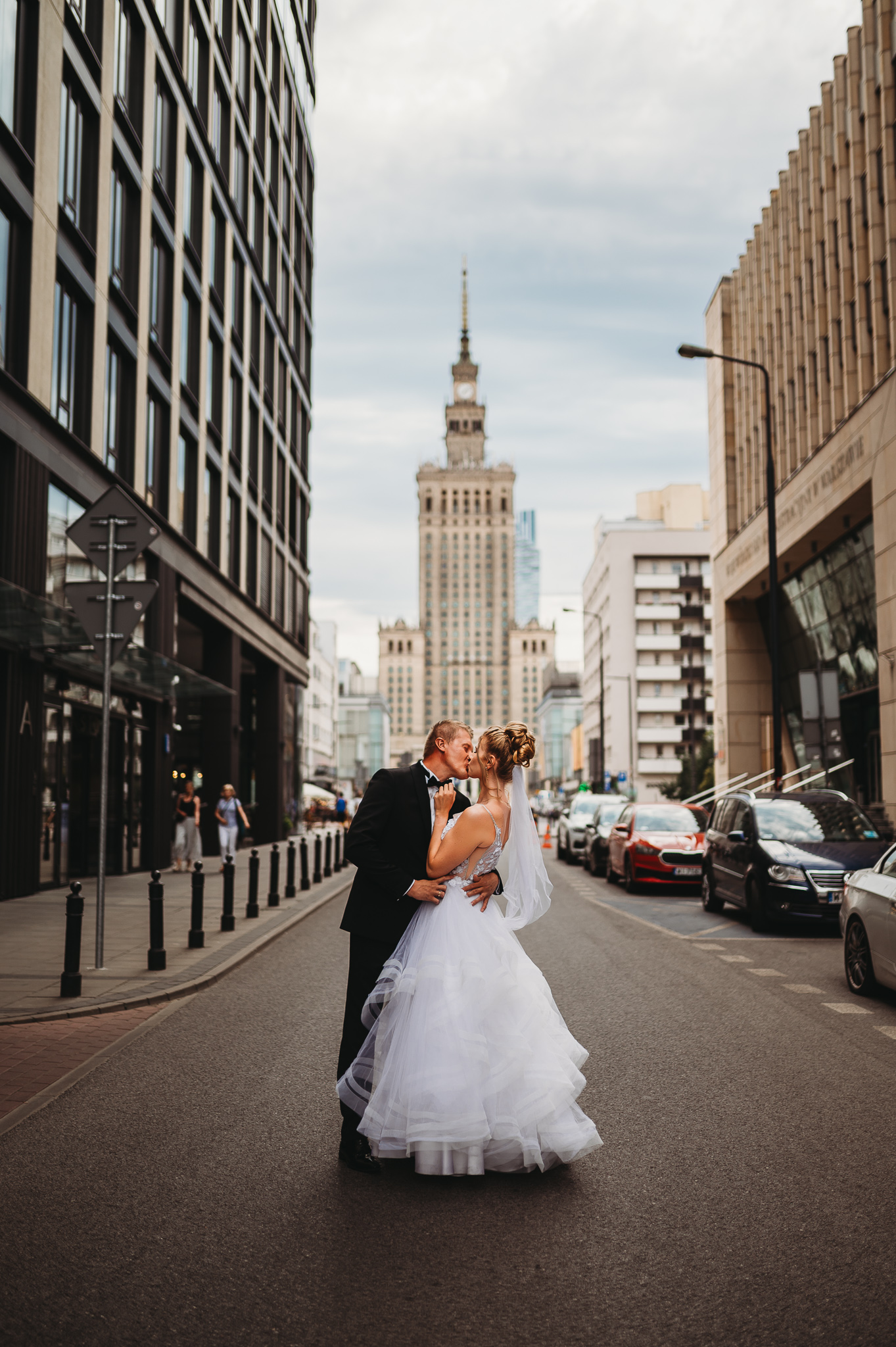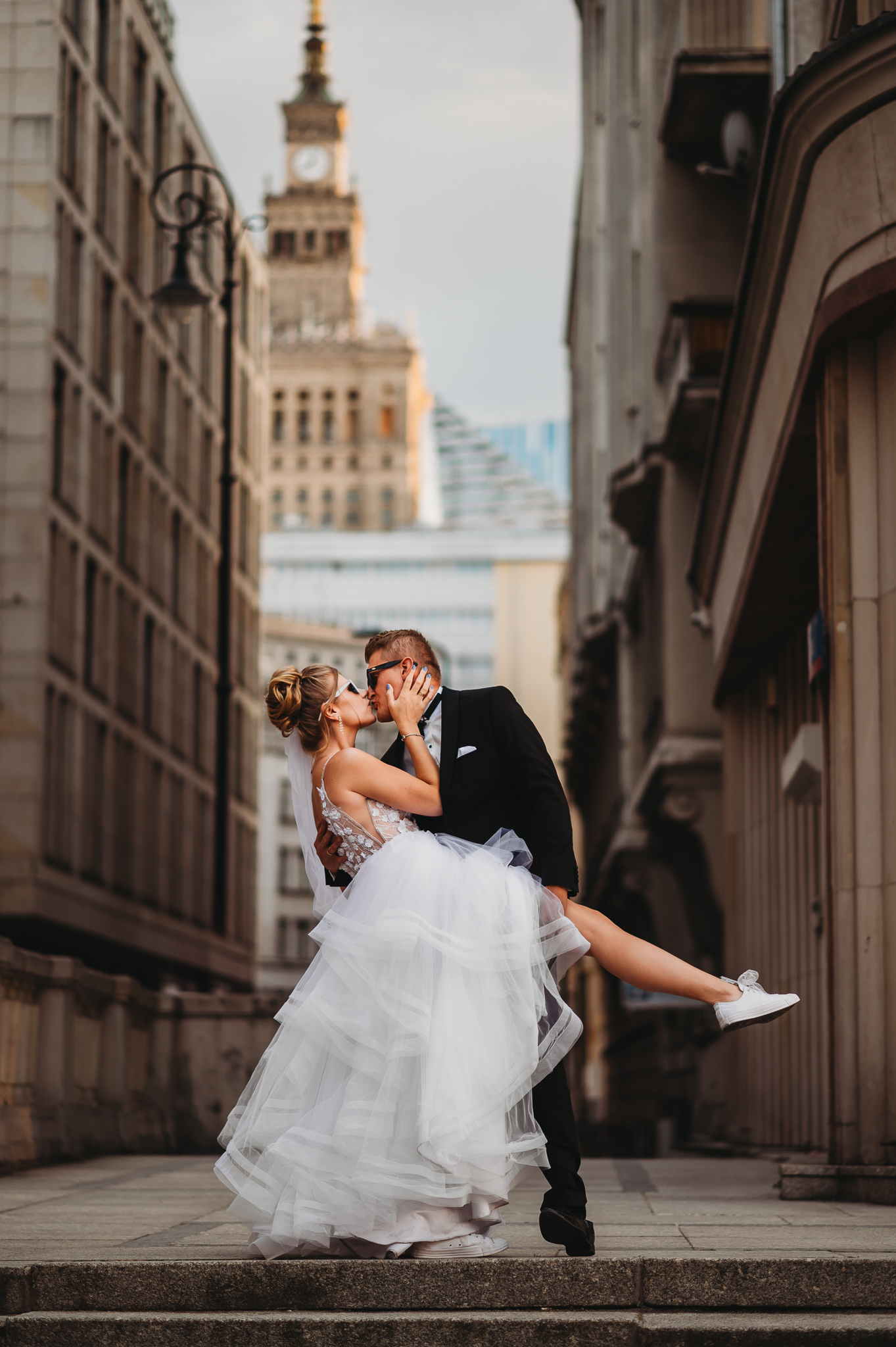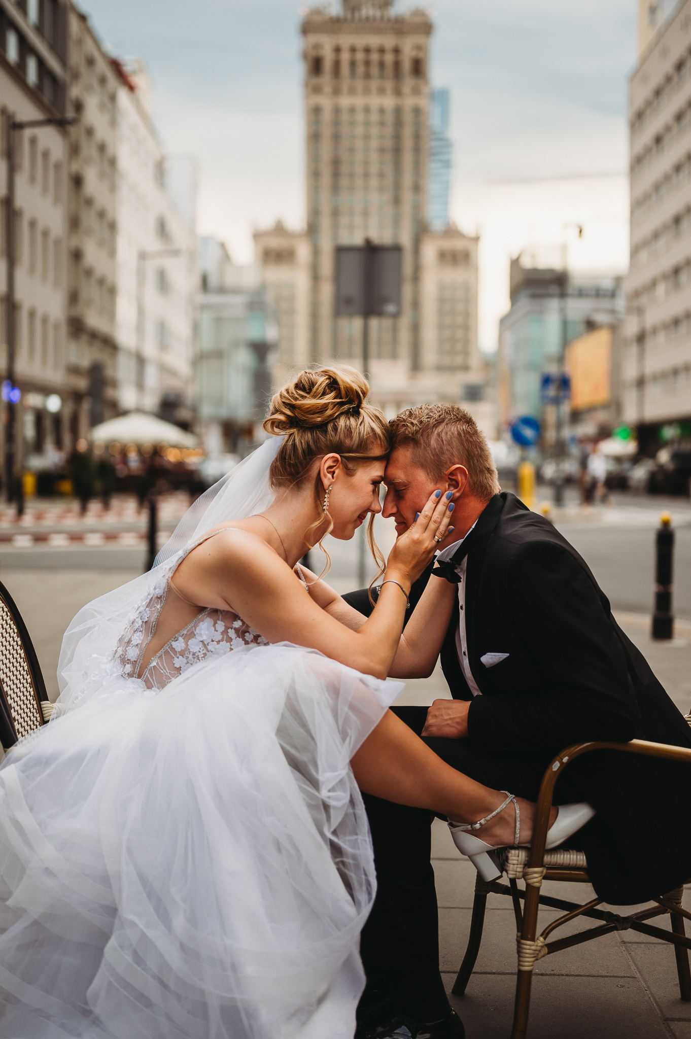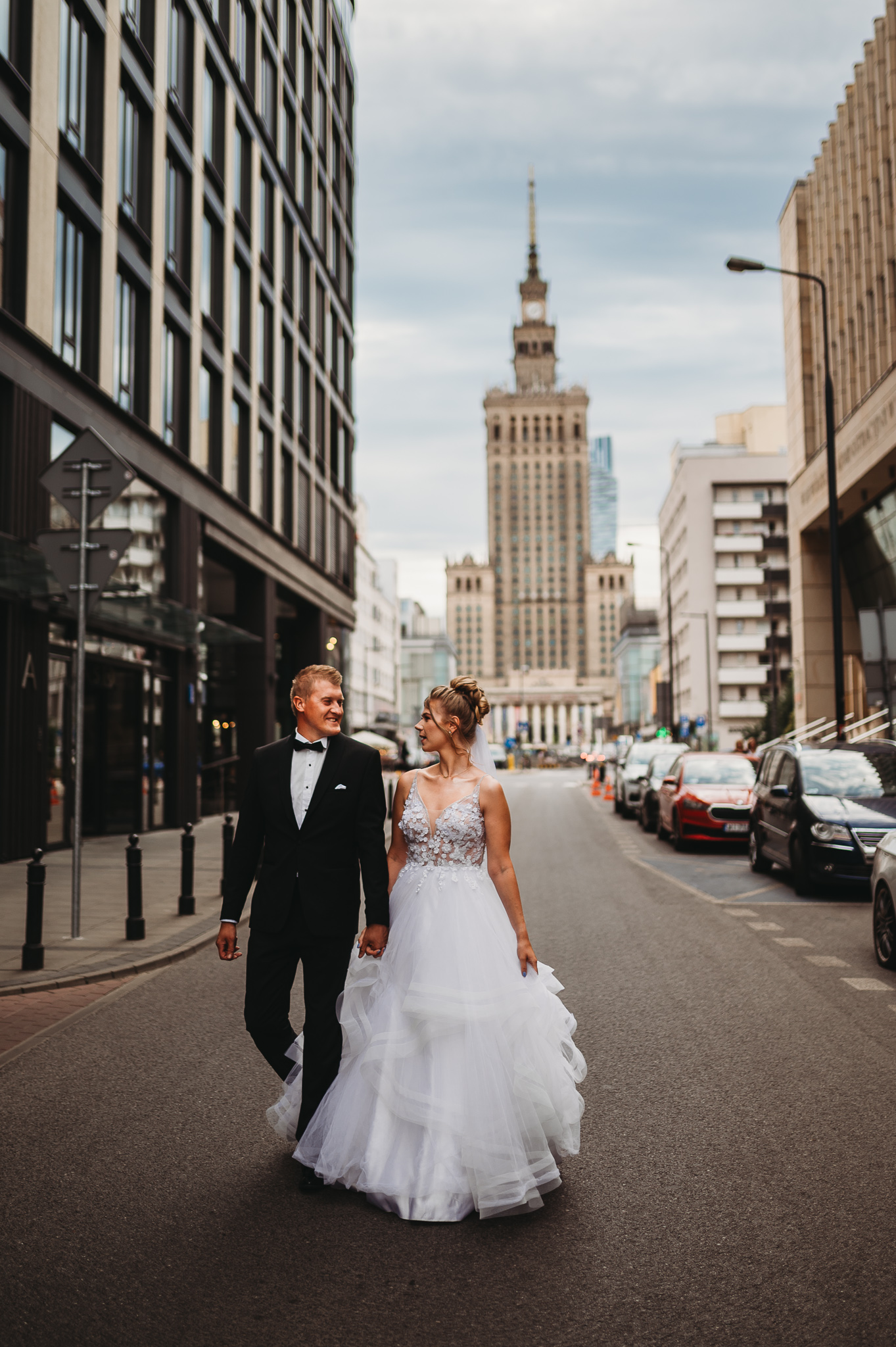 Prawdziwie warszawska sesja – ten urbanistyczny akcent wprowadza niepowtarzalną atmosferę, która idealnie koresponduje z energią nowożeńców. Bardzo pomysłowe ujęcia!
