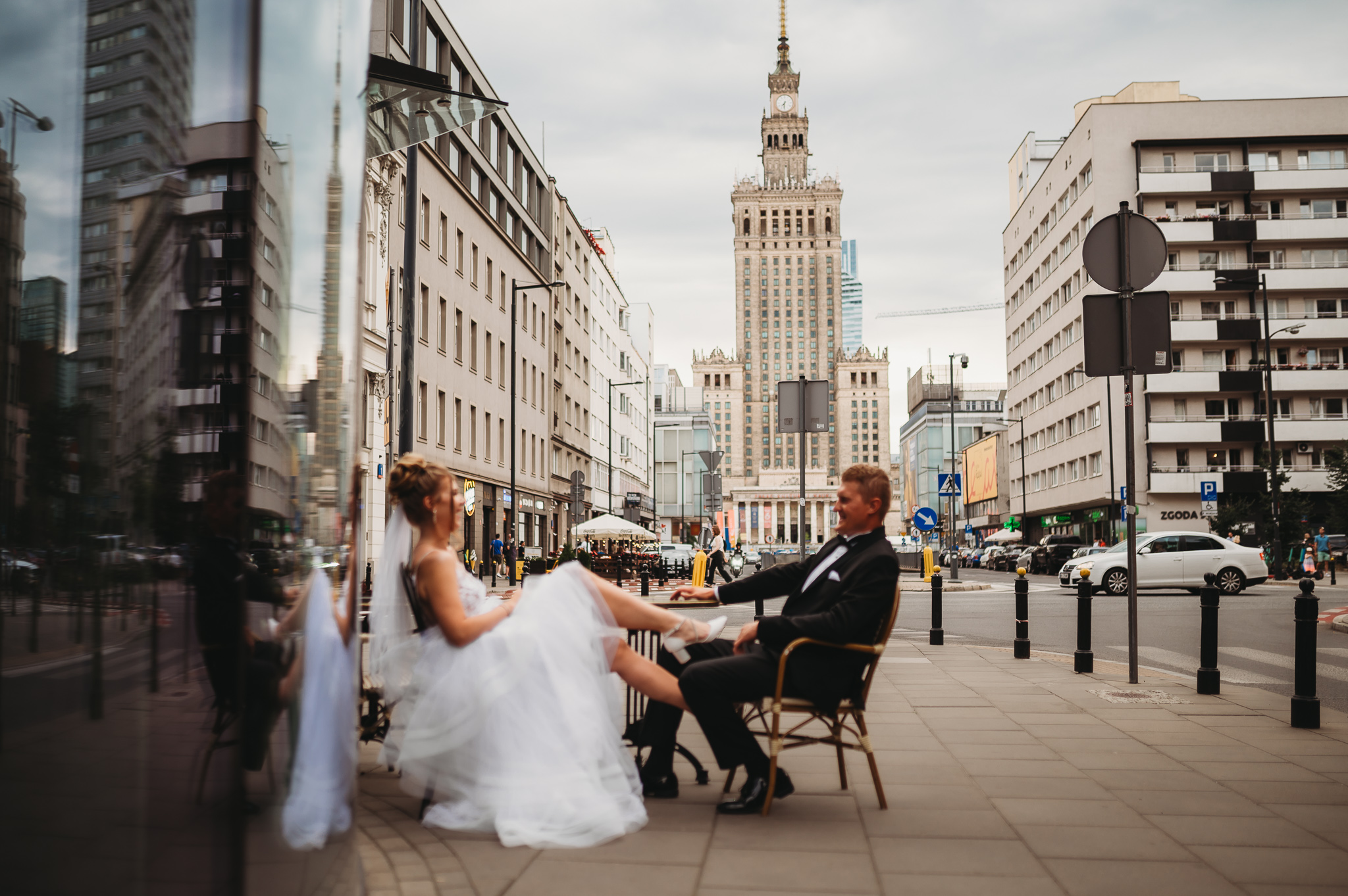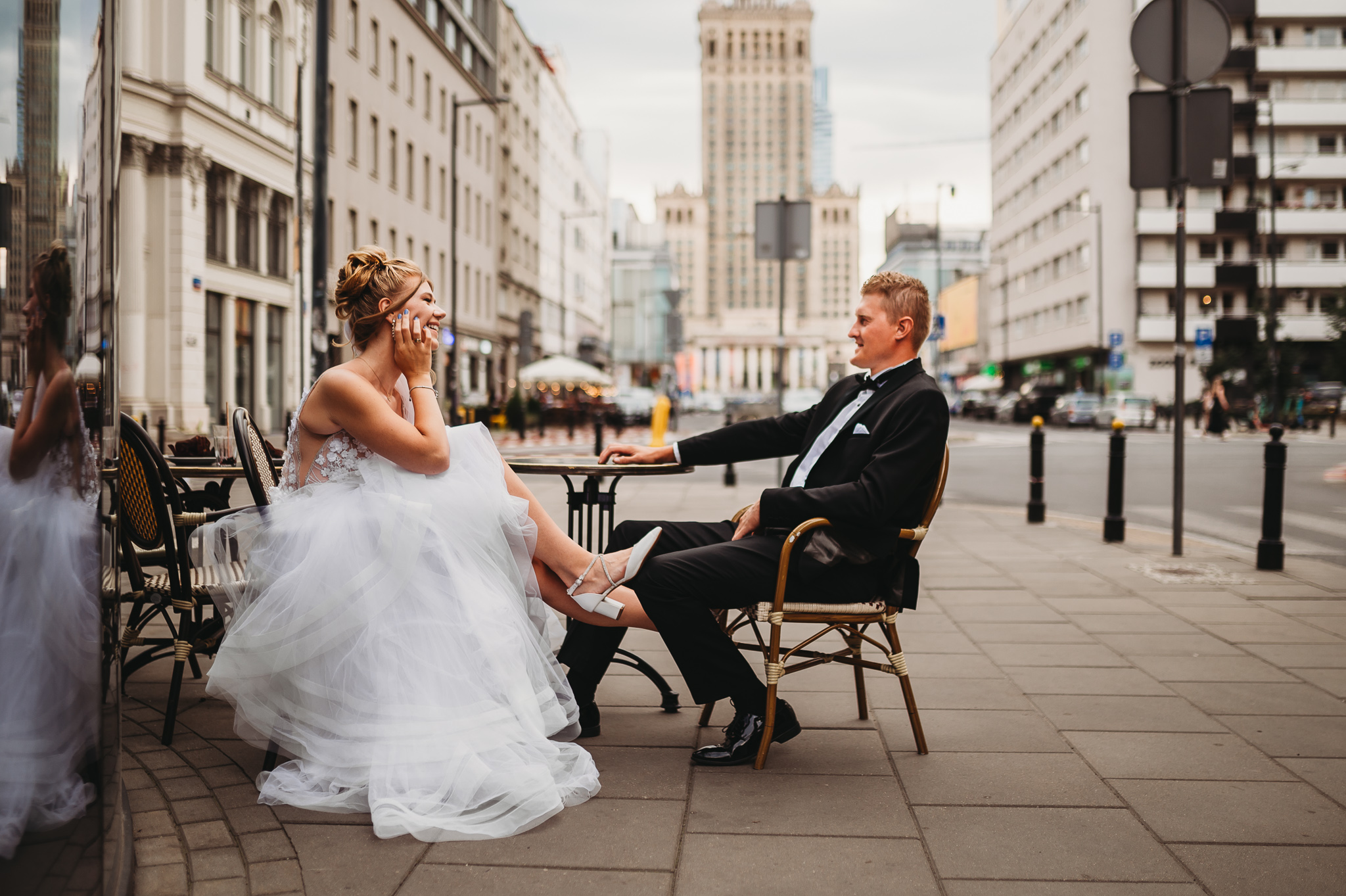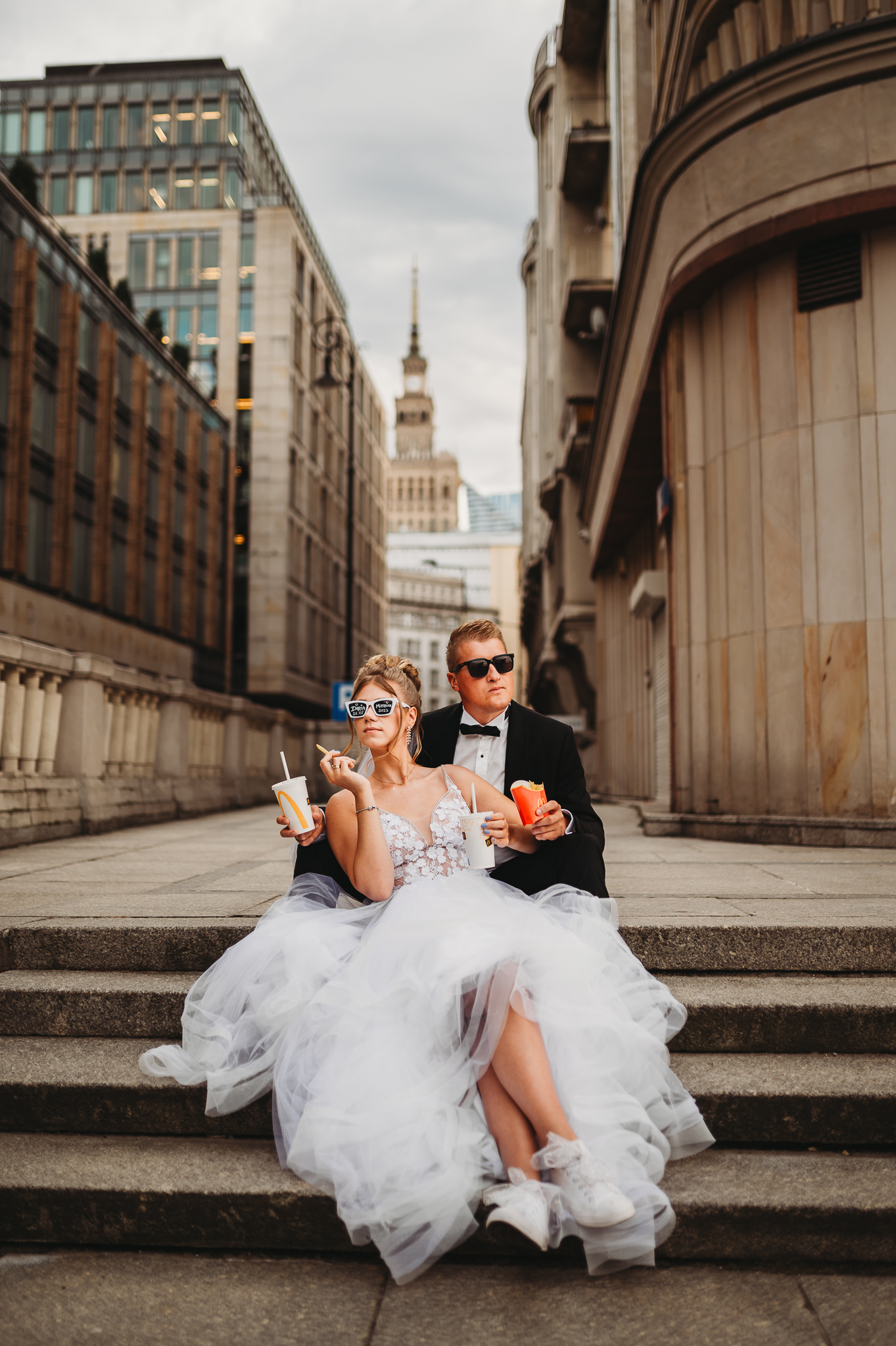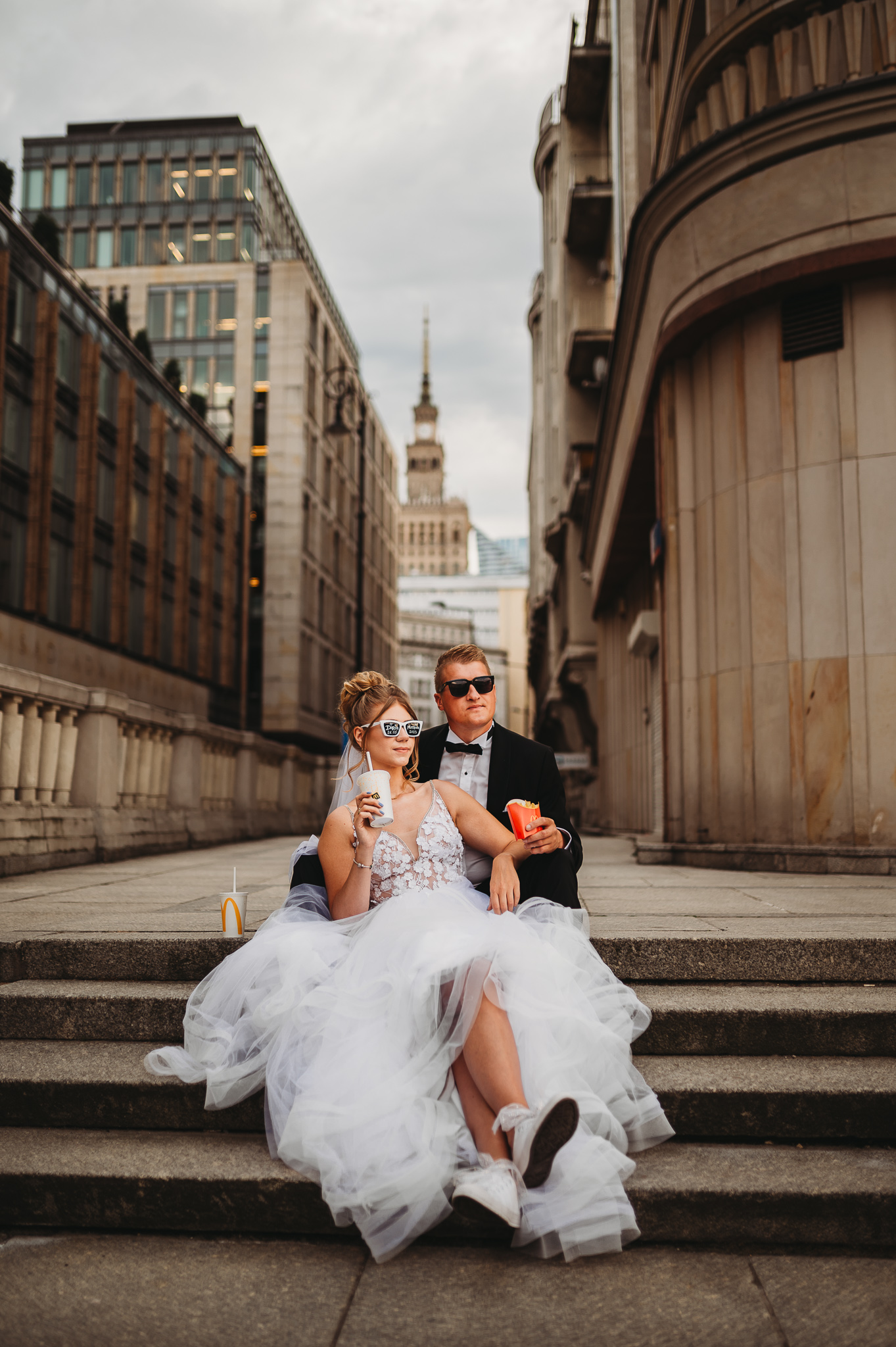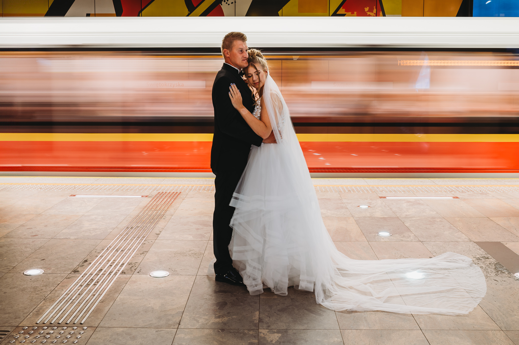 Prawdziwie warszawska sesja – ten urbanistyczny akcent wprowadza niepowtarzalną atmosferę, która idealnie koresponduje z energią nowożeńców. Bardzo pomysłowe ujęcia!