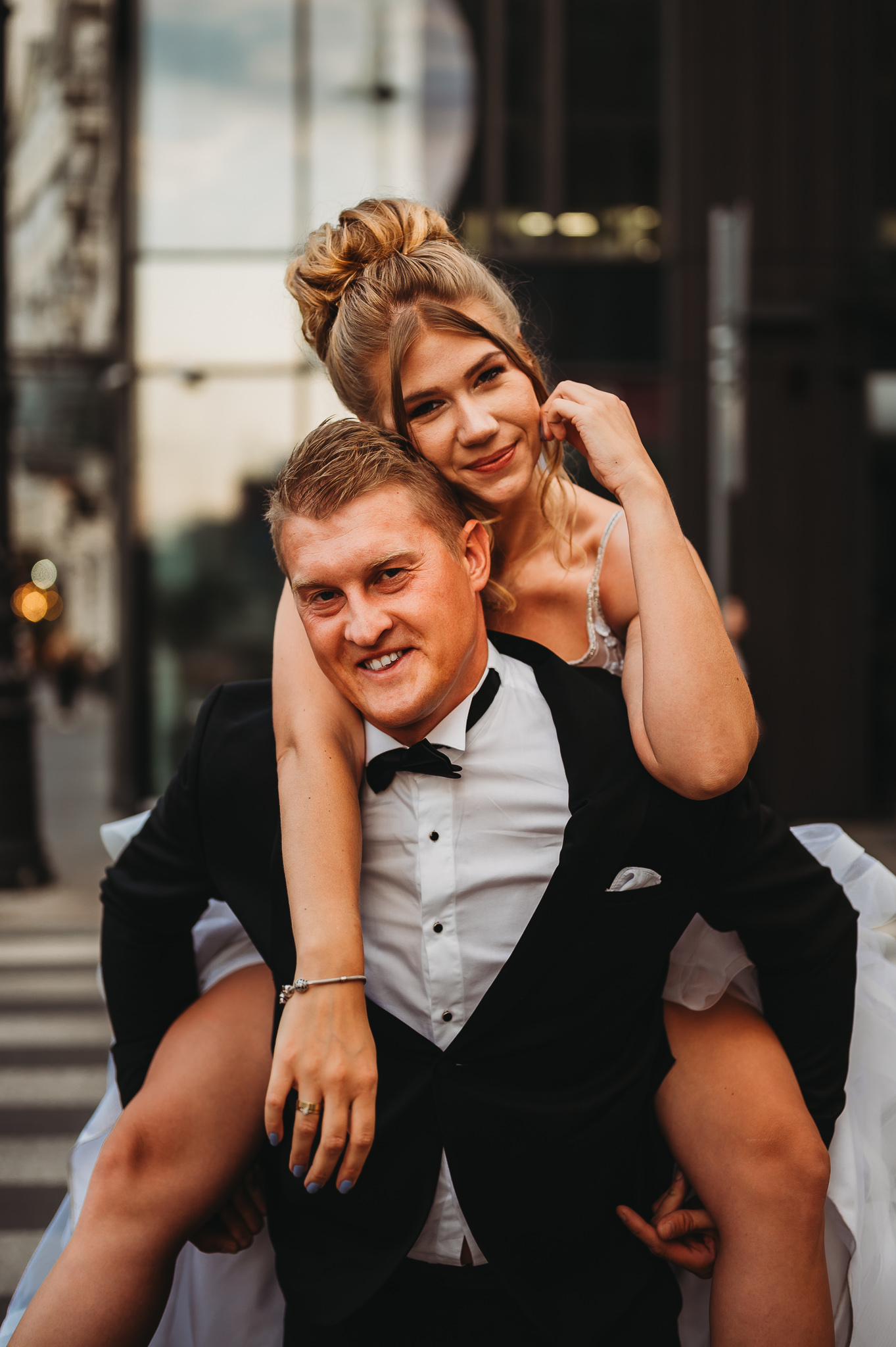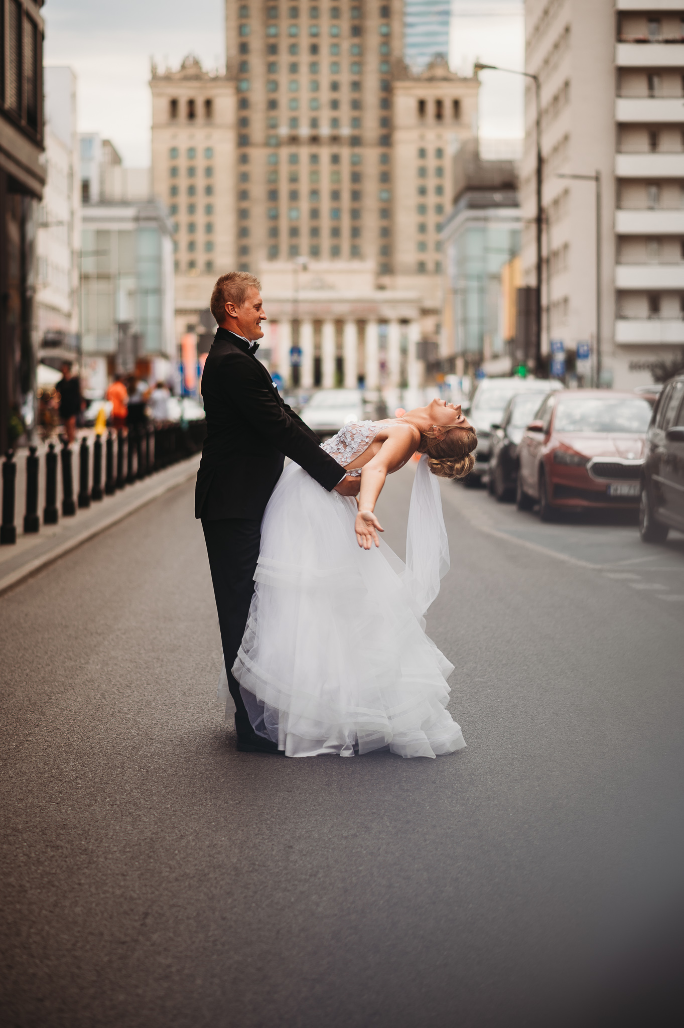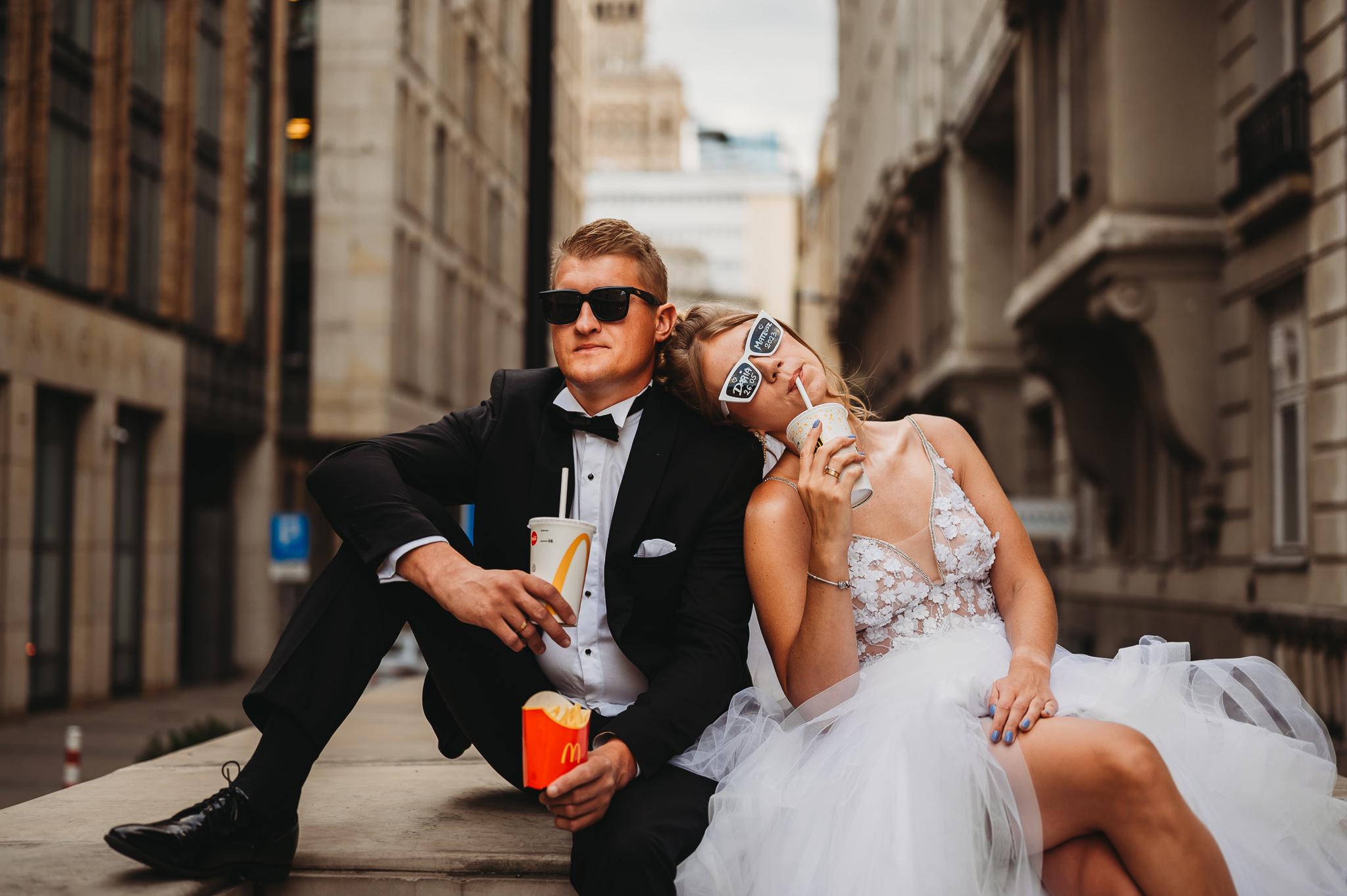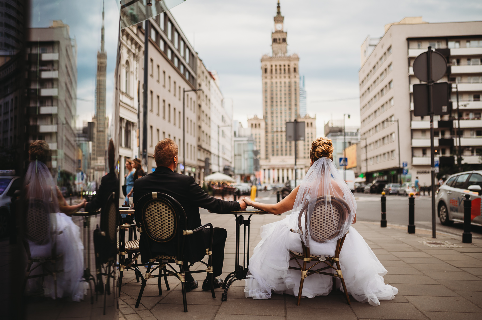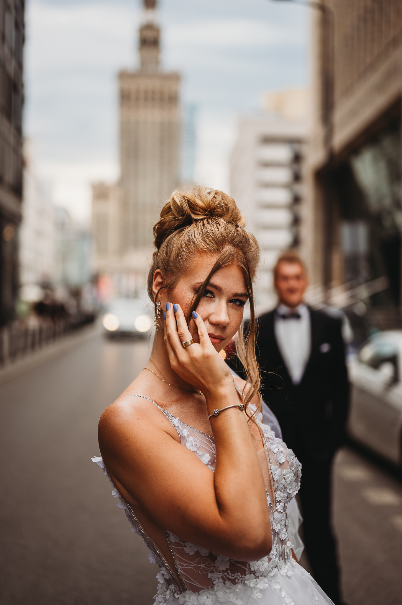 Prawdziwie warszawska sesja – ten urbanistyczny akcent wprowadza niepowtarzalną atmosferę, która idealnie koresponduje z energią nowożeńców. Bardzo pomysłowe ujęcia!