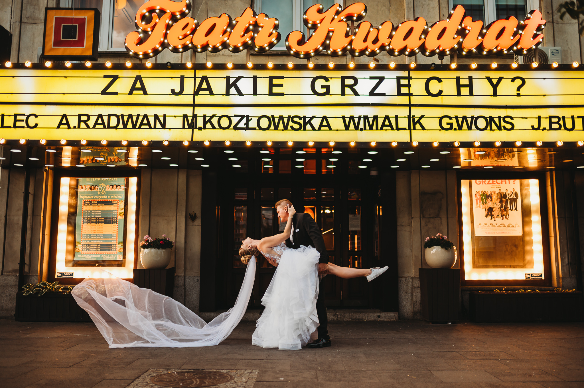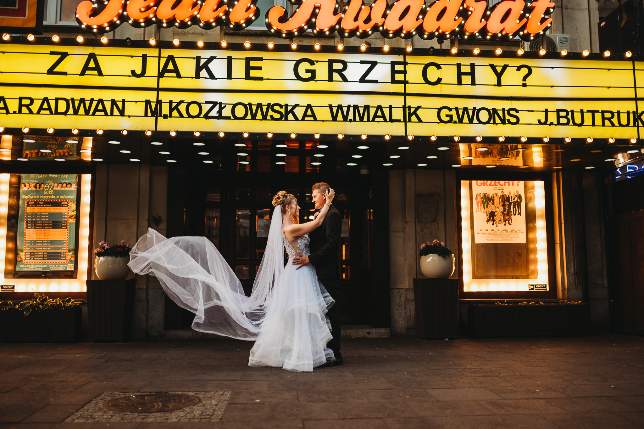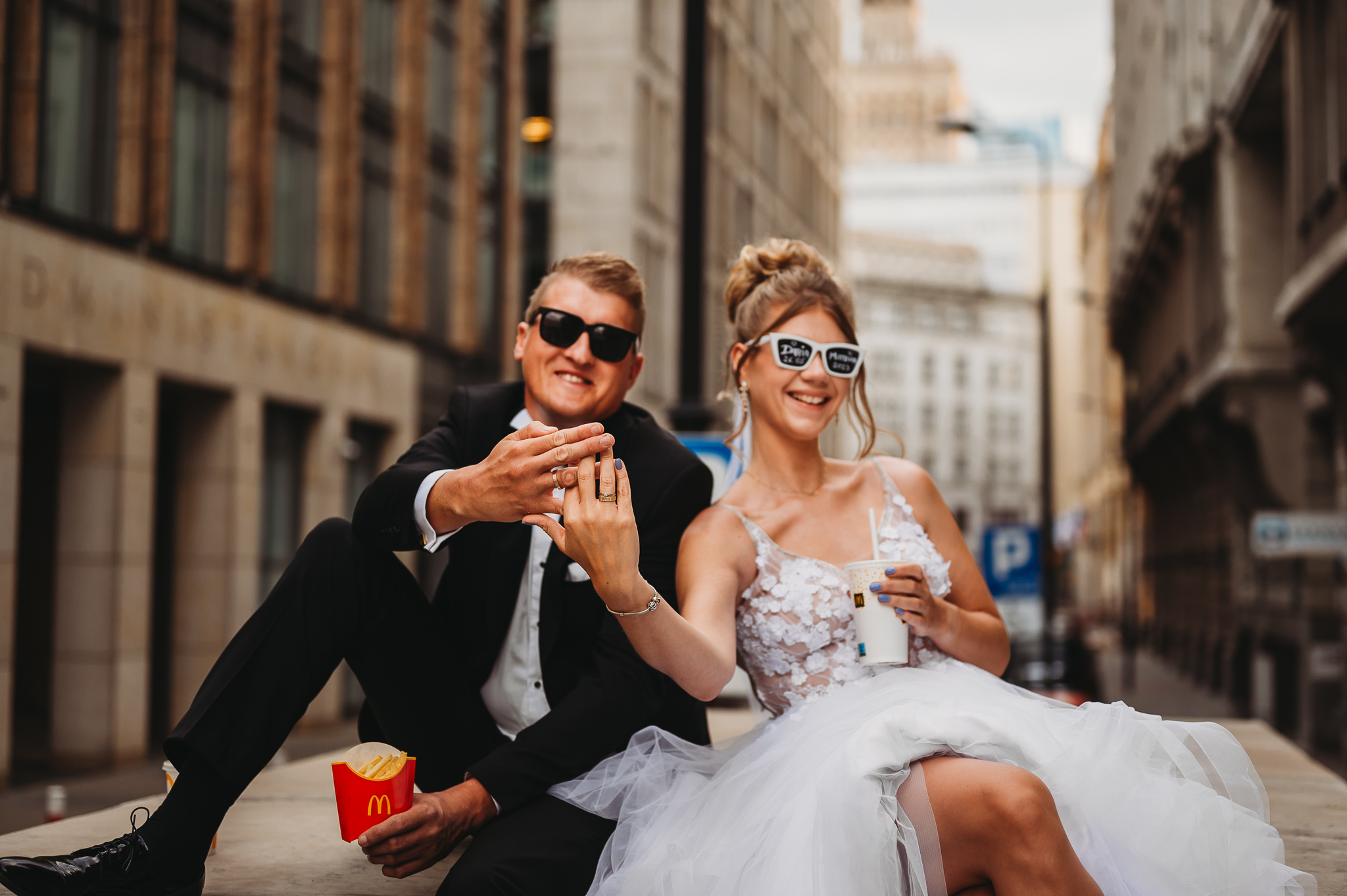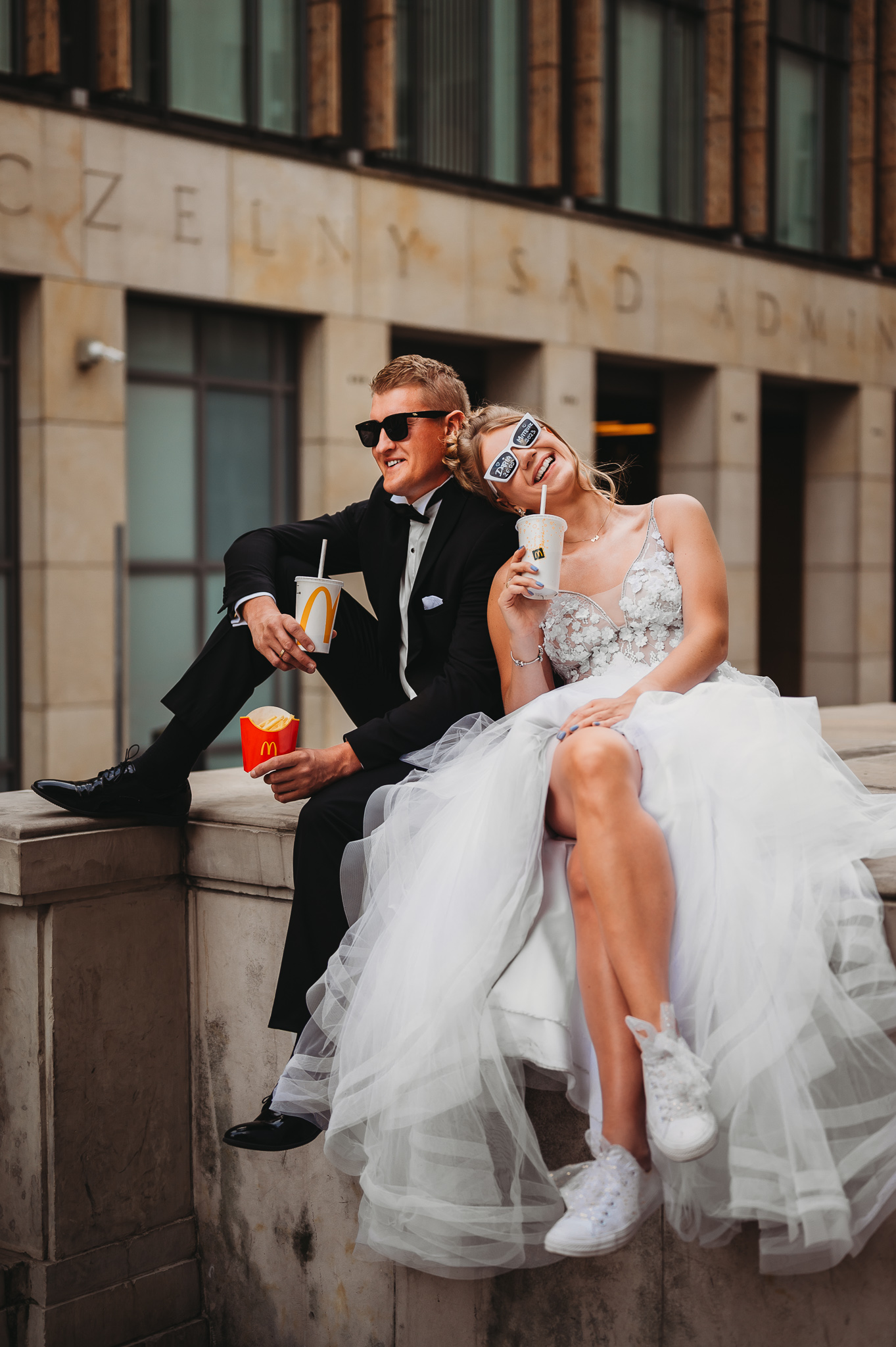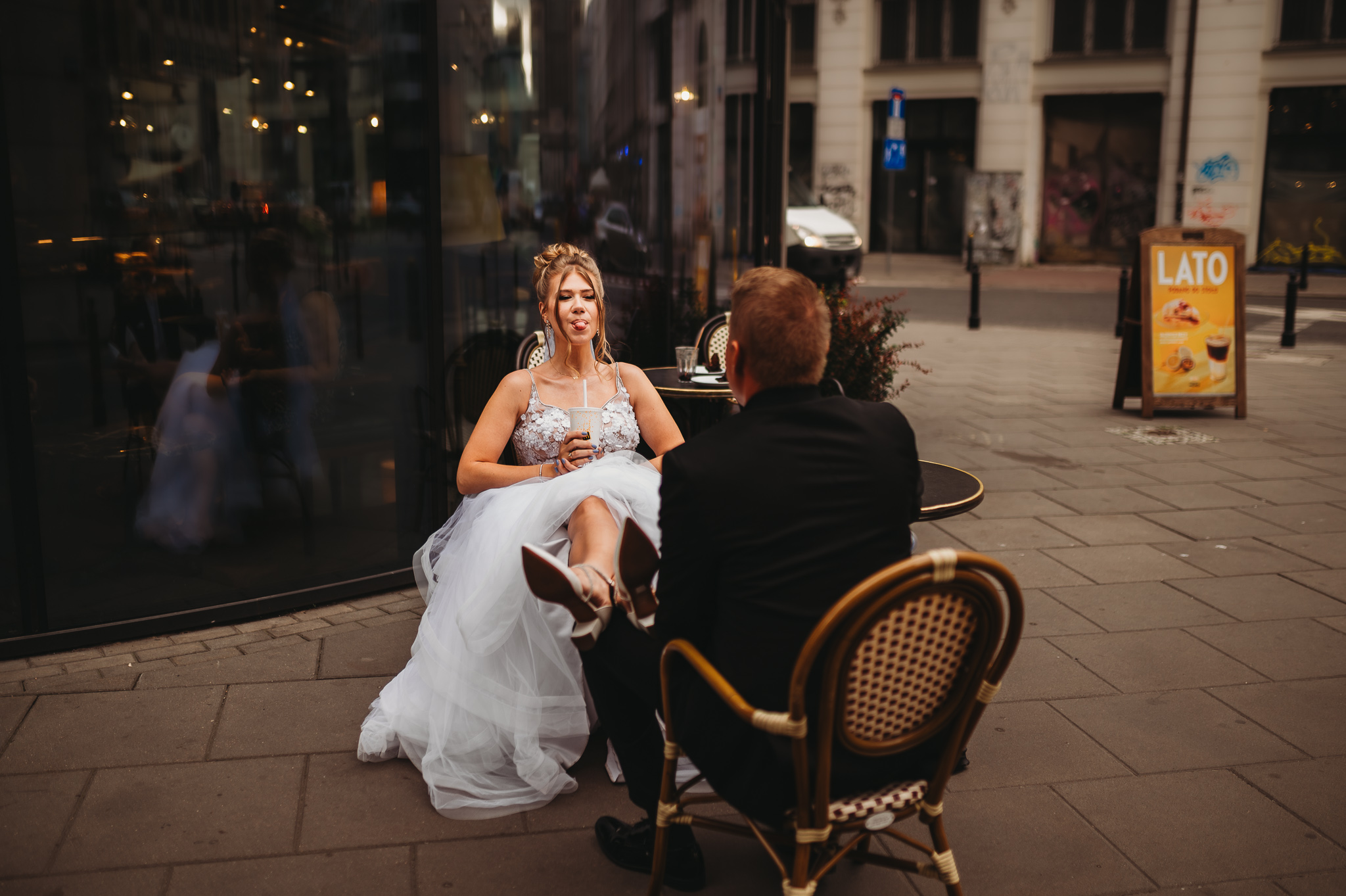Prawdziwie warszawska sesja – ten urbanistyczny akcent wprowadza niepowtarzalną atmosferę, która idealnie koresponduje z energią nowożeńców. Bardzo pomysłowe ujęcia!