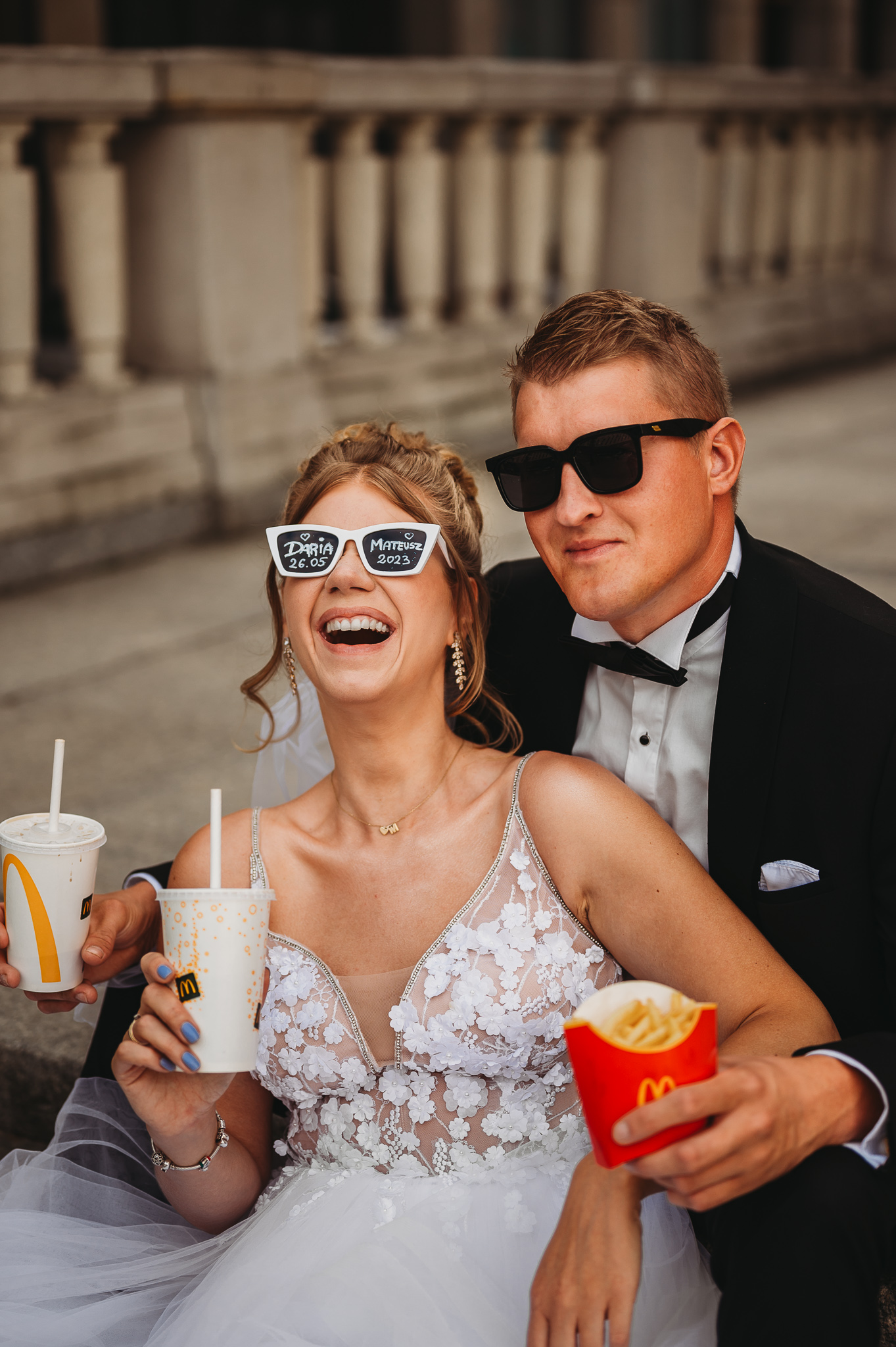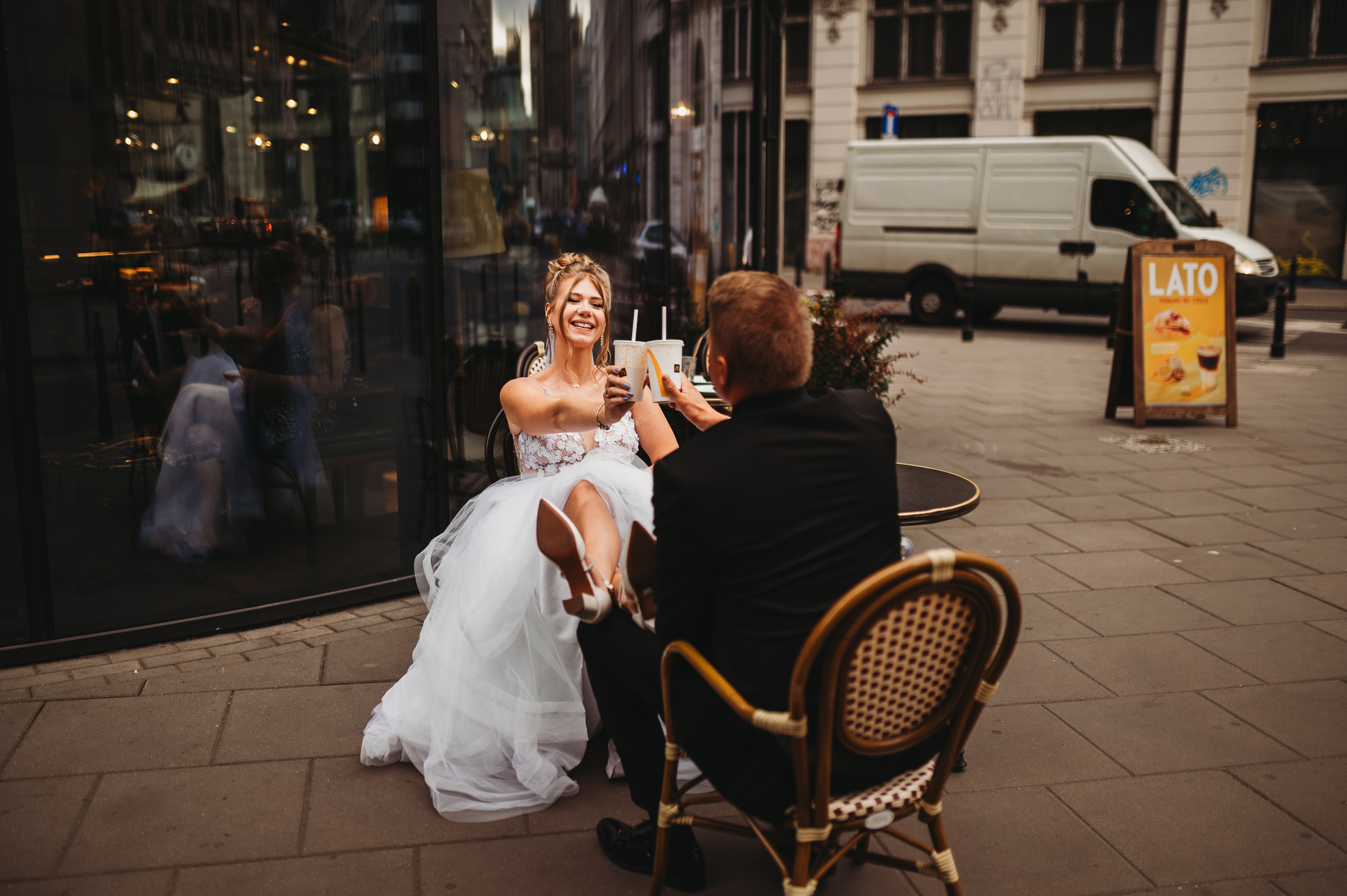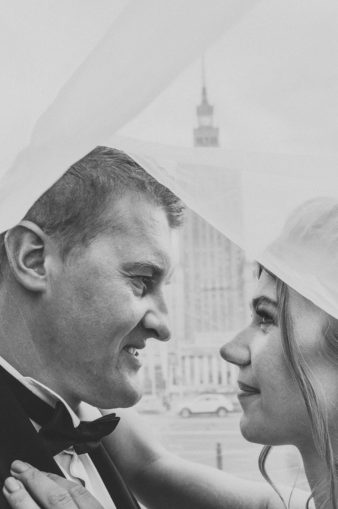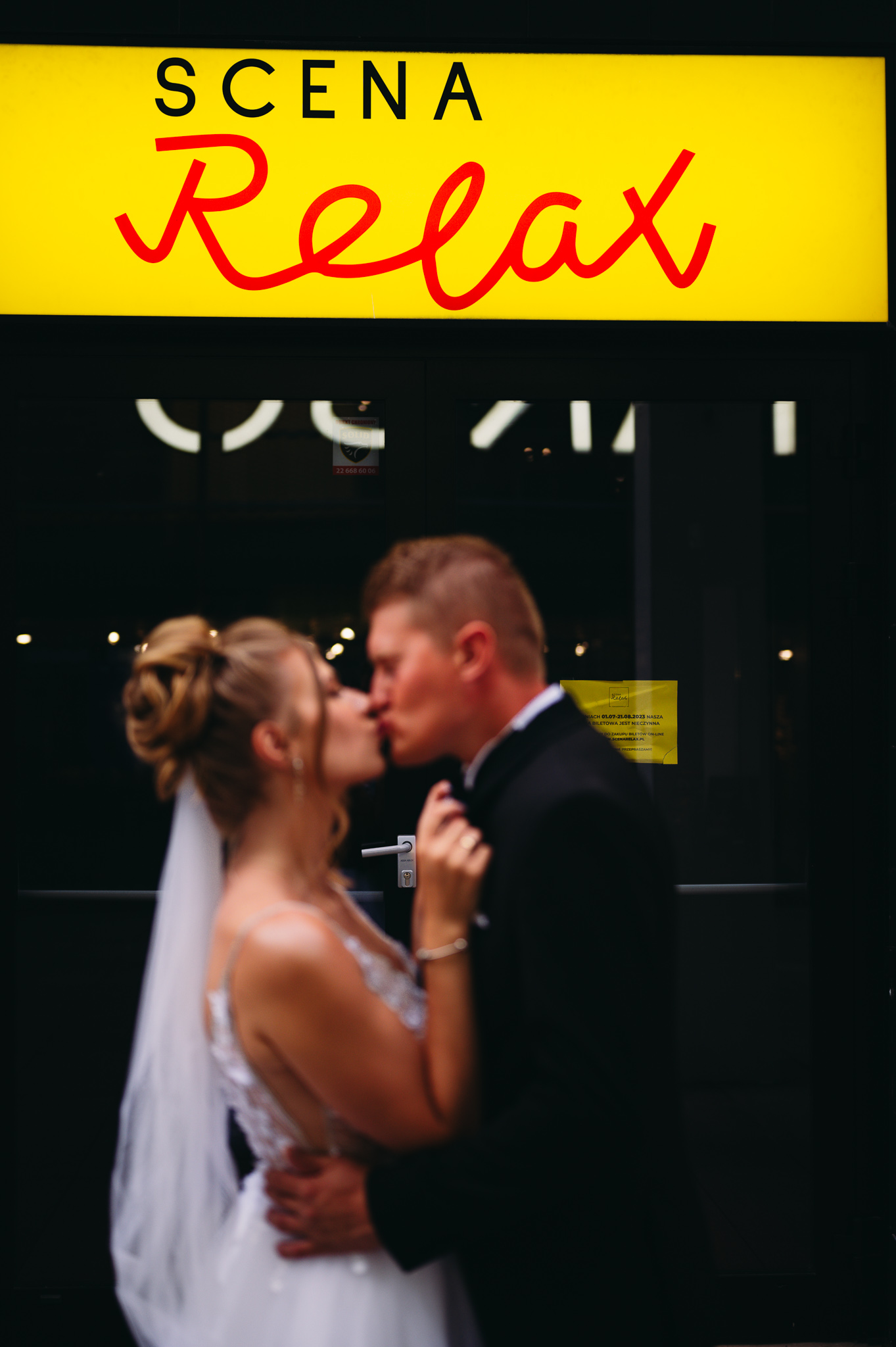 Prawdziwie warszawska sesja – ten urbanistyczny akcent wprowadza niepowtarzalną atmosferę, która idealnie koresponduje z energią nowożeńców. Bardzo pomysłowe ujęcia!