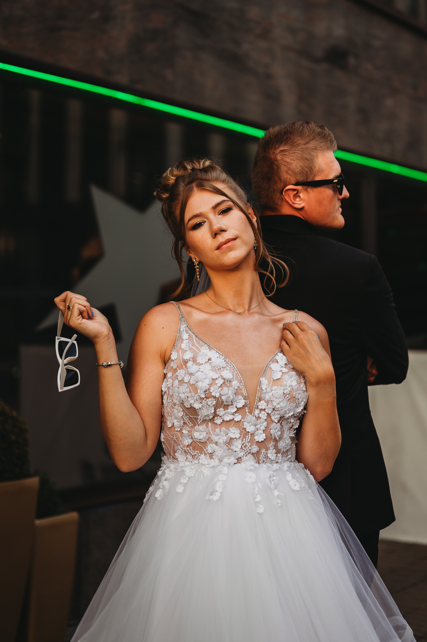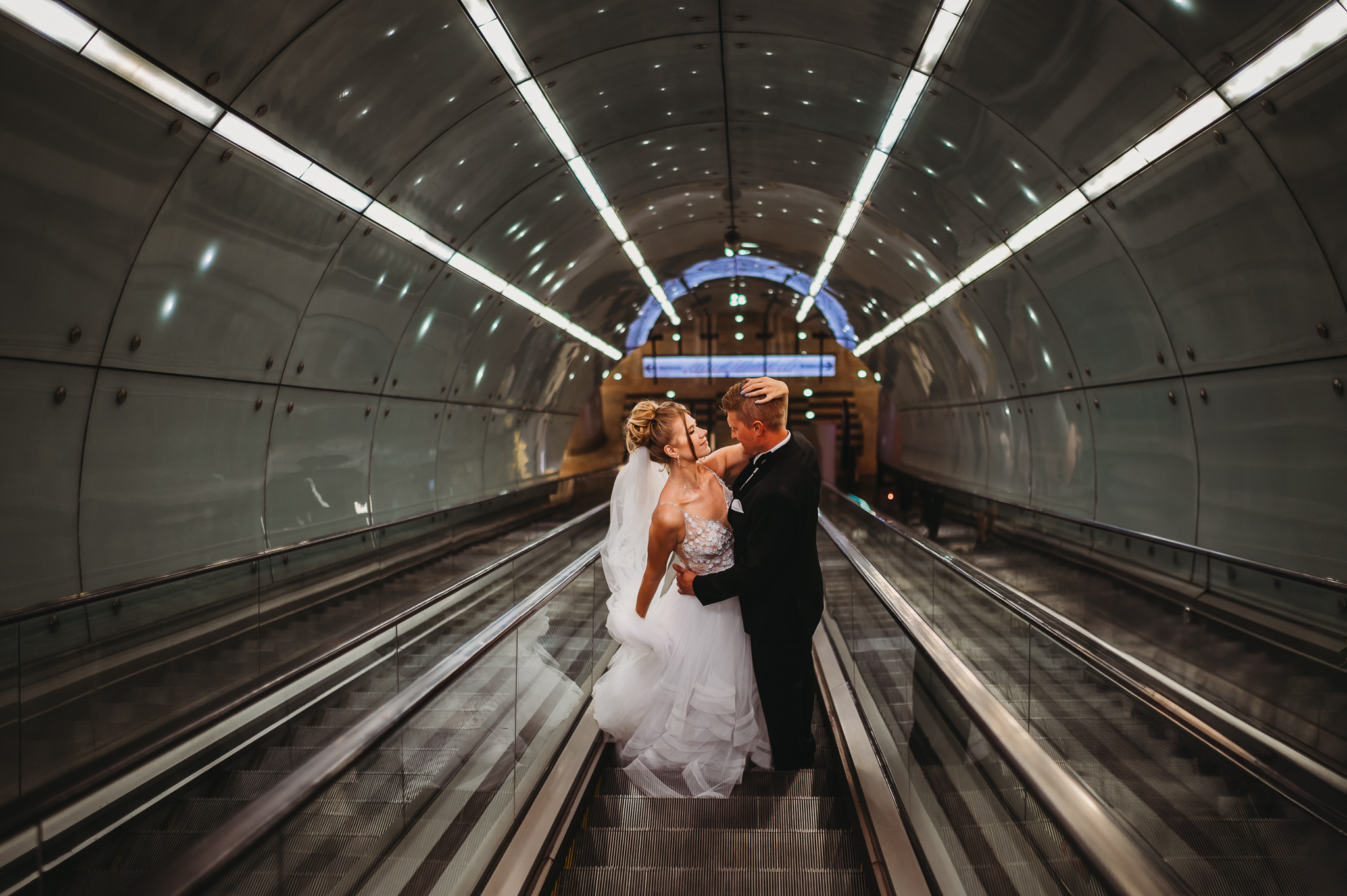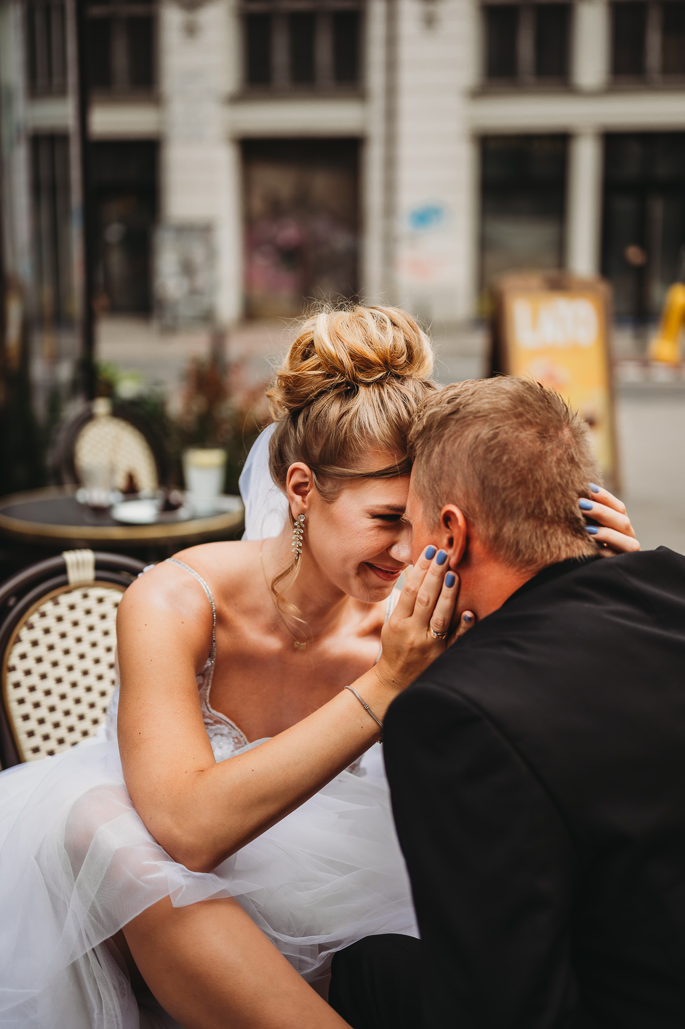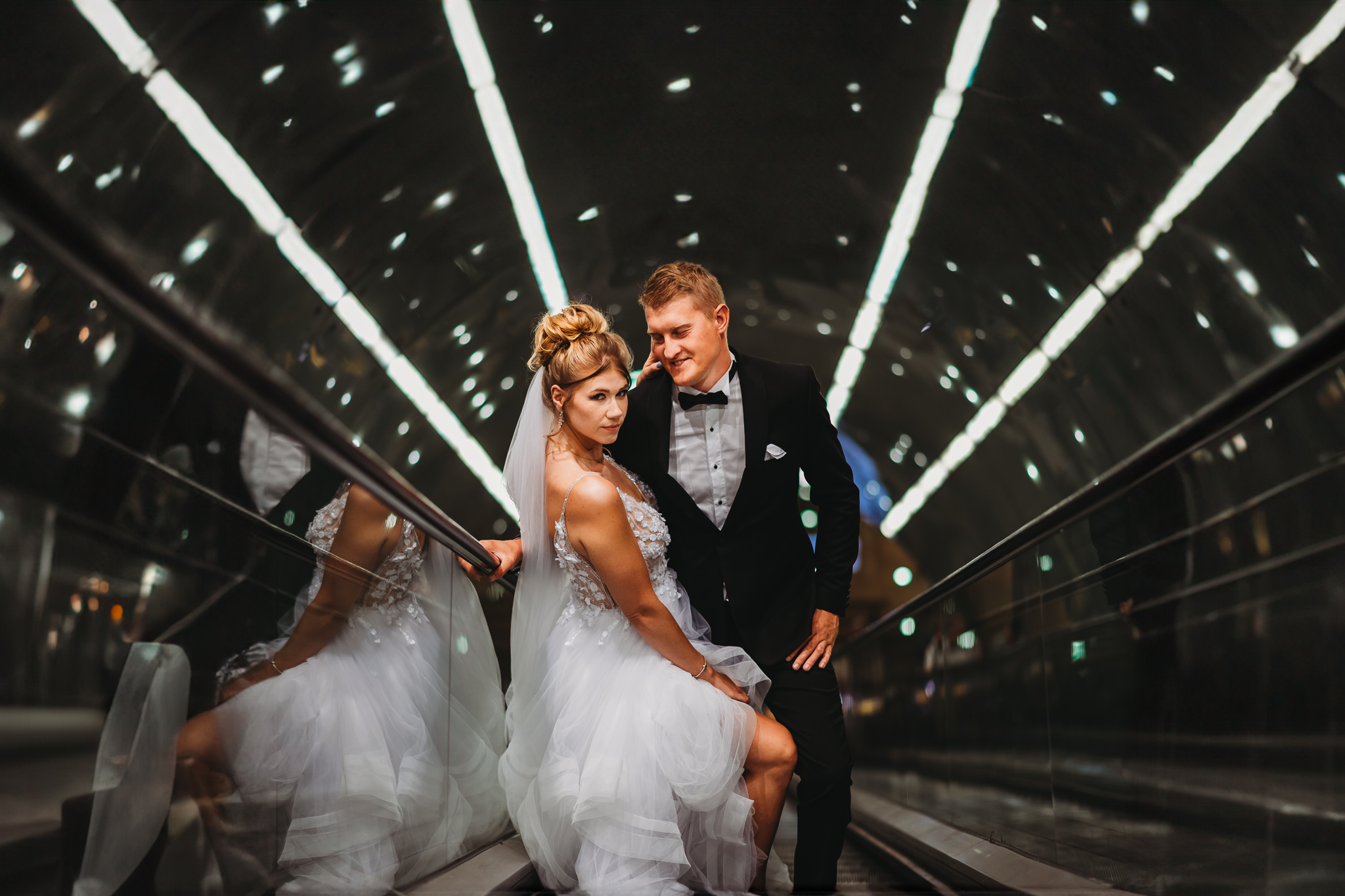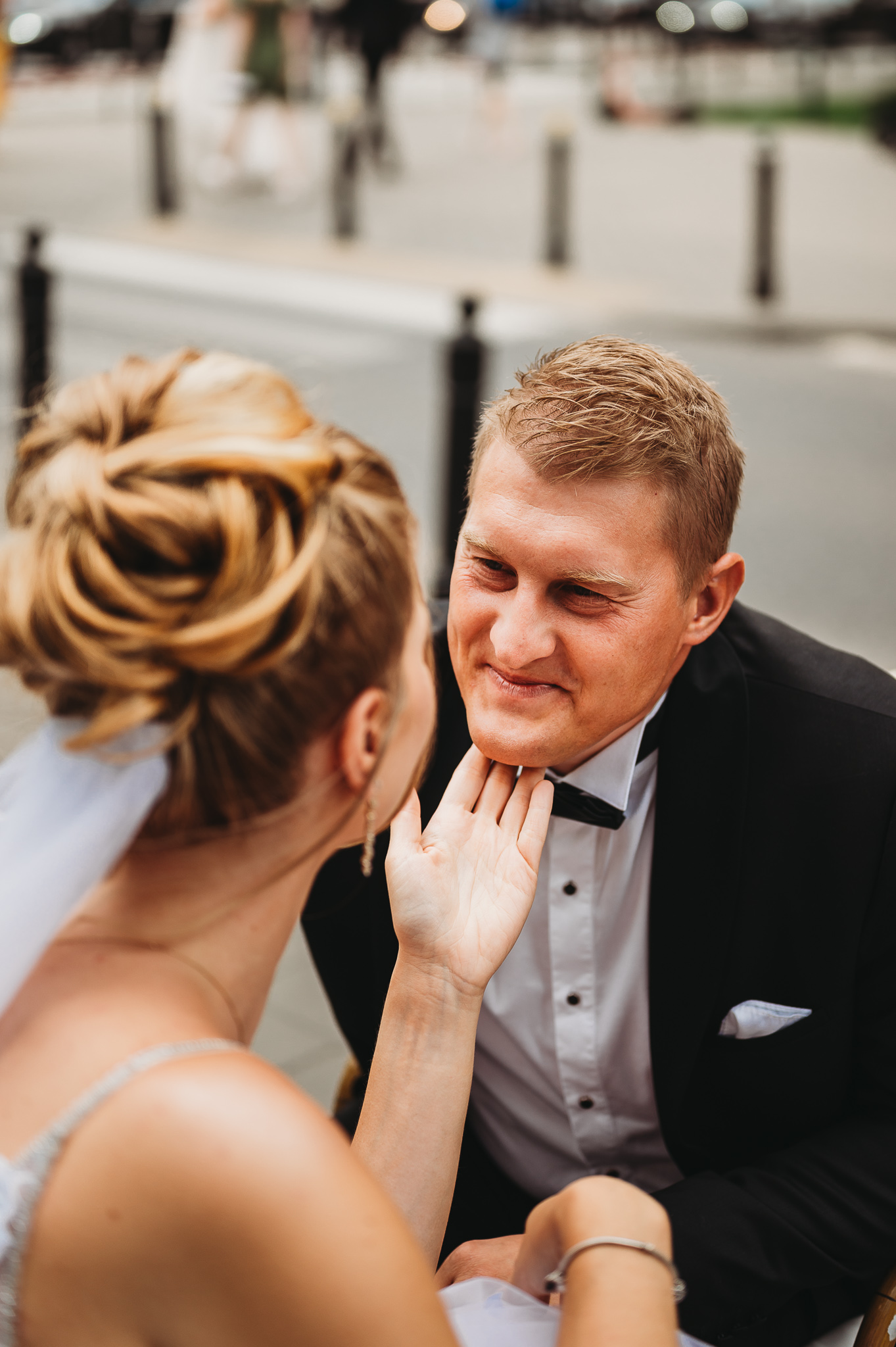 Prawdziwie warszawska sesja – ten urbanistyczny akcent wprowadza niepowtarzalną atmosferę, która idealnie koresponduje z energią nowożeńców. Bardzo pomysłowe ujęcia!