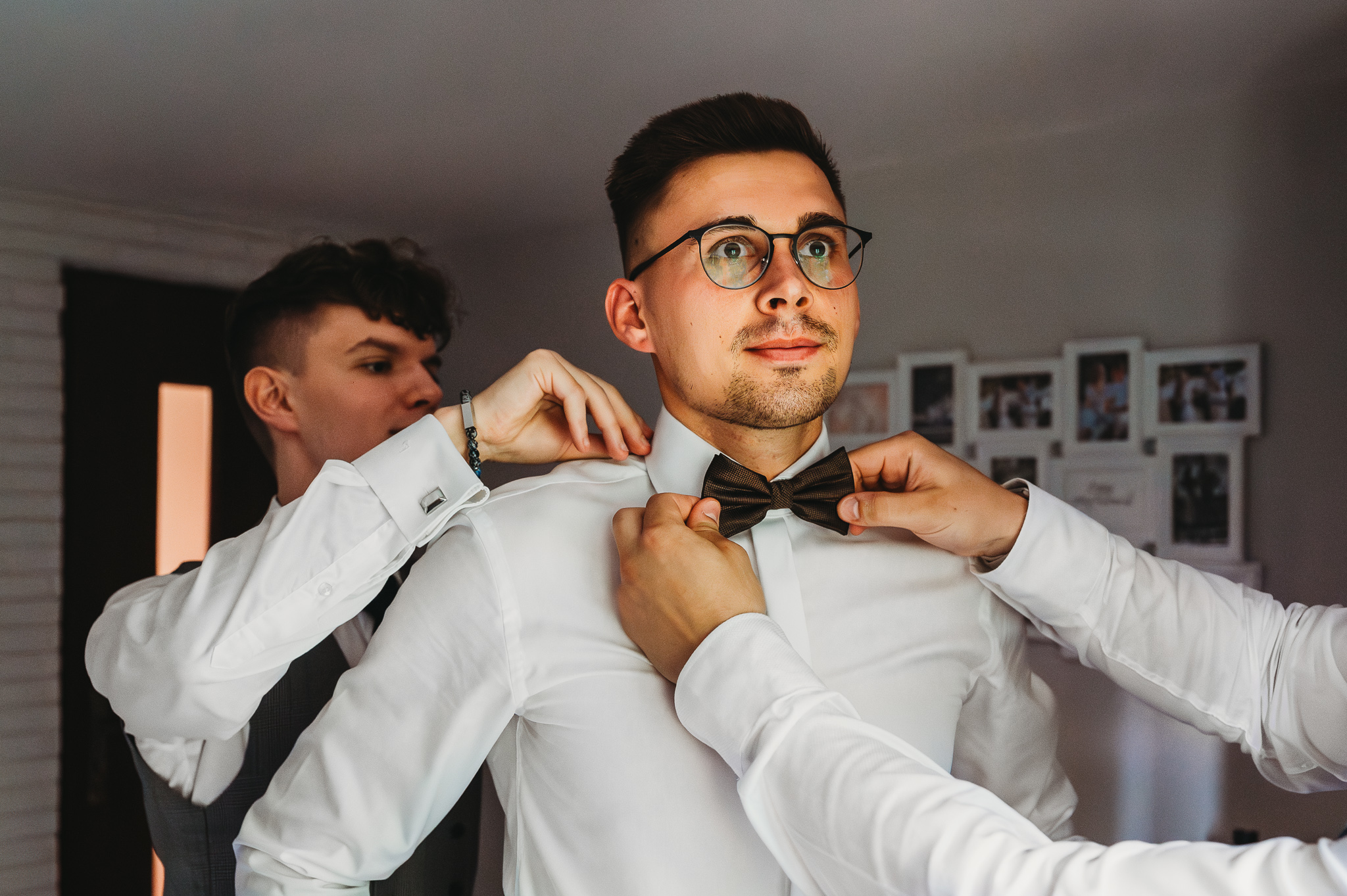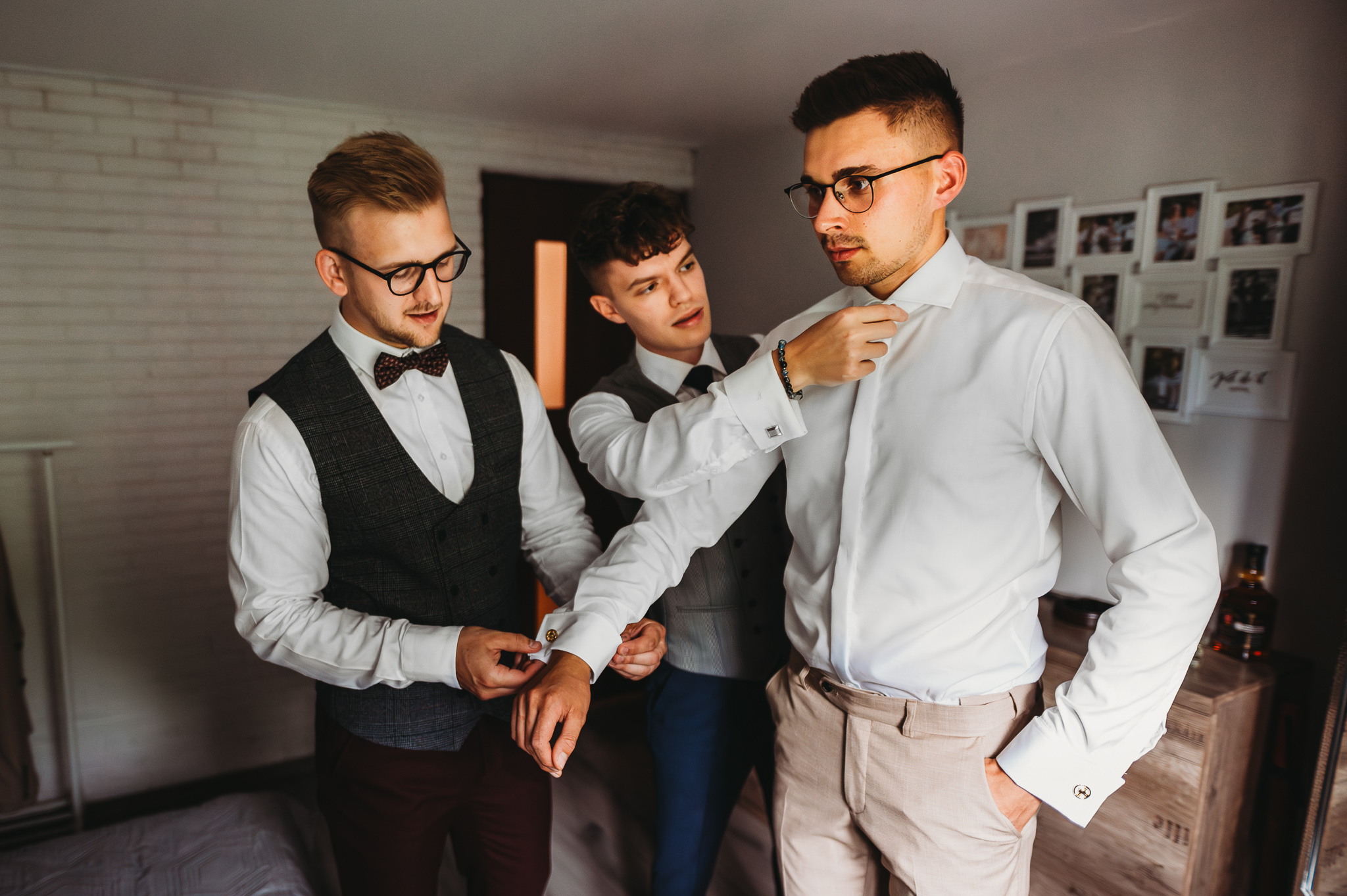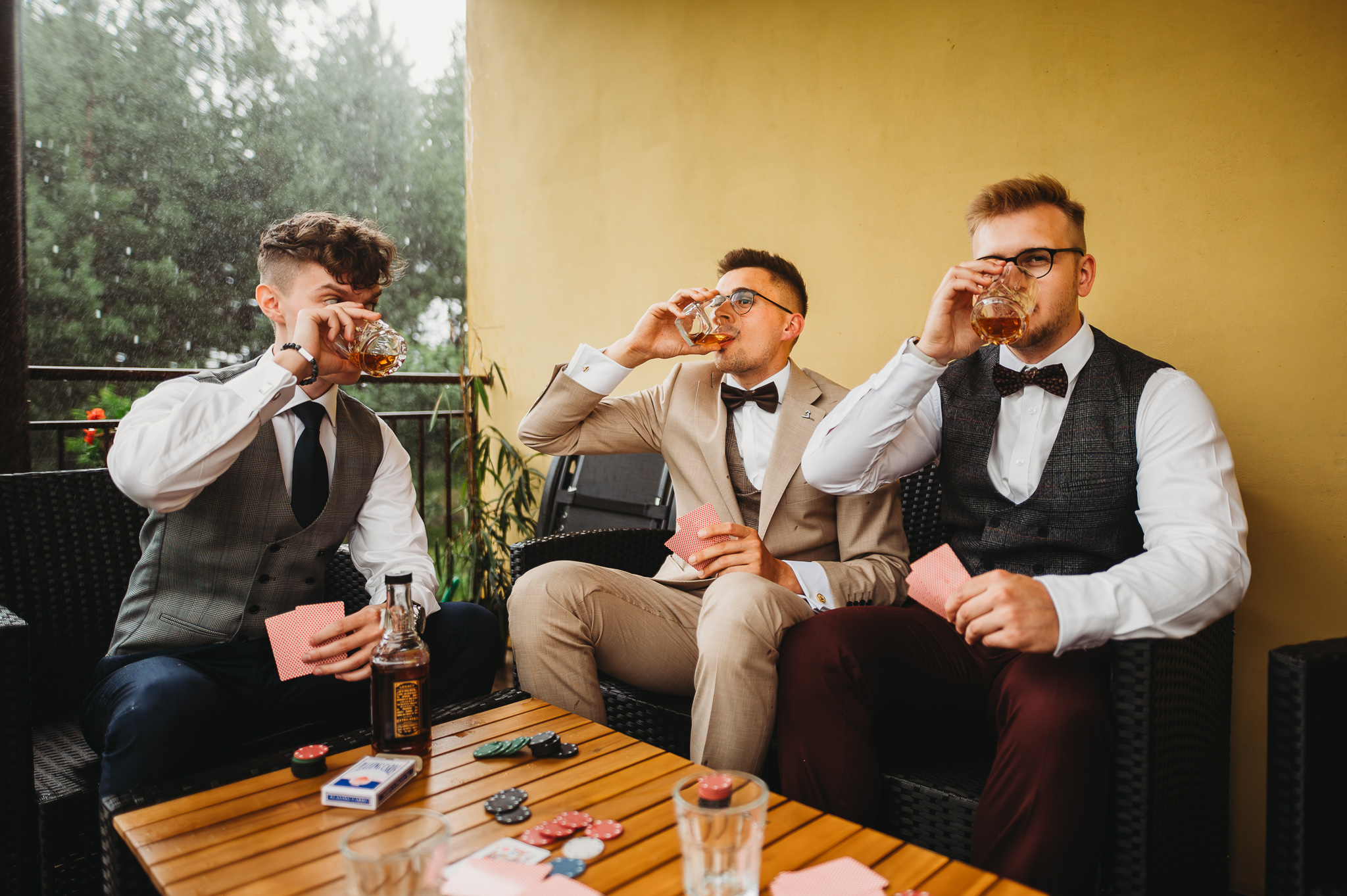 🤵 Rafał rozpoczął dzień w nieco innym klimacie. Jako prawdziwy pasjonat motoryzacji, nie zabrakło rozmów o samochodach, a w towarzystwie najbliższych kolegów znalazł też chwilę na relaks przy kartach i szklaneczce dobrej whisky. Męska energia i spokój idealnie uzupełniły emocjonalne przygotowania Justyny.