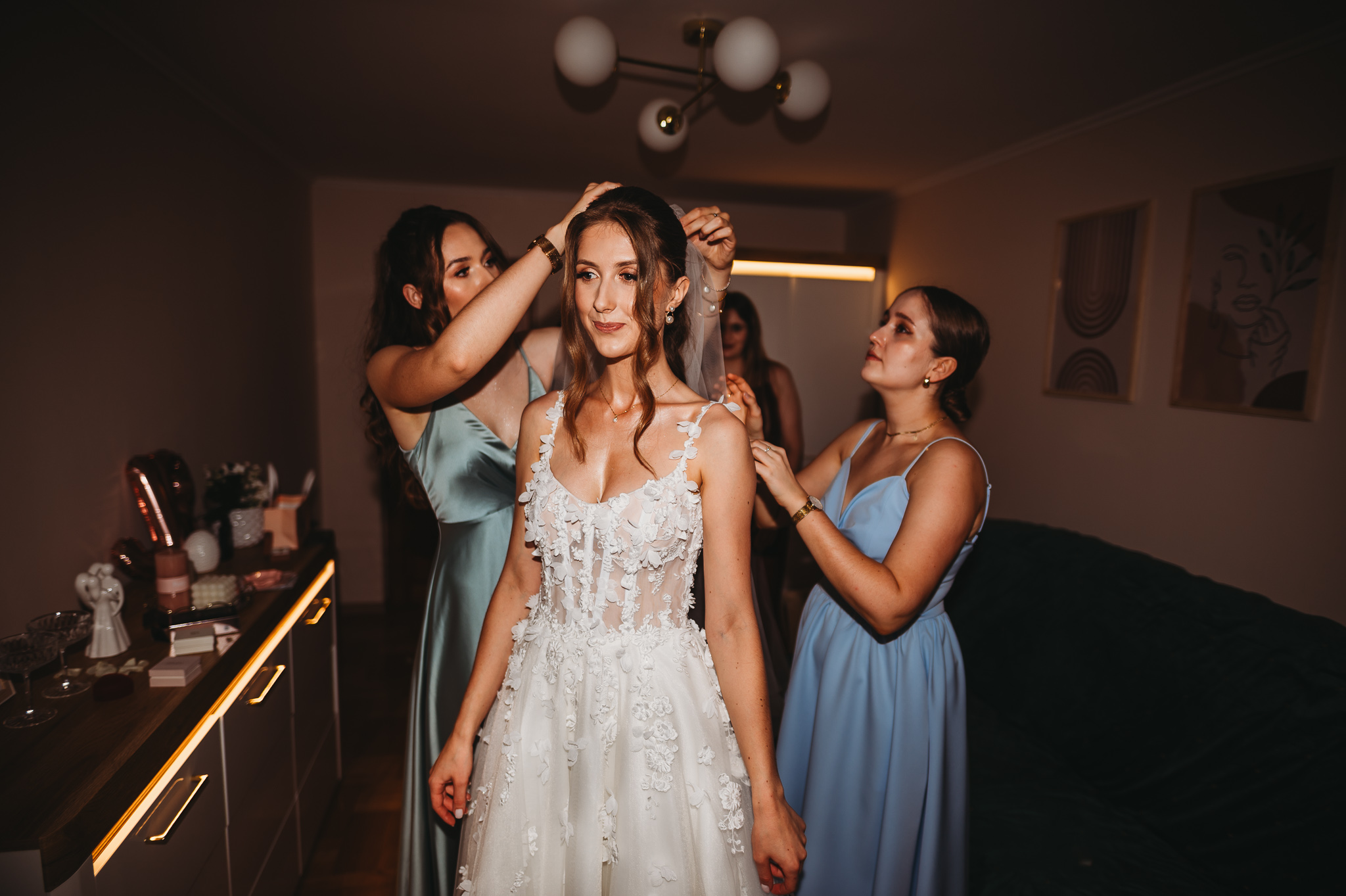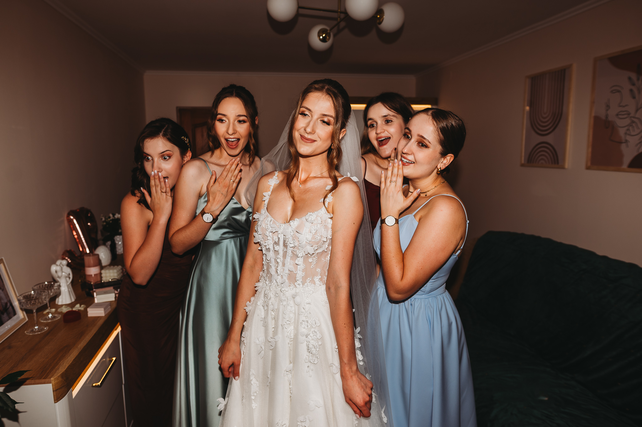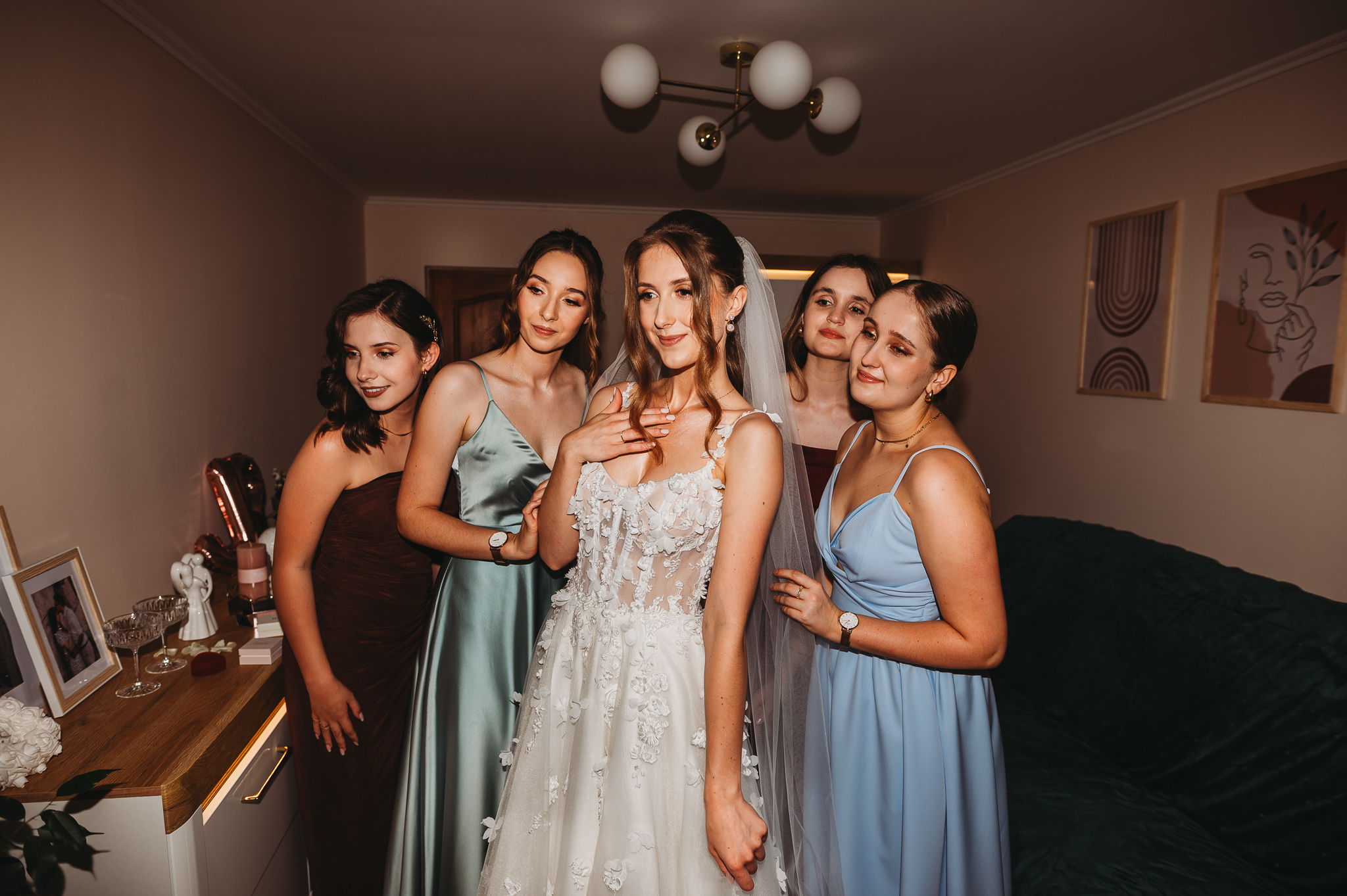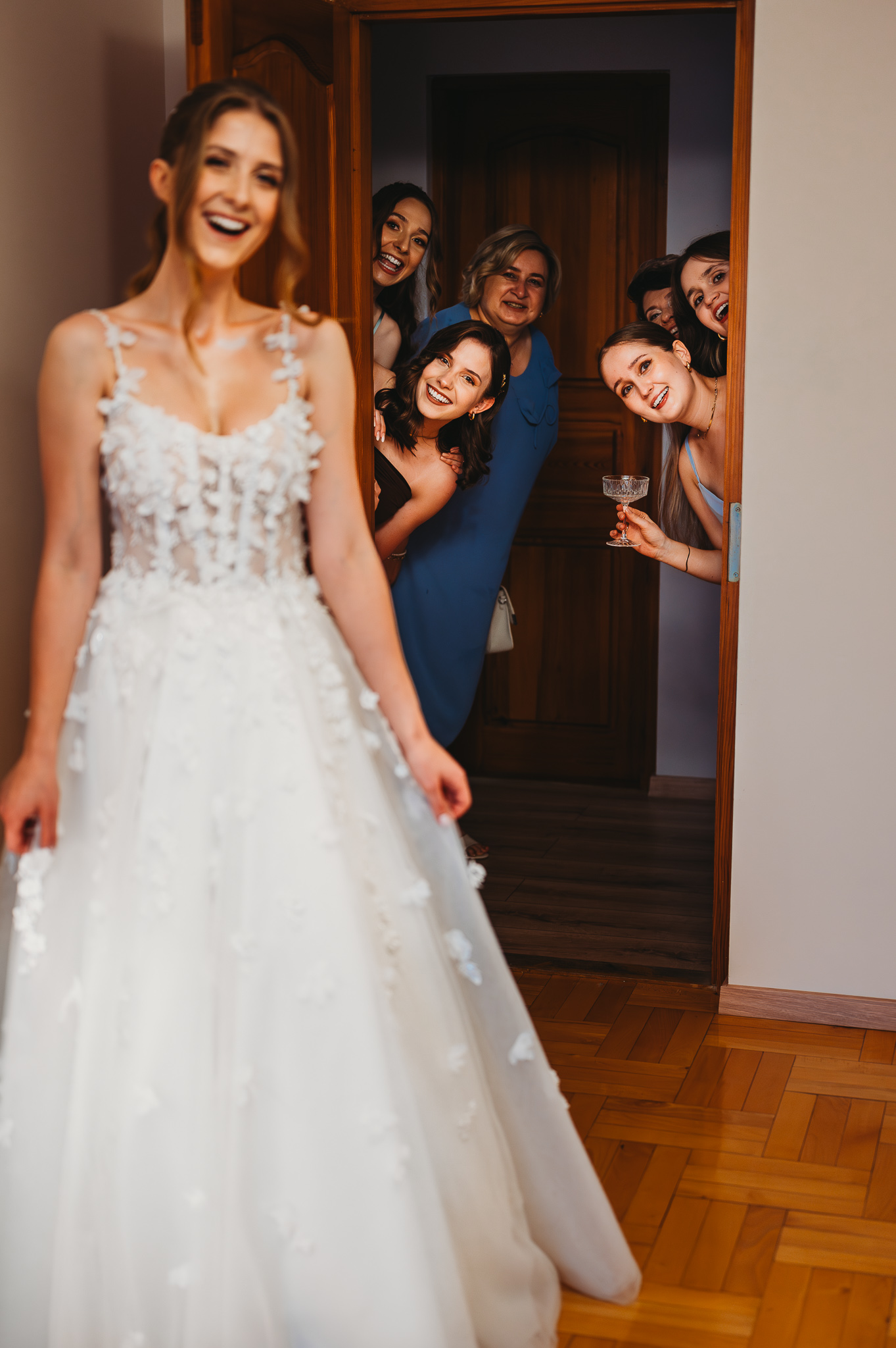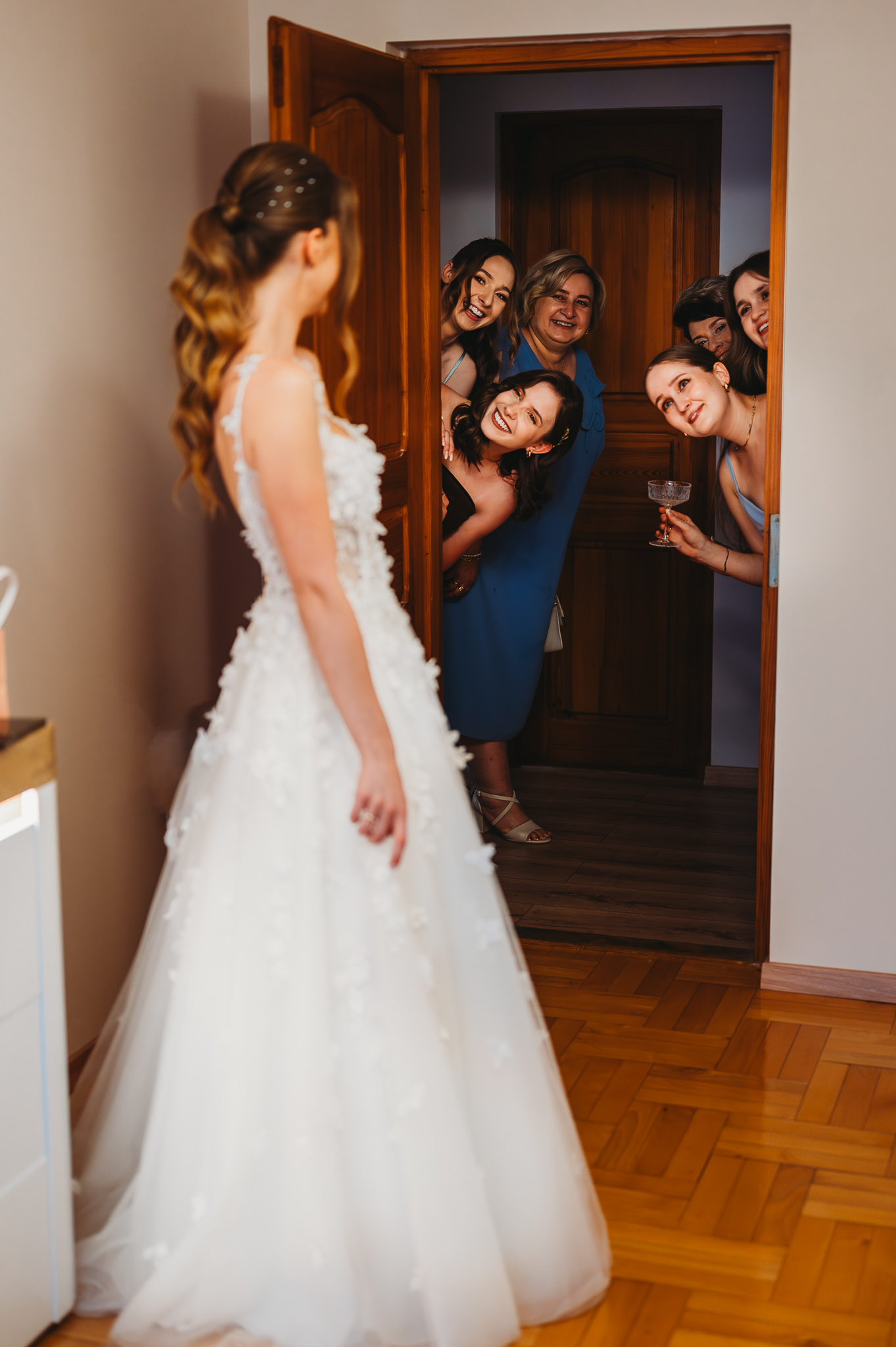 👰 Justyna wyglądała olśniewająco! Jej suknia ślubna zachwycała delikatnością i elegancją, a każdy detal podkreślał jej naturalne piękno. Towarzyszyły jej cudowne druhny, wśród których wyróżniała się siostra – zawsze blisko, zawsze z uśmiechem. Wspólne przygotowania pełne były śmiechu, czułości i drobnych wzruszeń.