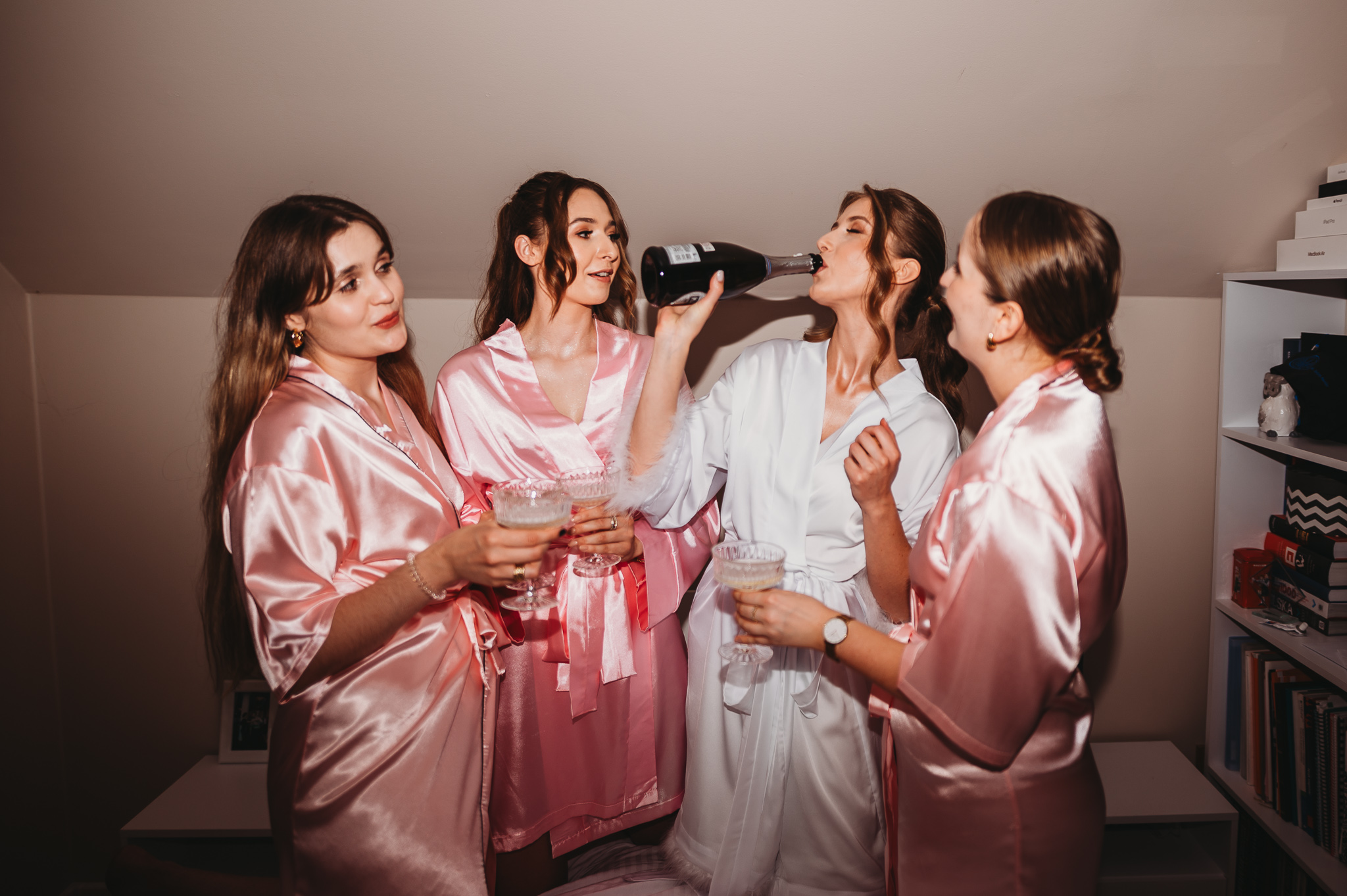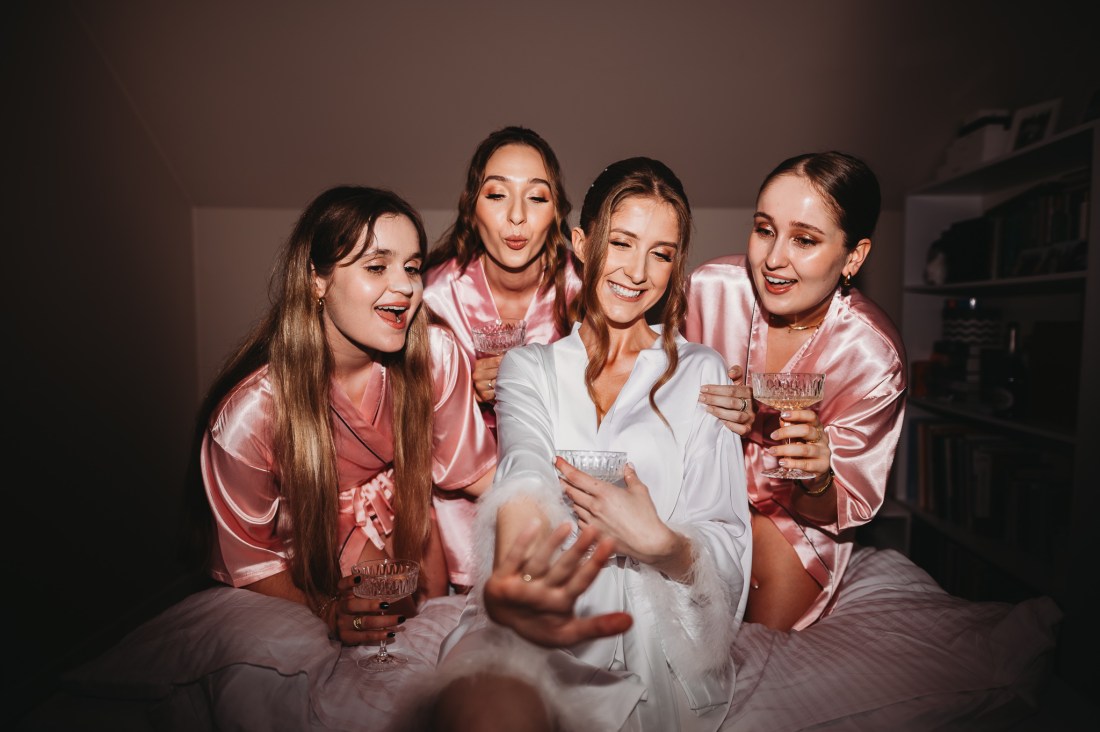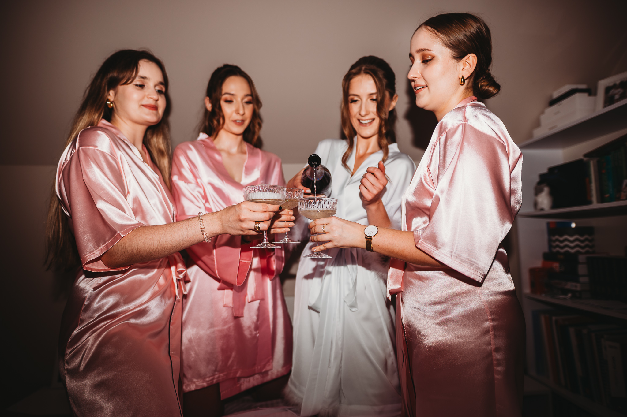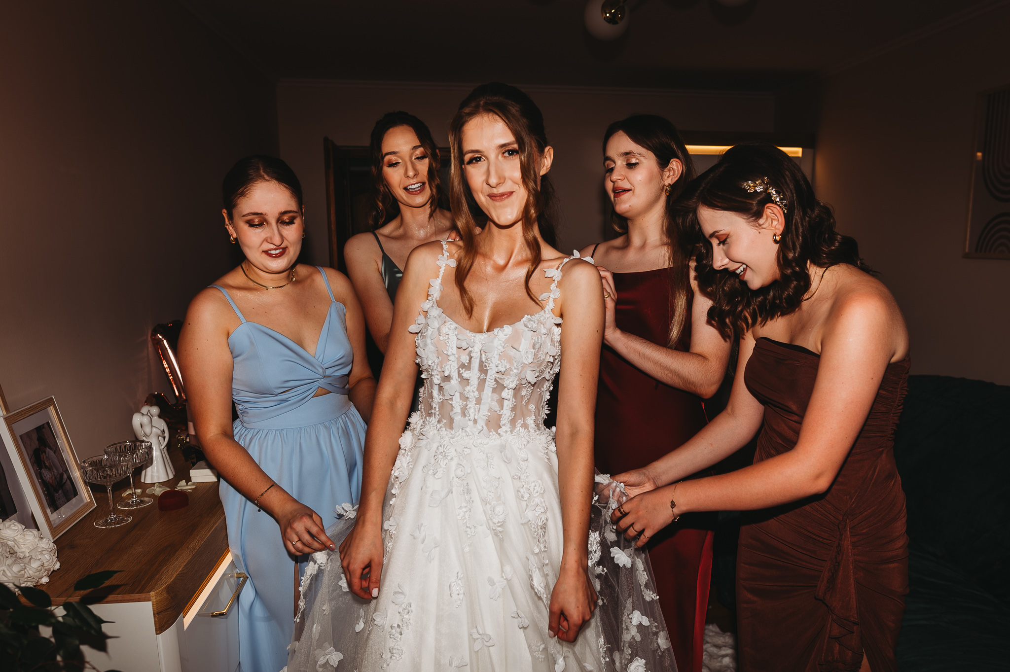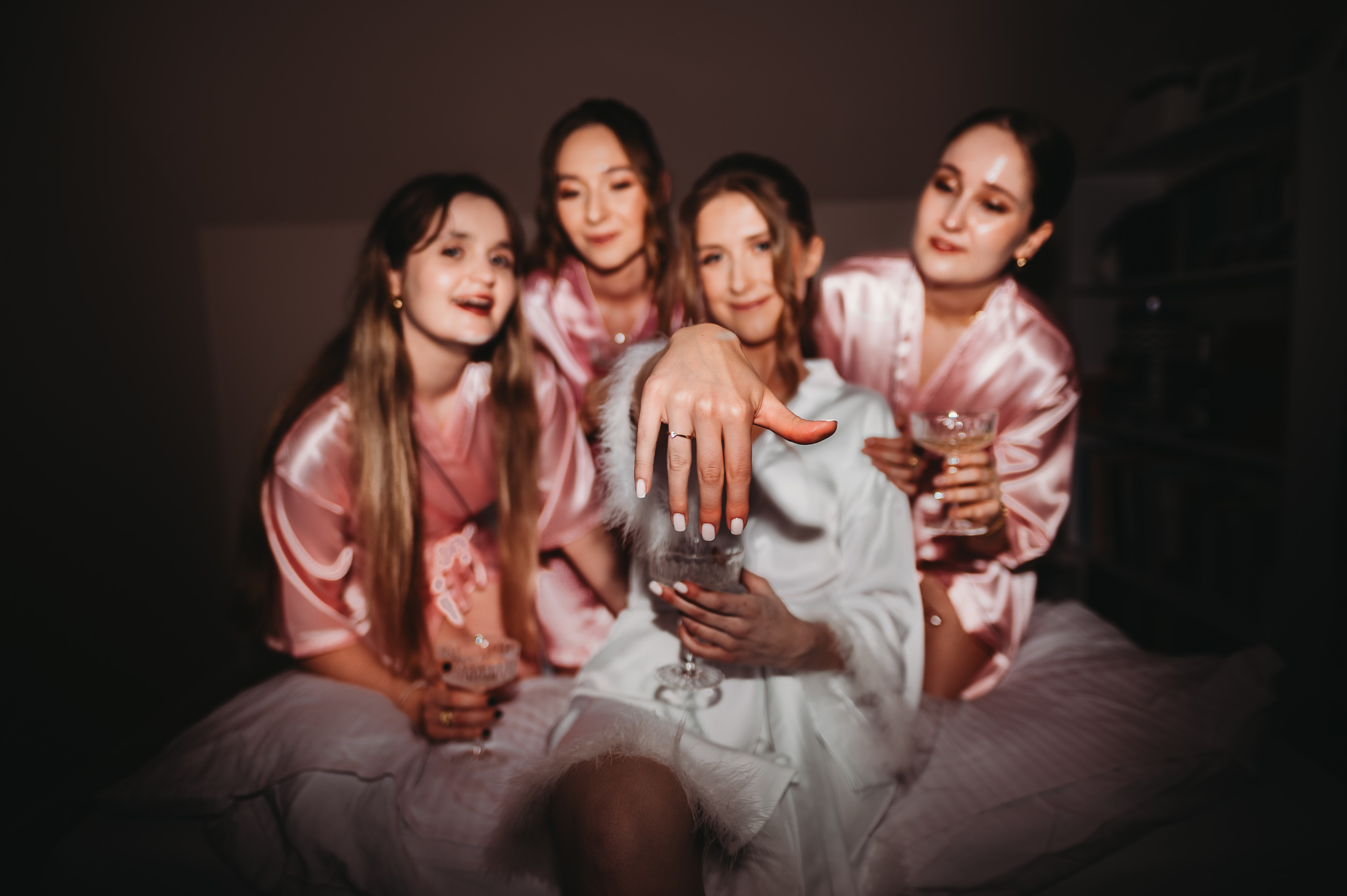 👰 Justyna wyglądała olśniewająco! Jej suknia ślubna zachwycała delikatnością i elegancją, a każdy detal podkreślał jej naturalne piękno. Towarzyszyły jej cudowne druhny, wśród których wyróżniała się siostra – zawsze blisko, zawsze z uśmiechem. Wspólne przygotowania pełne były śmiechu, czułości i drobnych wzruszeń.