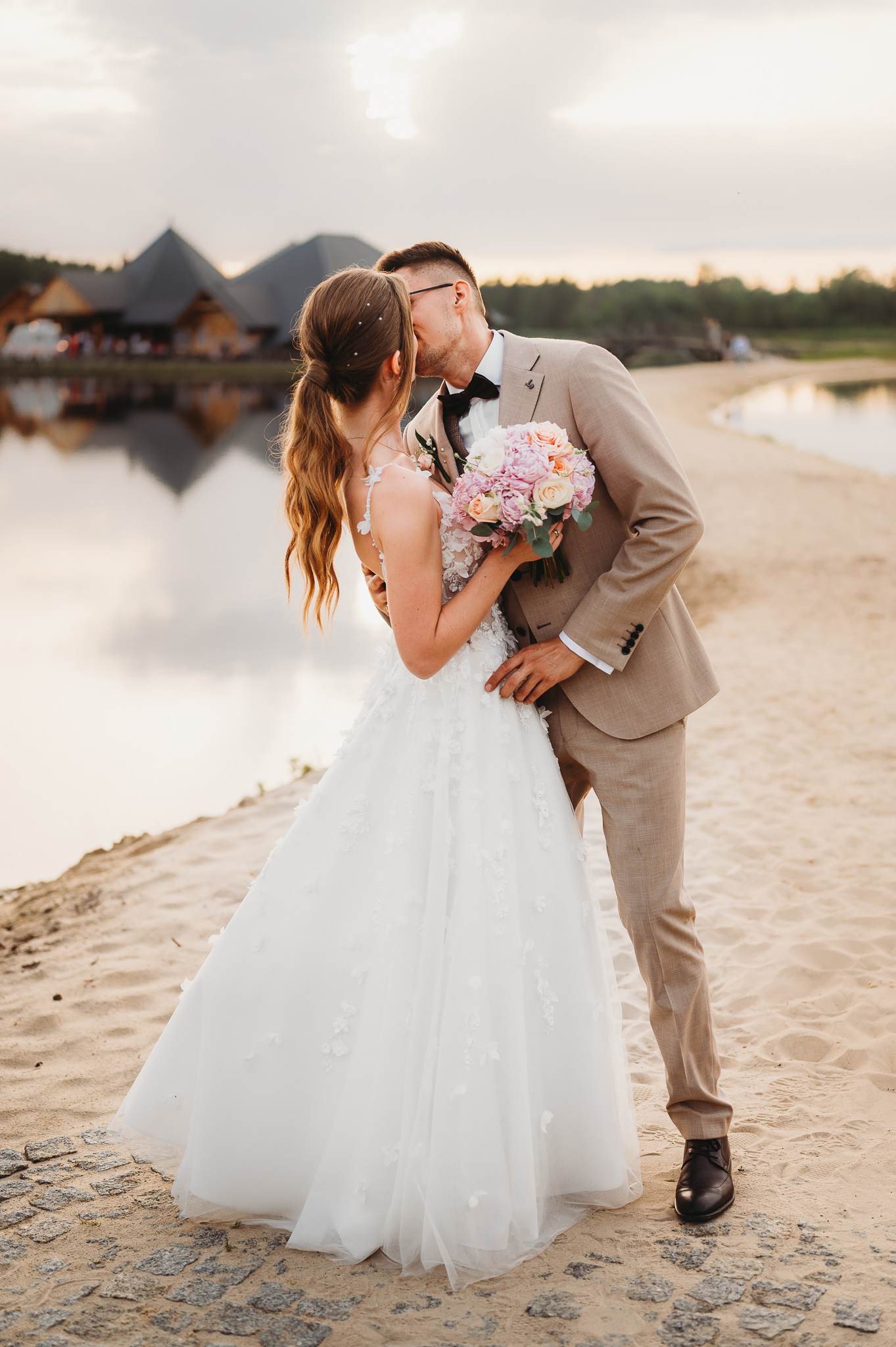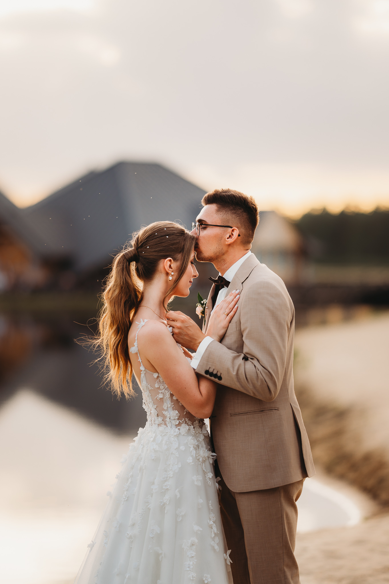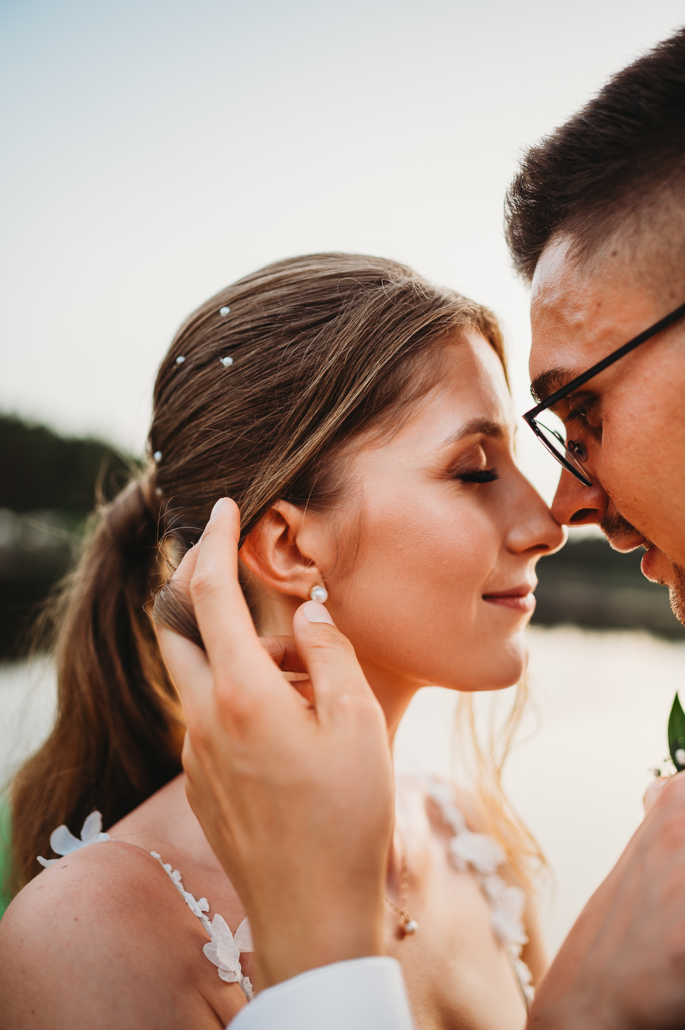 🤍 Następnie wyruszyli na sesję plenerową nad wodą, gdzie złote promienie zachodzącego słońca tworzyły bajkową scenerię. Ich spojrzenia, gesty i uśmiechy mówiły więcej niż tysiąc słów – czysta miłość uchwycona w kadrze.