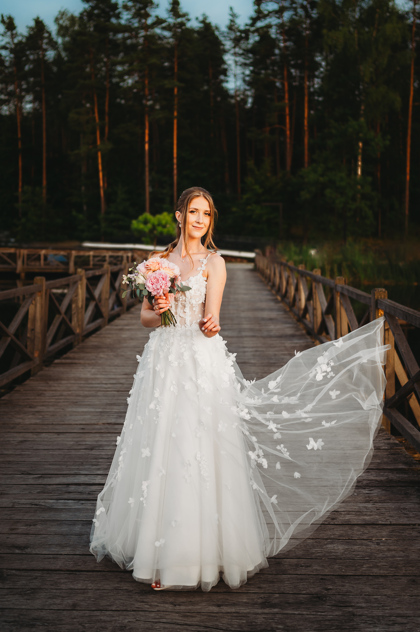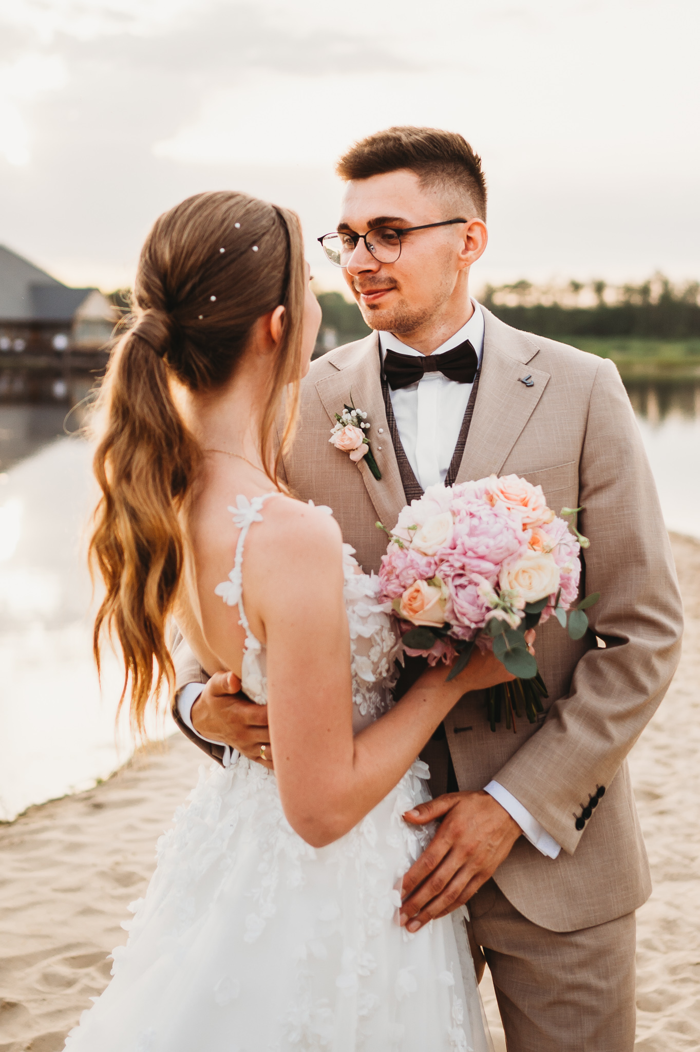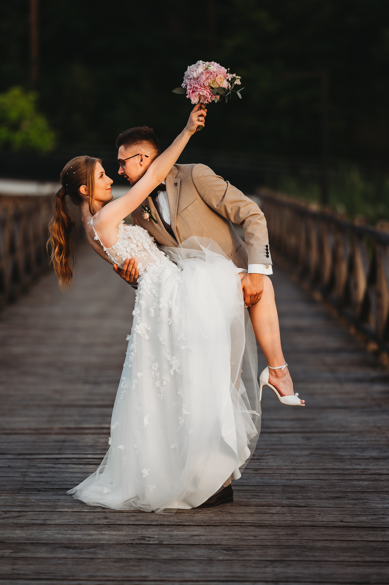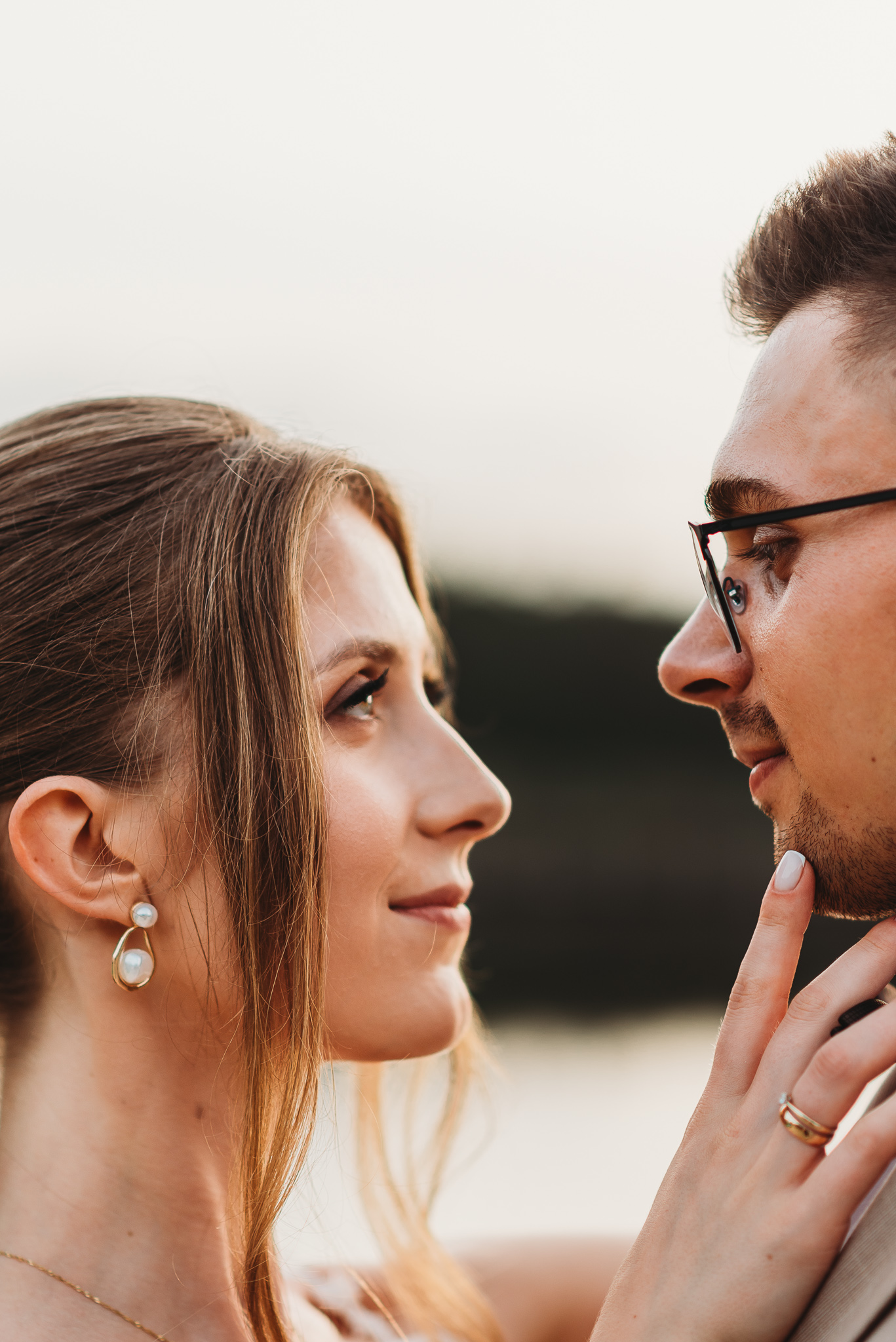 🤍 Następnie wyruszyli na sesję plenerową nad wodą, gdzie złote promienie zachodzącego słońca tworzyły bajkową scenerię. Ich spojrzenia, gesty i uśmiechy mówiły więcej niż tysiąc słów – czysta miłość uchwycona w kadrze.