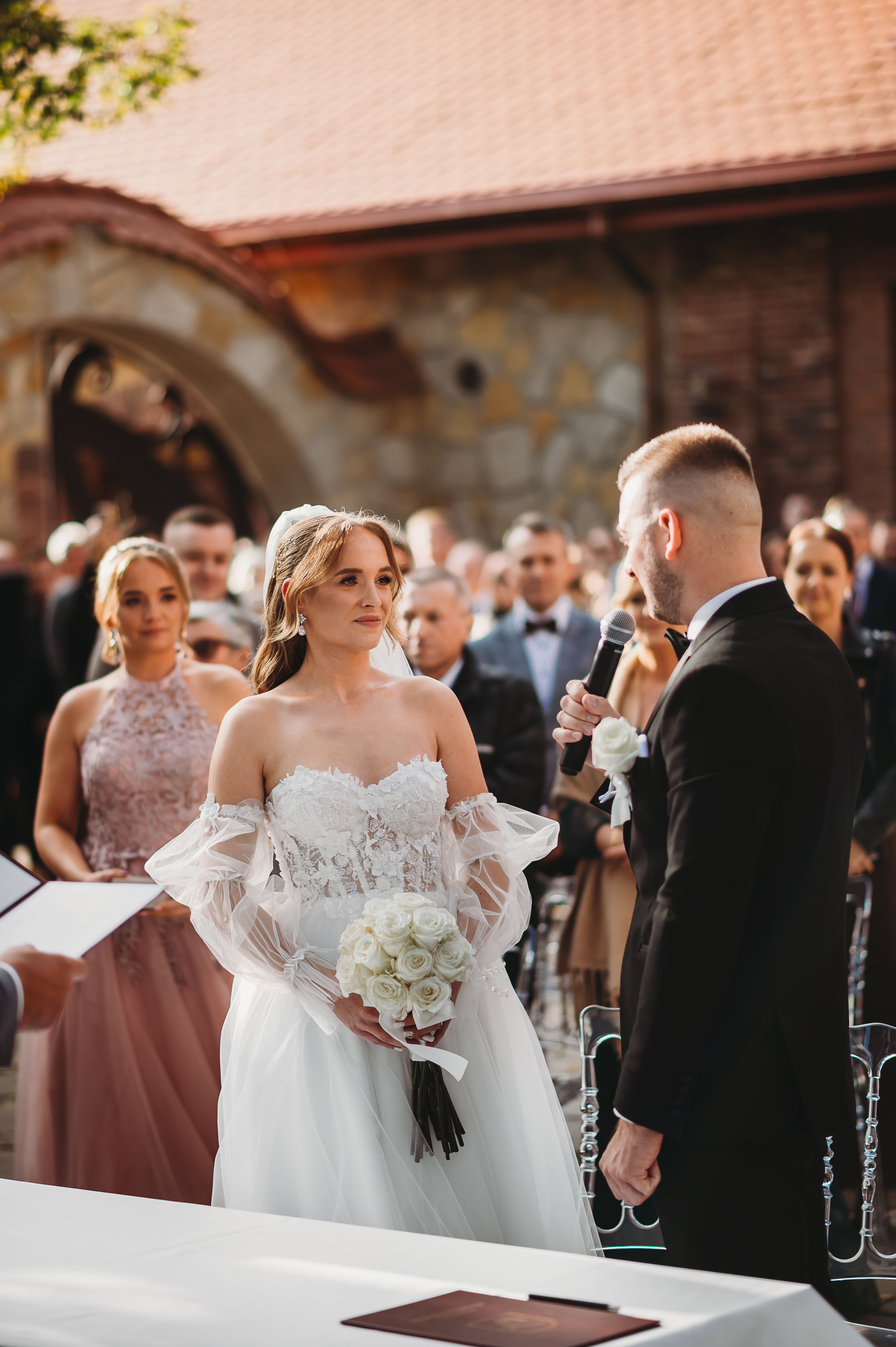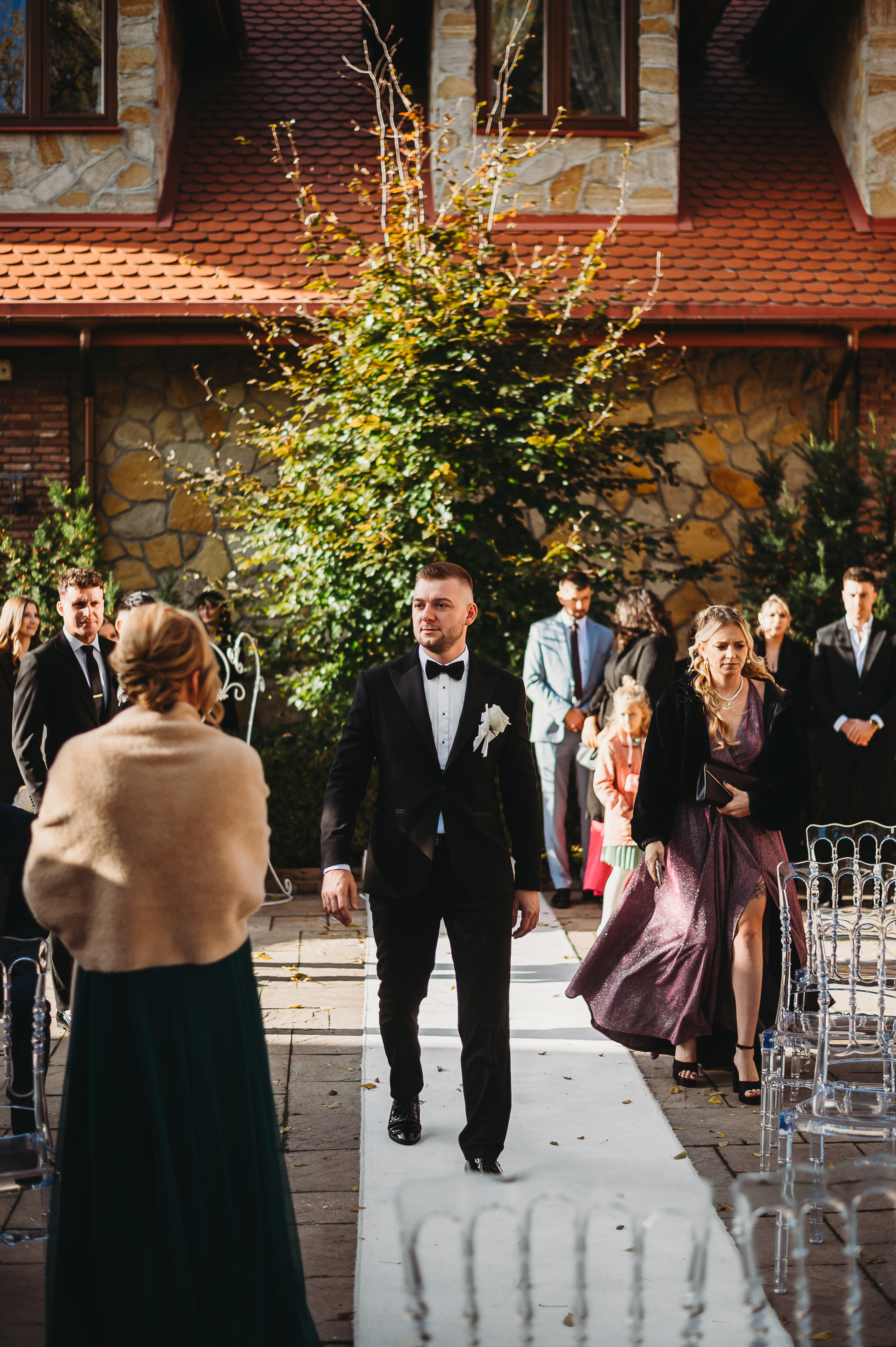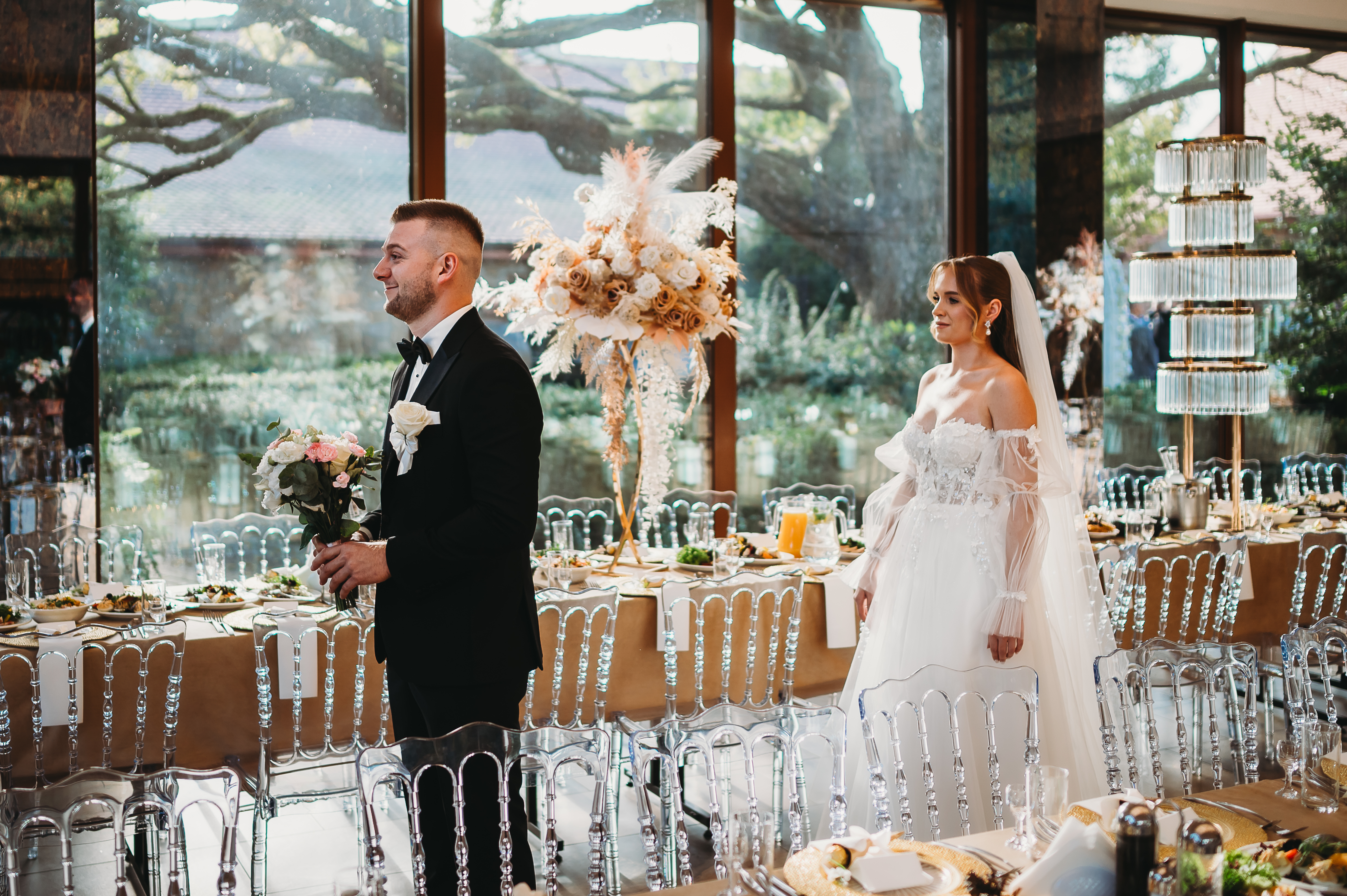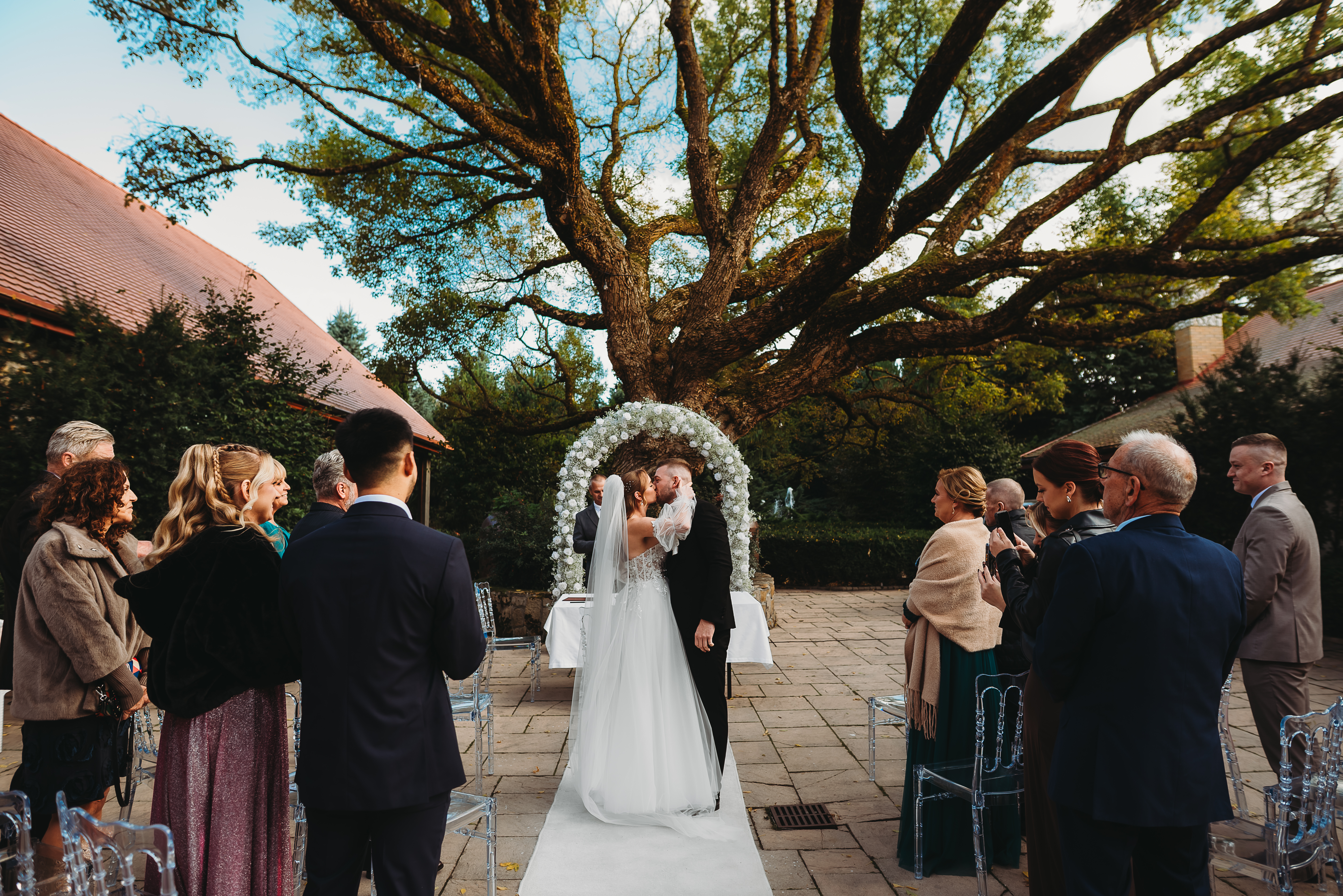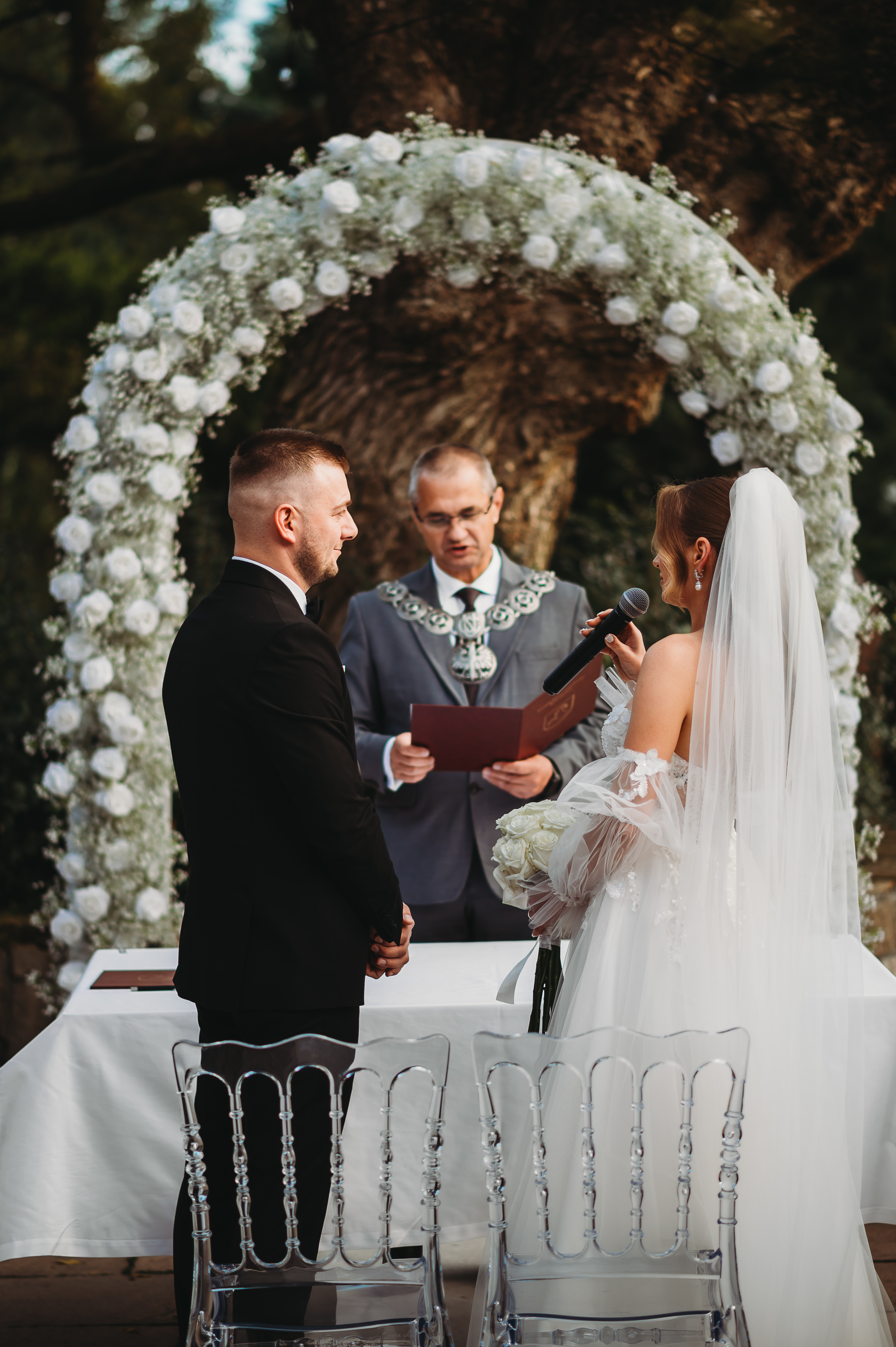 Dekoracje na zewnątrz tworzyły nastrojowy klimat, idealnie współgrający z naturą. Centralnym punktem był ogromny, rozłożysty dąb 🌳, który stał się niemym świadkiem przysięgi Klaudii i Kacpra. To właśnie pod nim zakochani powiedzieli sobie małżeńskie „tak”.