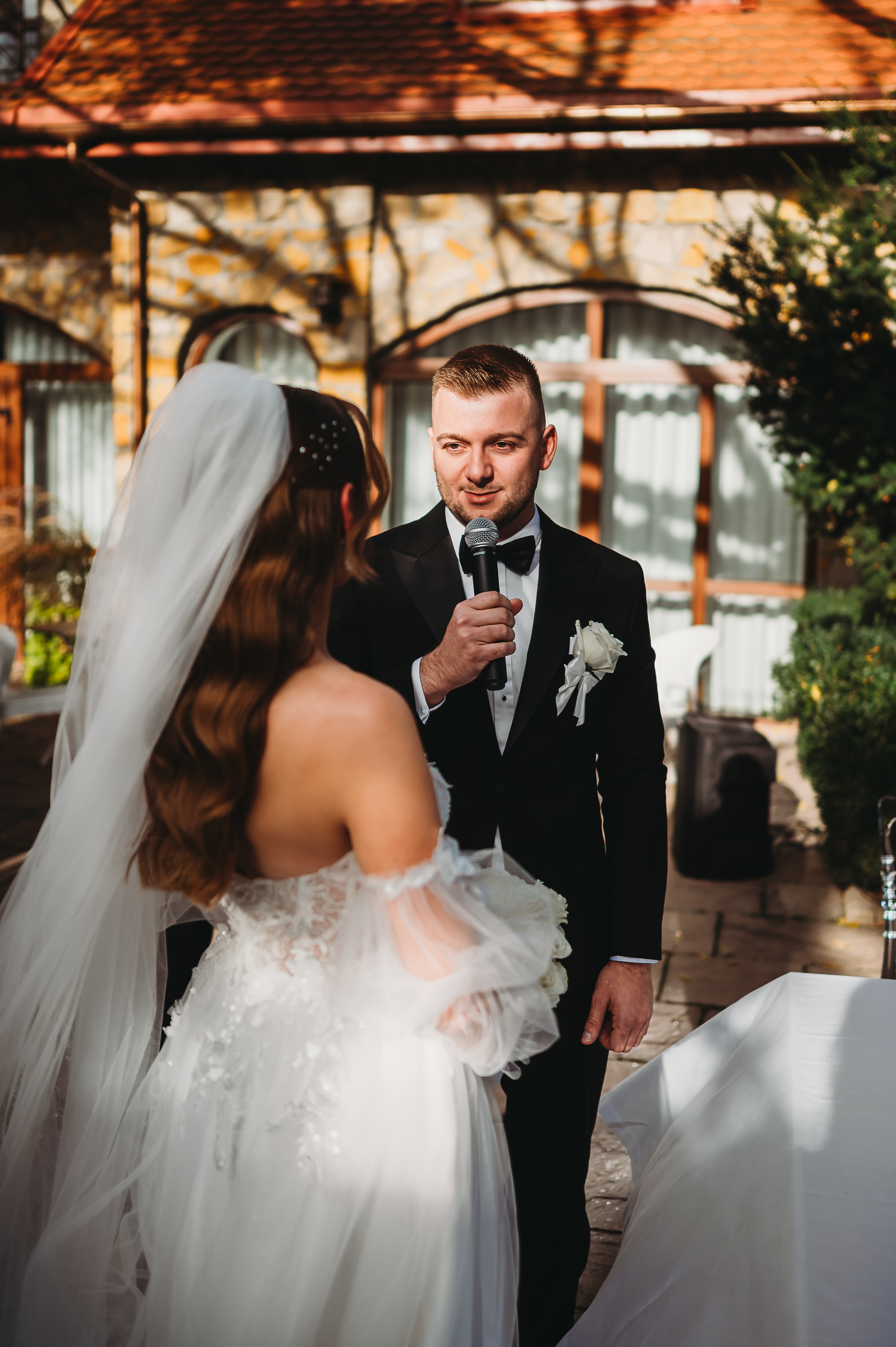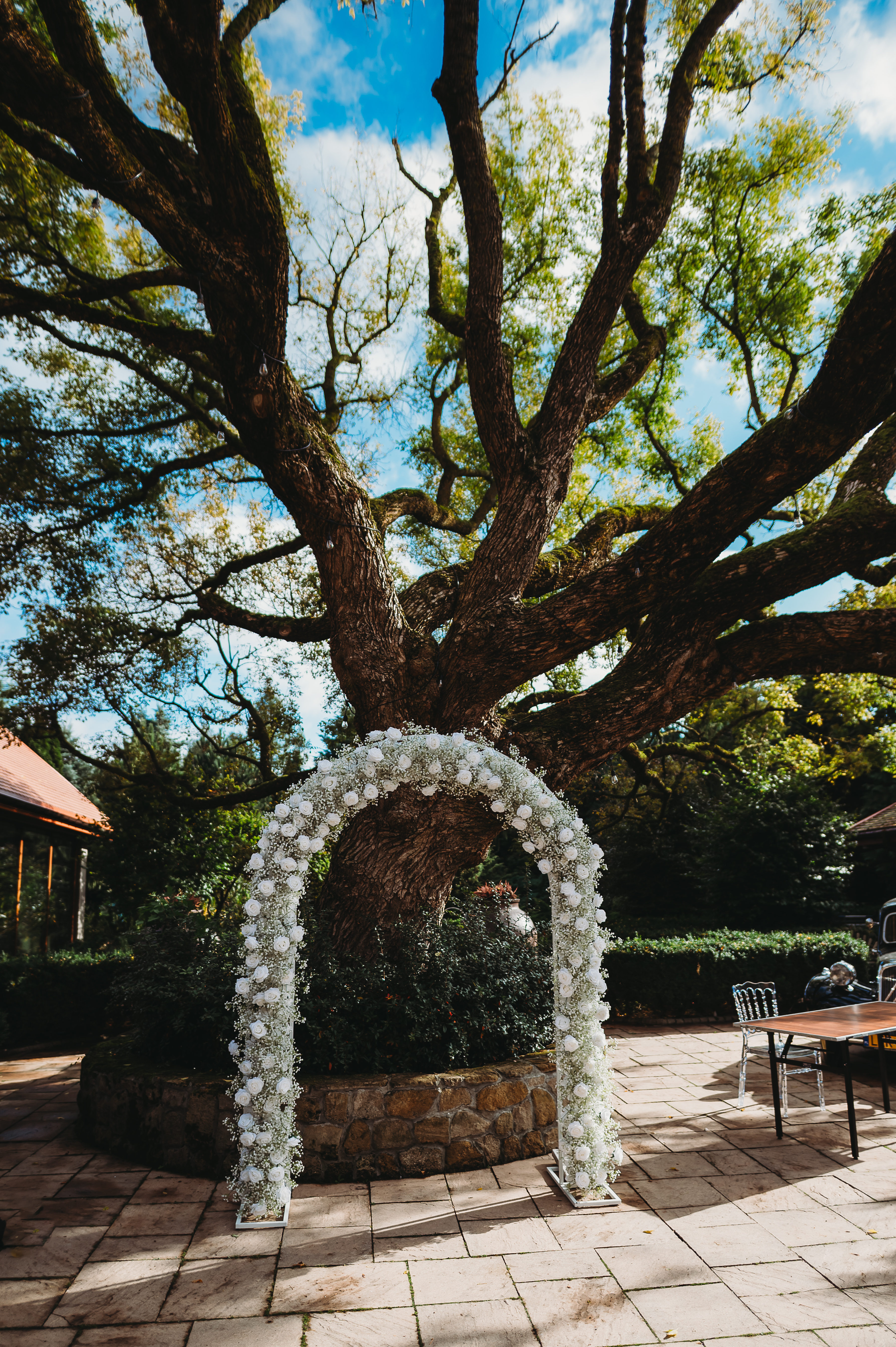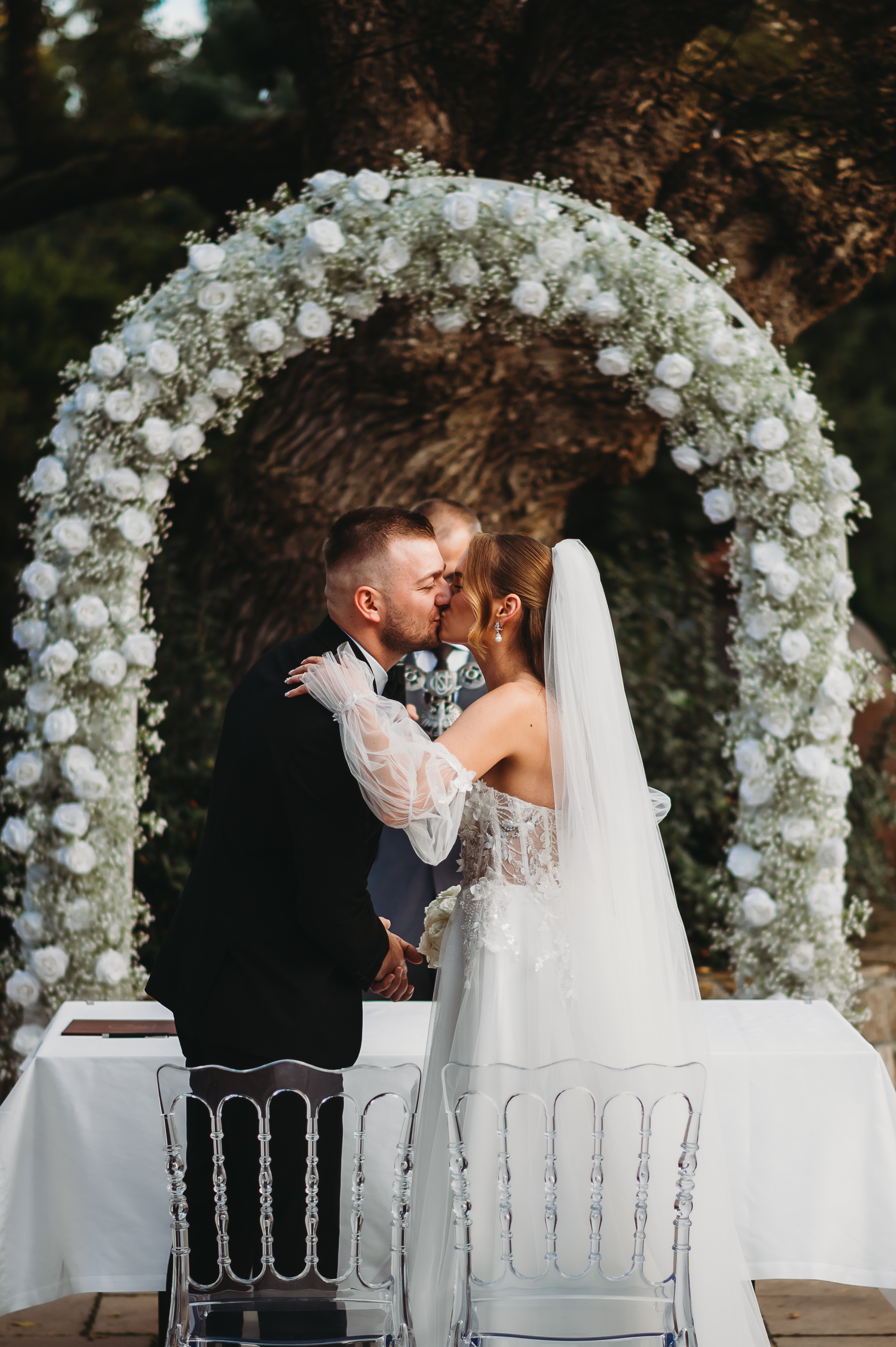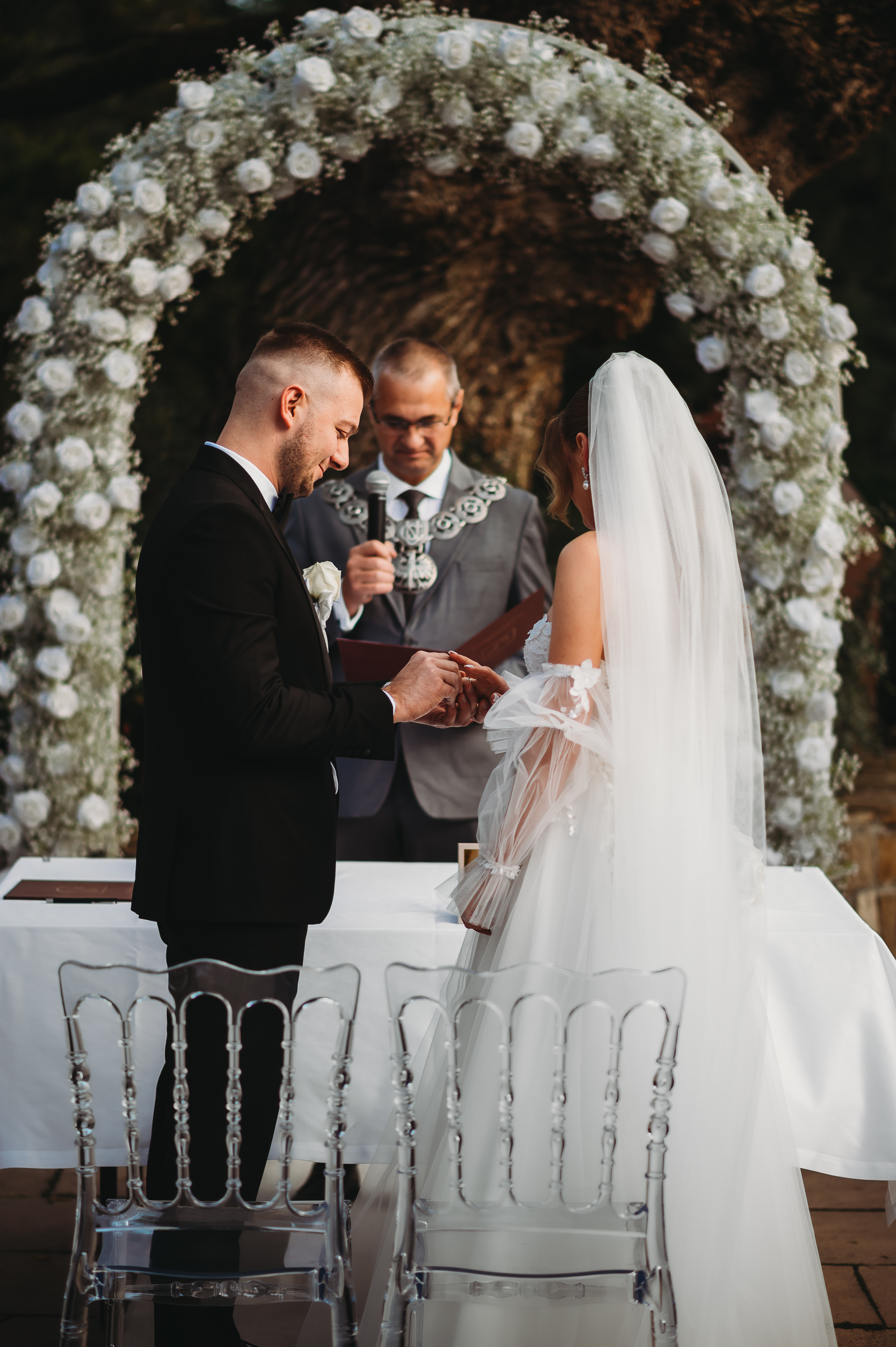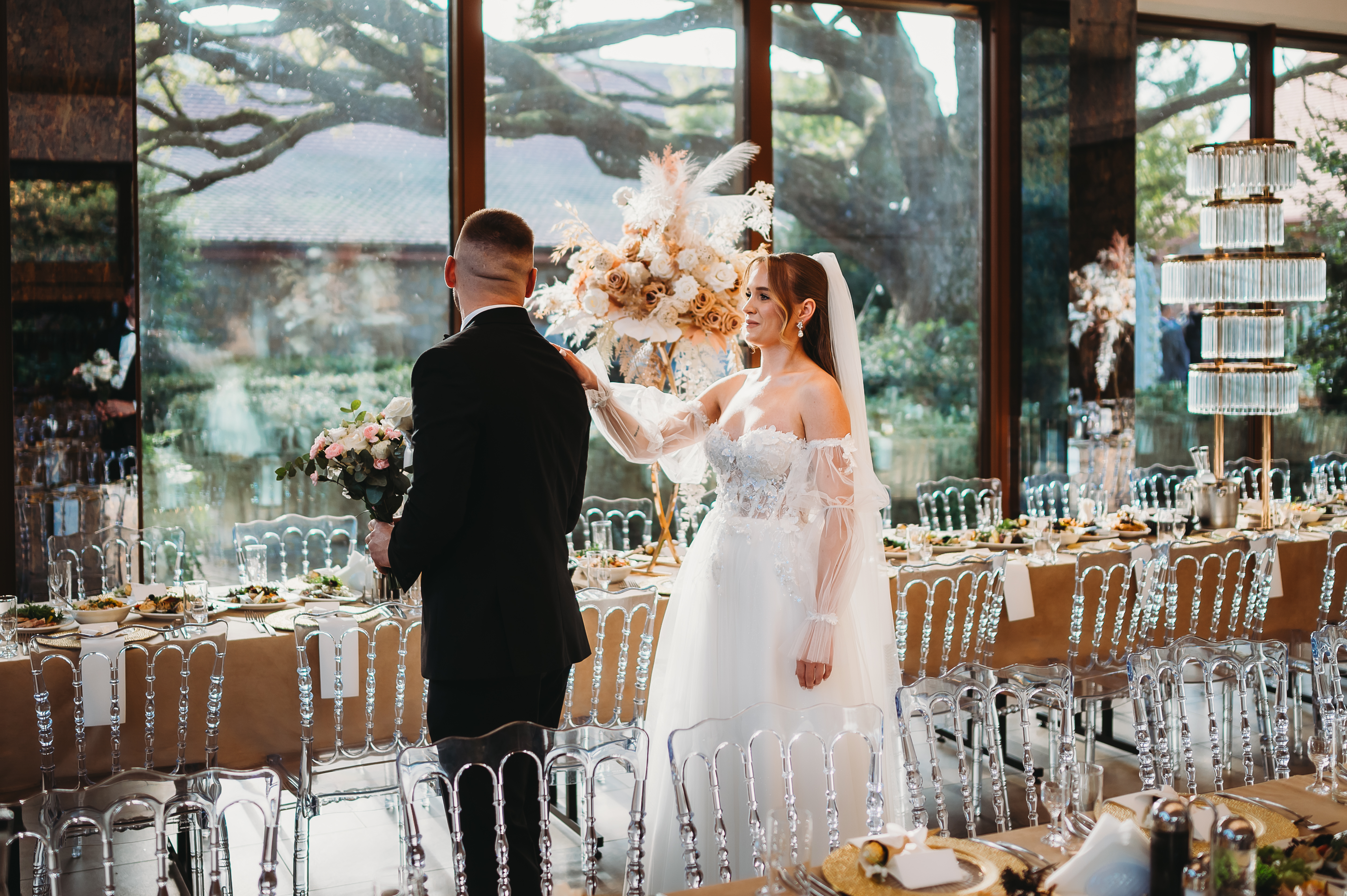 Dekoracje na zewnątrz tworzyły nastrojowy klimat, idealnie współgrający z naturą. Centralnym punktem był ogromny, rozłożysty dąb 🌳, który stał się niemym świadkiem przysięgi Klaudii i Kacpra. To właśnie pod nim zakochani powiedzieli sobie małżeńskie „tak”.