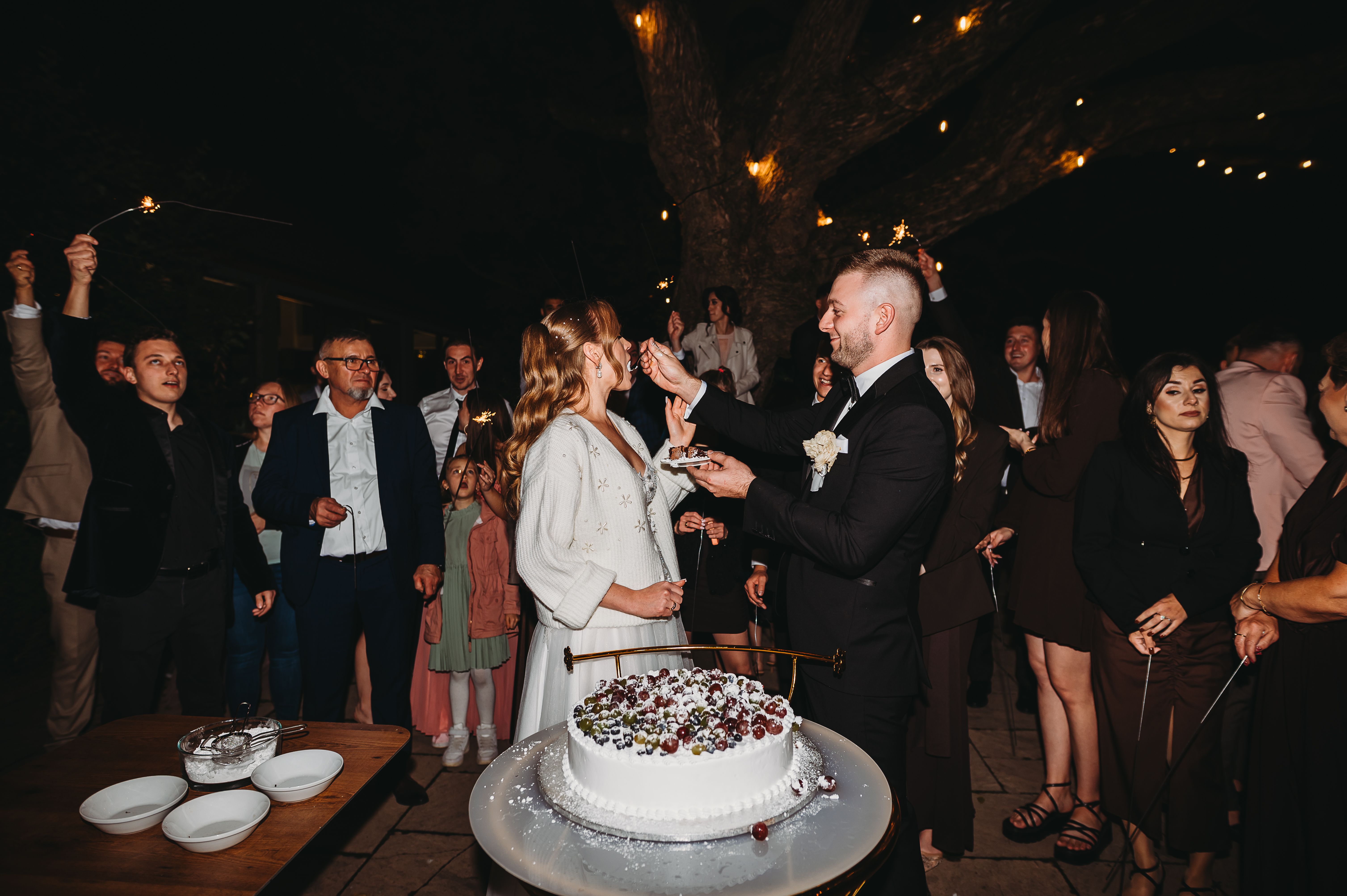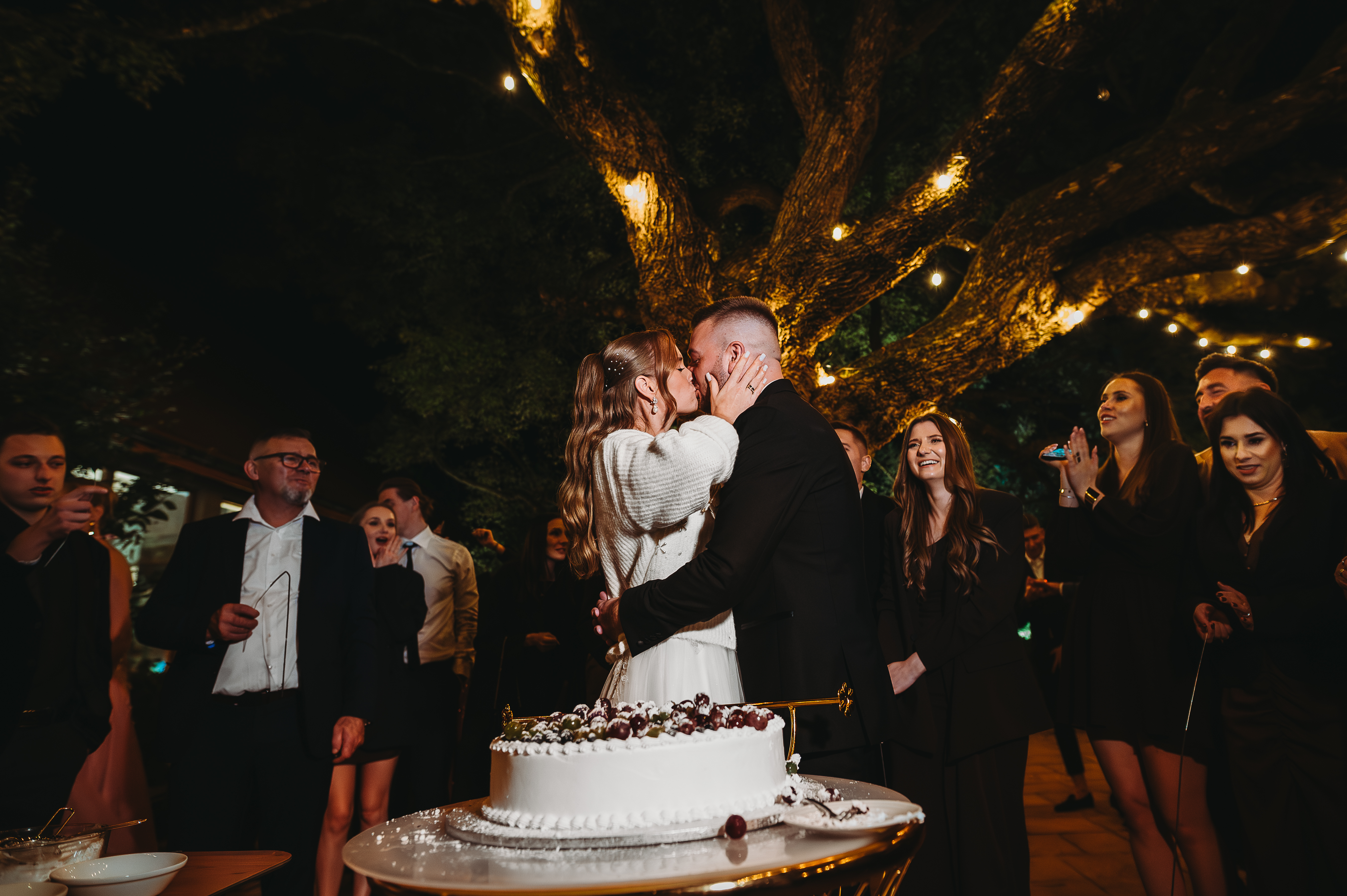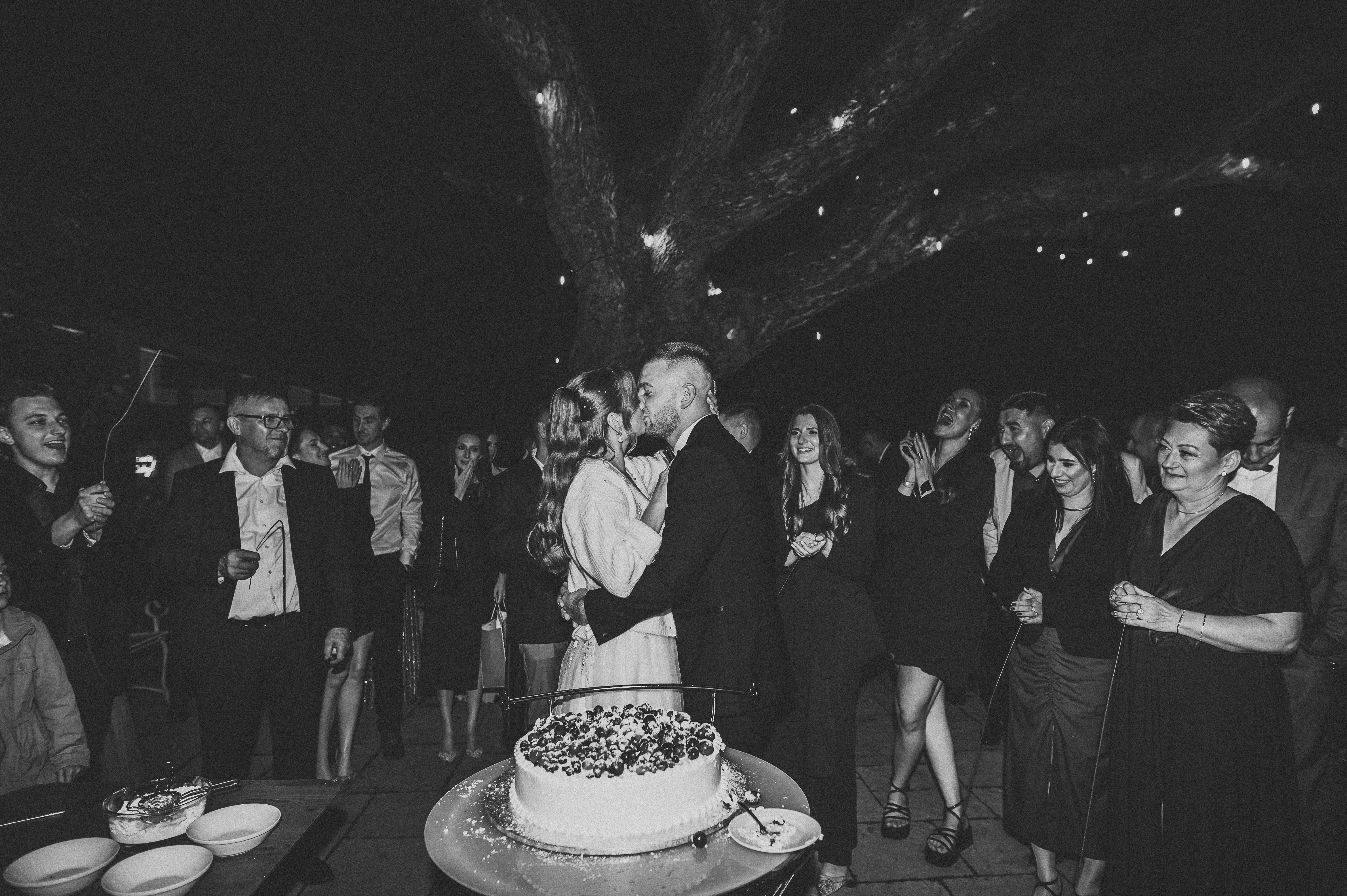 Tort weselny podany został na zewnątrz, gdzie chwilę później DJ spełnił marzenie młodszych gości i… puścił trochę klubowej muzyki na patio 🎧💥. Powstała spontaniczna mini-impreza pod gołym niebem — idealny przerywnik pełen dobrej zabawy.