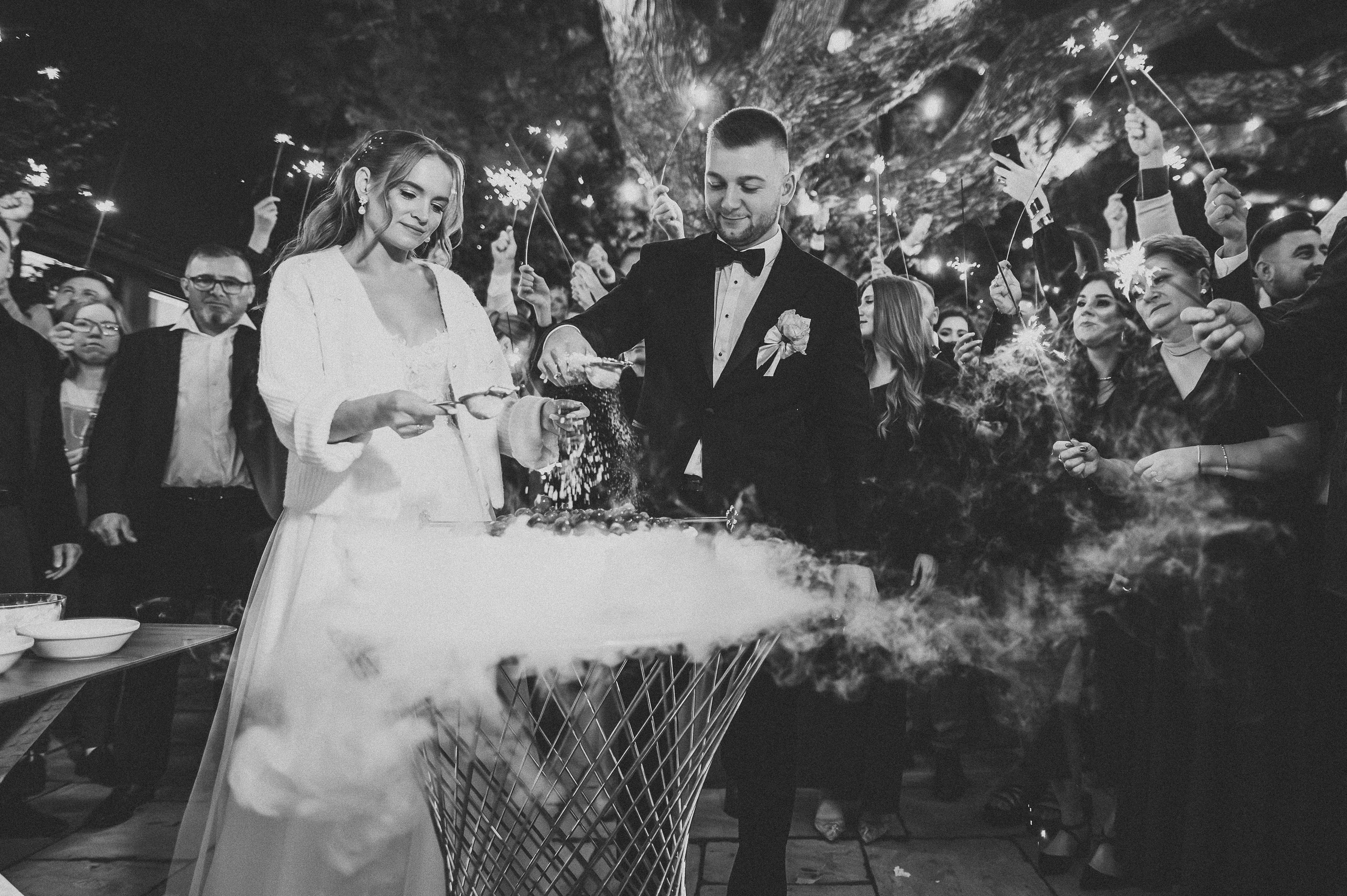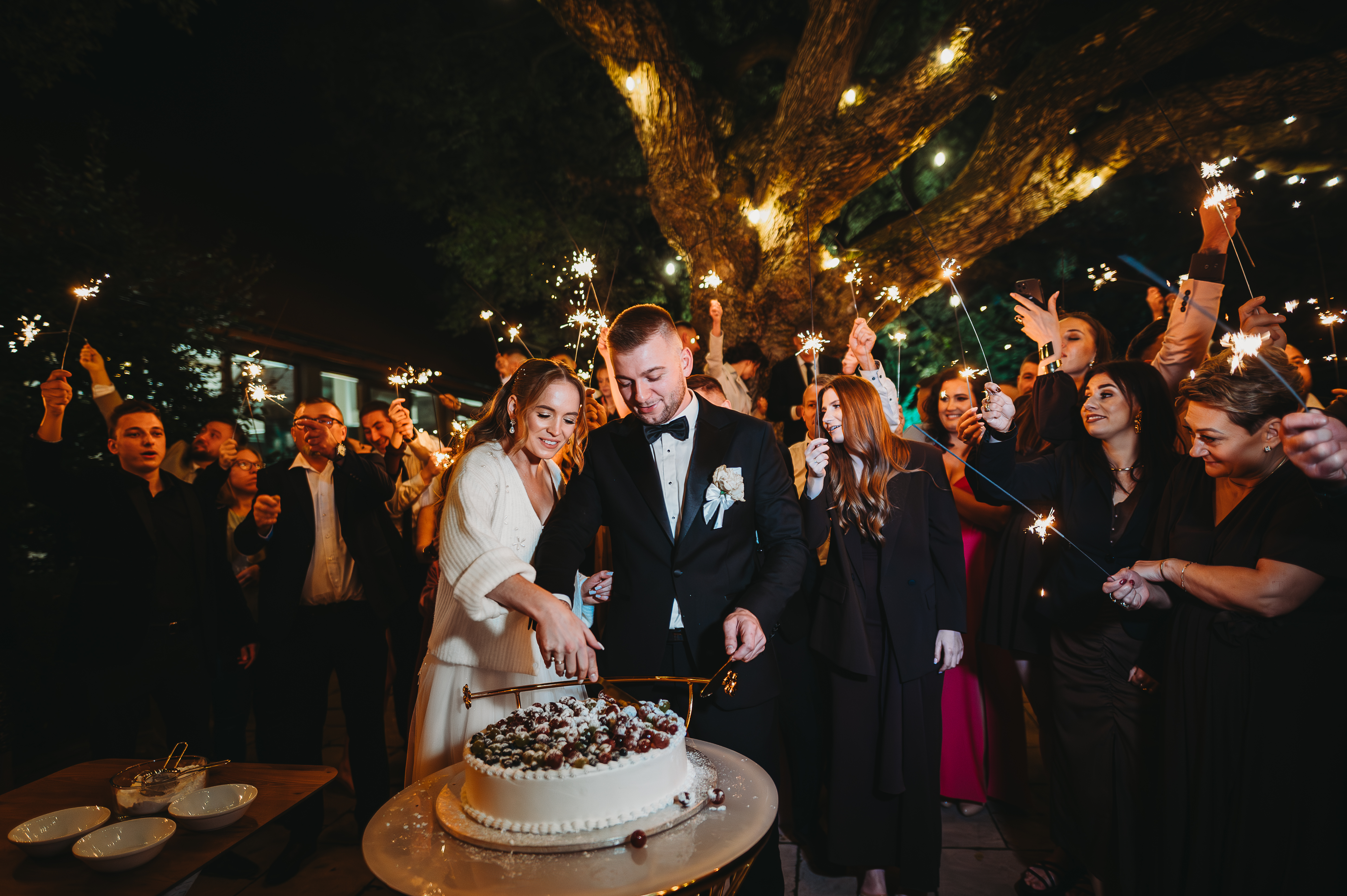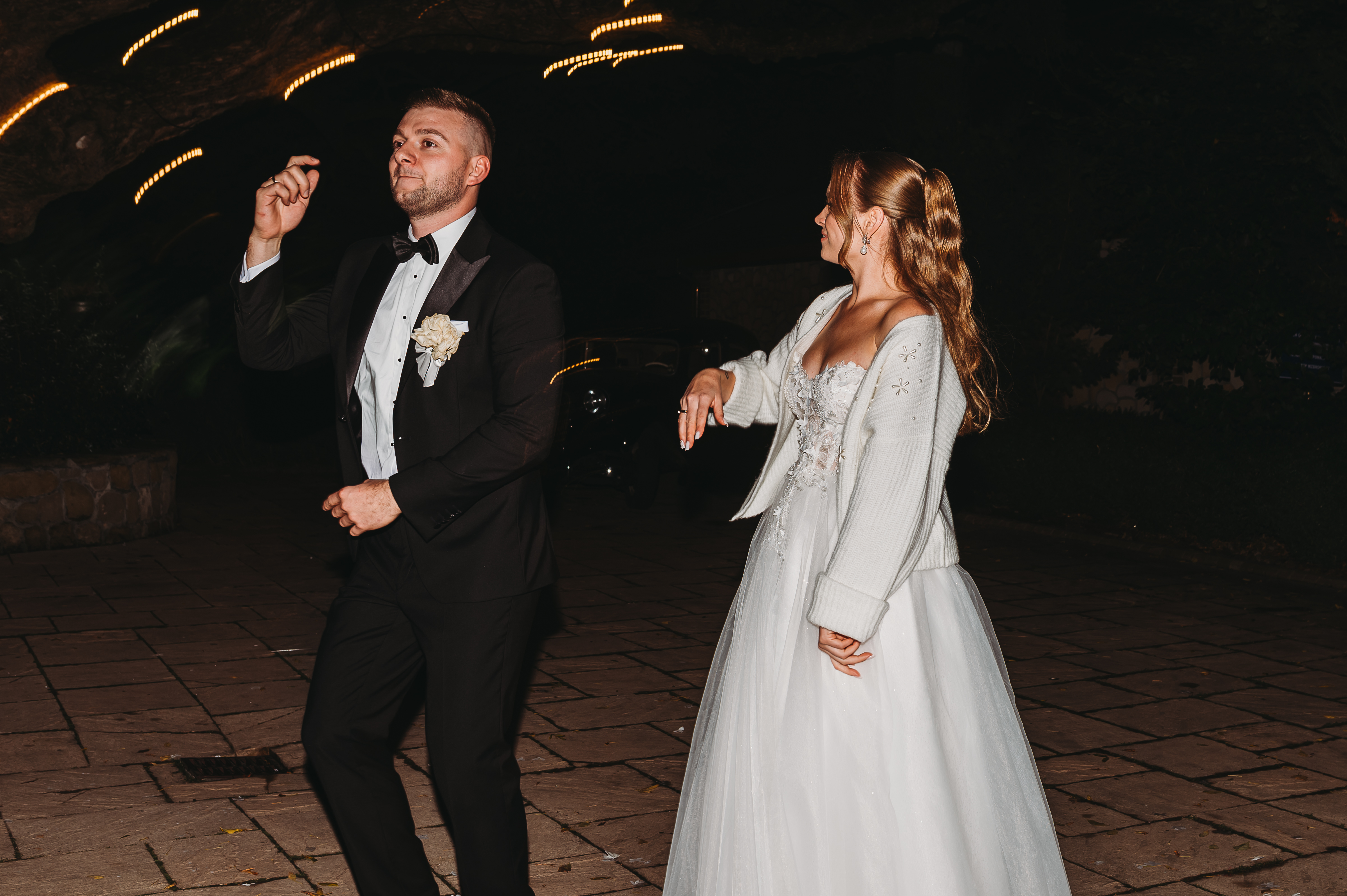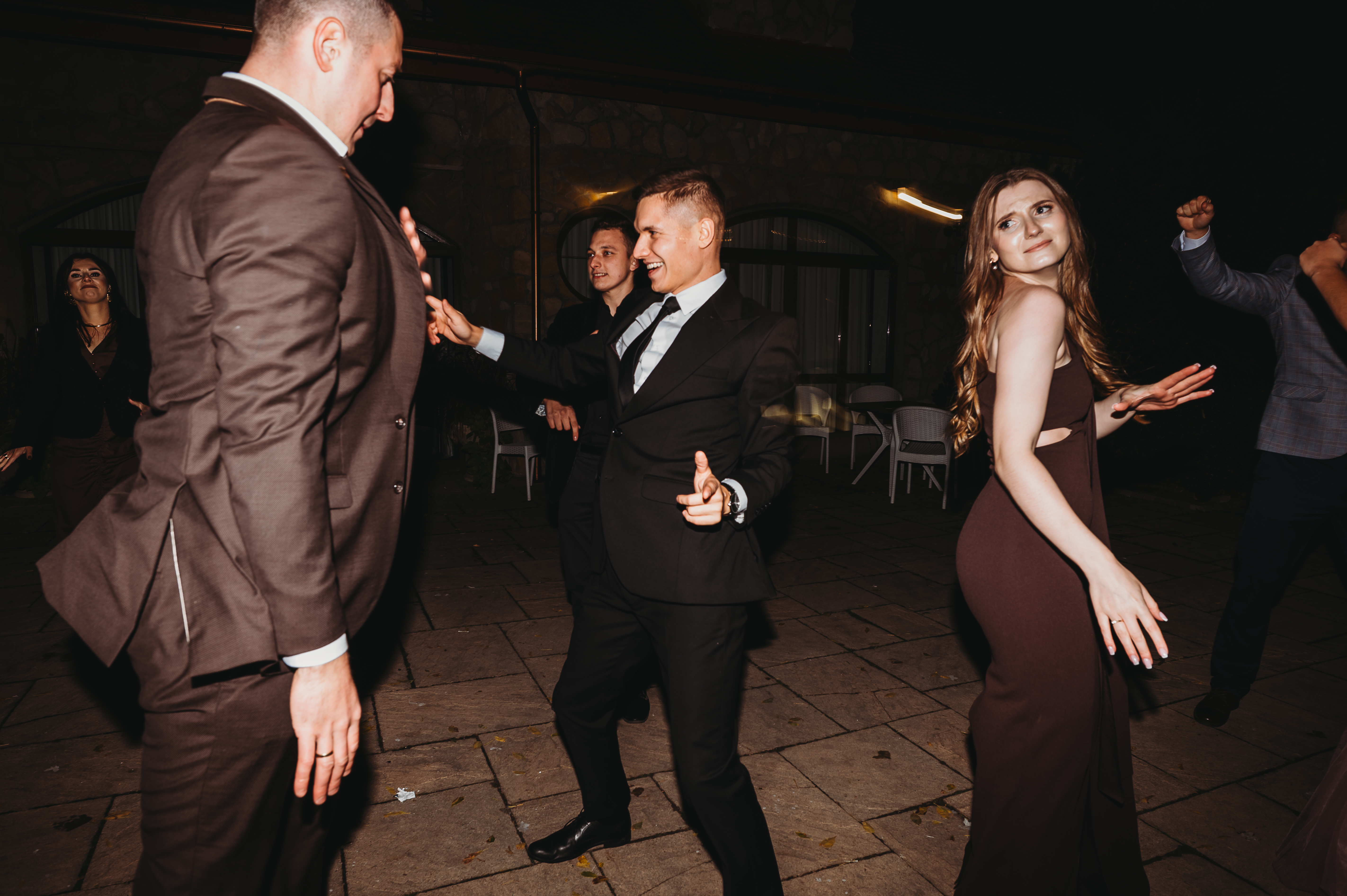 Tort weselny podany został na zewnątrz, gdzie chwilę później DJ spełnił marzenie młodszych gości i… puścił trochę klubowej muzyki na patio 🎧💥. Powstała spontaniczna mini-impreza pod gołym niebem — idealny przerywnik pełen dobrej zabawy.