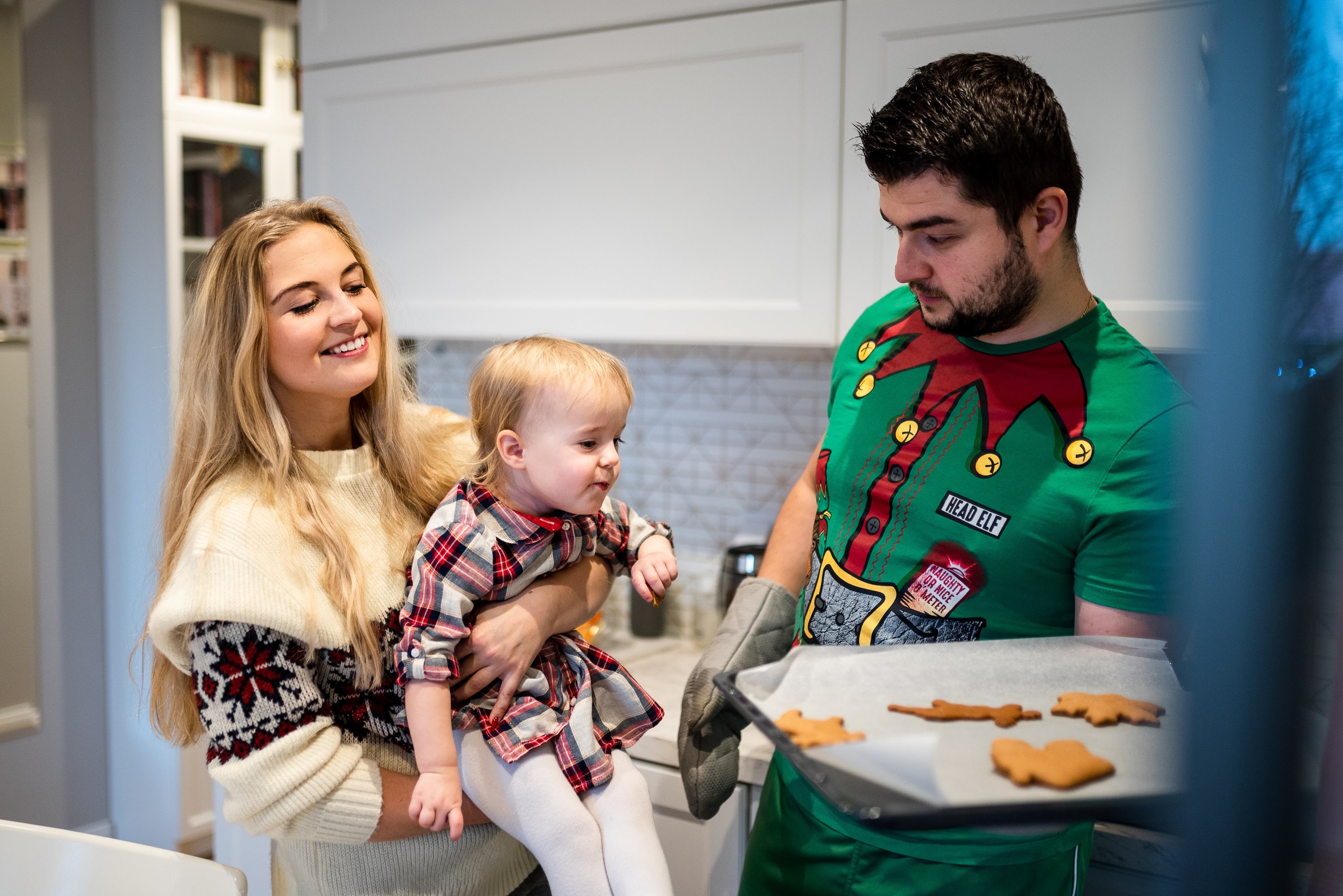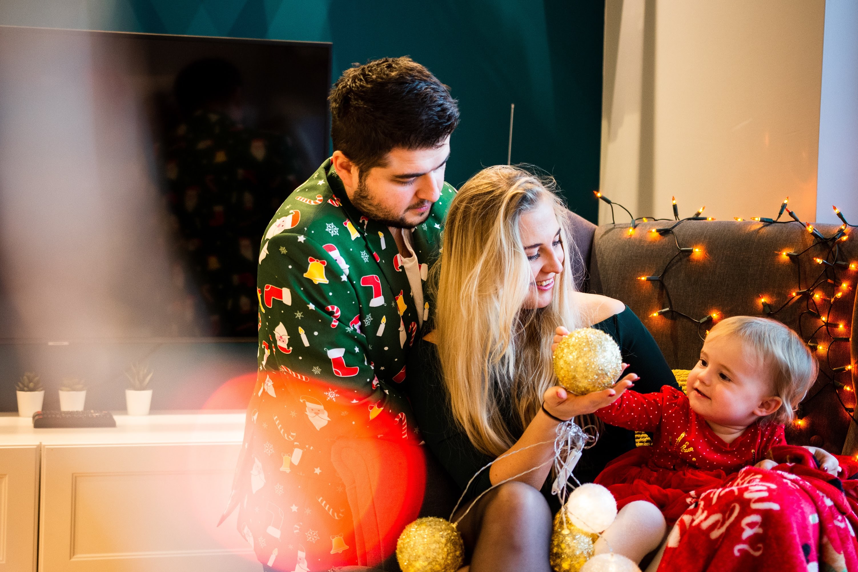 Zdjęcia Ani, Piotrka i małej Lili które możecie zobaczyć poniżej to właśnie przykład sesji, którą wykonaliśmy u nich w domu. Spotkaliśmy się z nimi w wigilię rano, a całość zajęła nam około 1,5h. Szybko, prawda? 😊 Nawet w ferworze przedświątecznych przygotowań każdy powinien spokojnie wygospodarować taką ilość czasu. W czasie zdjęć jak zwykle postawiliśmy na naturalność – rodzice wygłupiali się i po prostu bawili z małą Lilą, która była niezwykle zainteresowana świecącym kompletem lampek choinkowych, dekorowaniem pierniczków, czy otwieraniem prezentów 😉